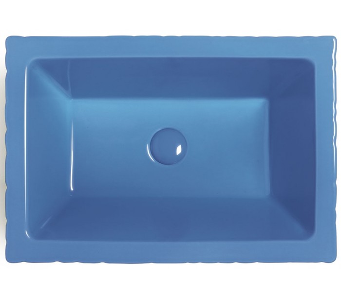 Håndvask i et moderne design, fremstillet med inderside i cyan farvet keramik og med yderside og bundventil i cyan farvet keramik. En smuk håndvask fra italienske Horganica, fremstillet i hånden og med bundventil i samme farve som vaskens yderside.