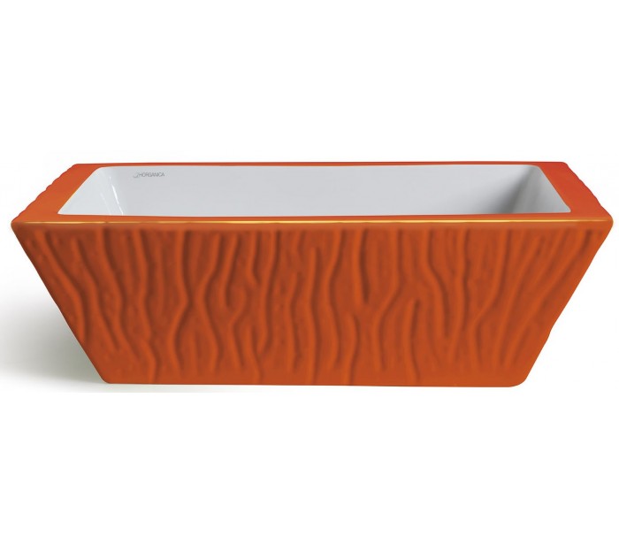 Håndvask i et moderne design, fremstillet med inderside i hvid keramik og med yderside og bundventil i orange keramik. En smuk håndvask fra italienske Horganica, fremstillet i hånden og med bundventil i samme farve som vaskens yderside.