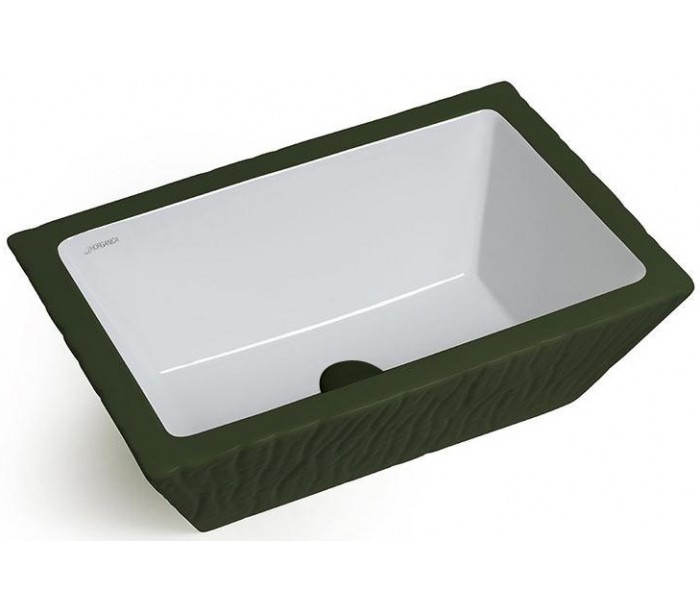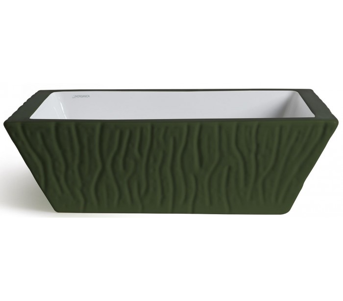 Håndvask i et moderne design, fremstillet med inderside i hvid keramik og med yderside og bundventil i mat engelsk grøn keramik. En smuk håndvask fra italienske Horganica, fremstillet i hånden og med bundventil i samme farve som vaskens yderside.