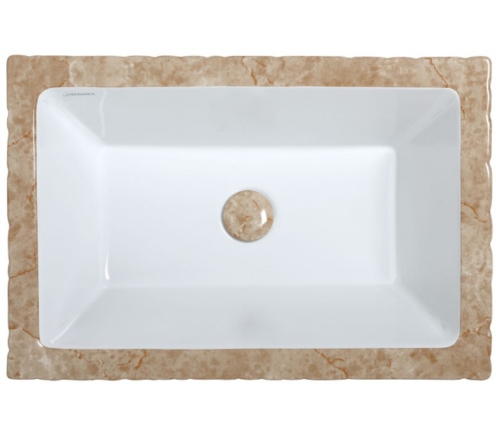 Håndvask i et moderne design, fremstillet med inderside i hvid keramik og med yderside og bundventil i travertin farvet keramik. En smuk håndvask fra italienske Horganica, fremstillet i hånden og med bundventil i samme farve som vaskens yderside.