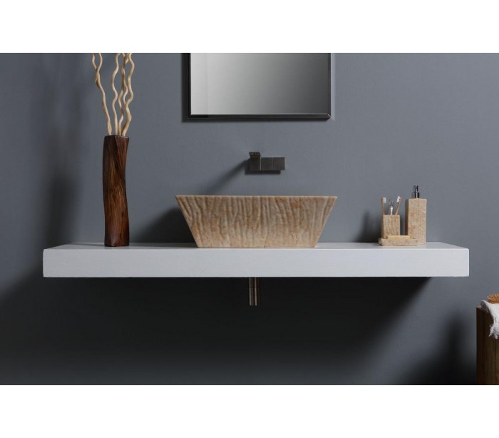 Håndvask i et moderne design, fremstillet med inderside i travertin farvet keramik og med yderside og bundventil i travertin farvet keramik. En smuk håndvask fra italienske Horganica, fremstillet i hånden og med bundventil i samme farve som vaskens yderside.