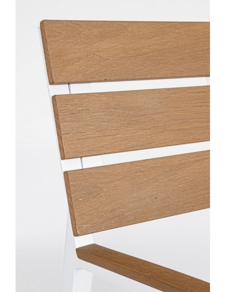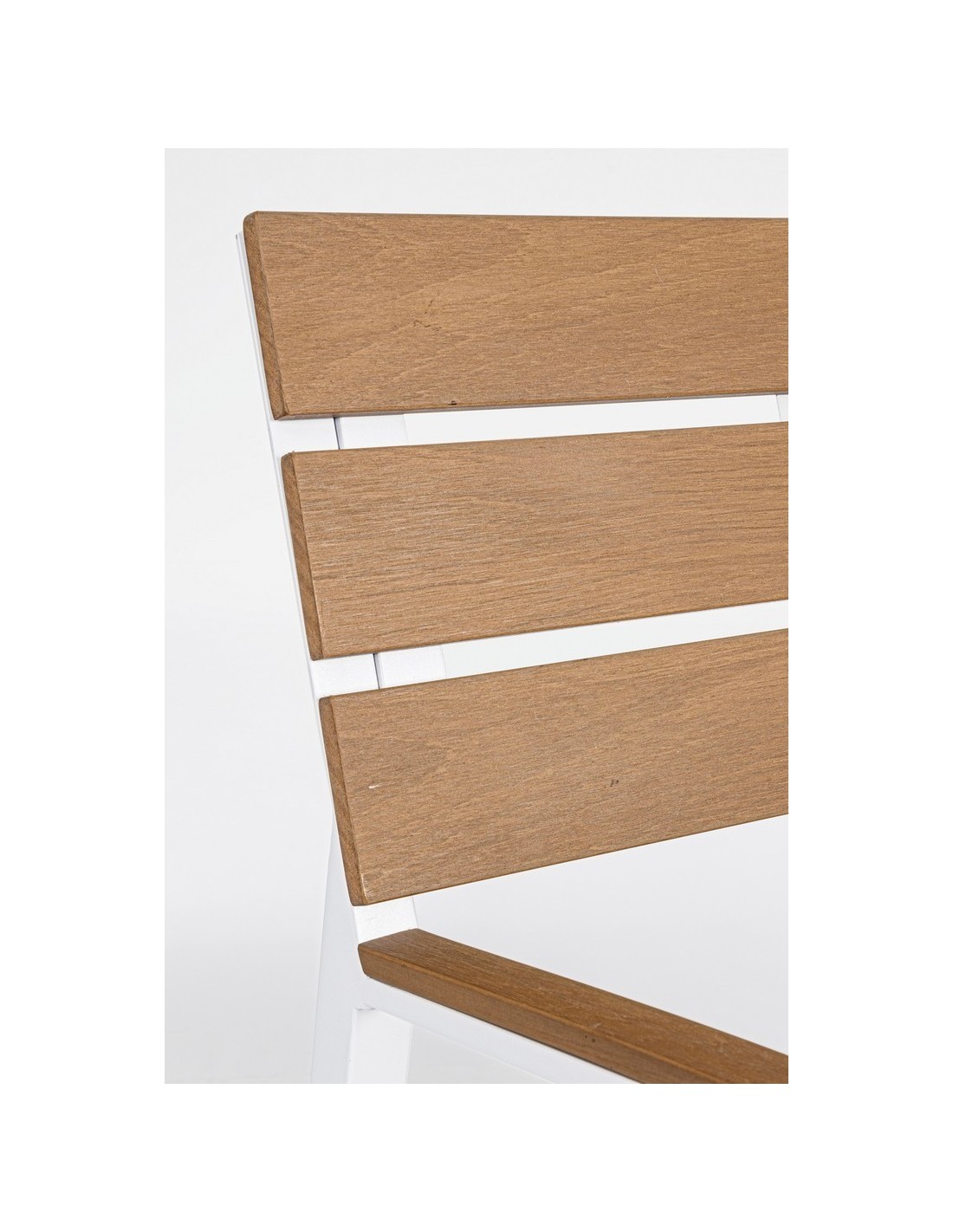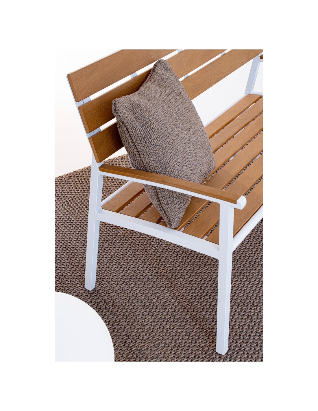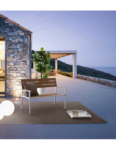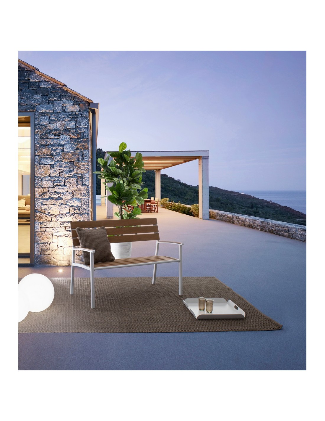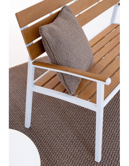 Havebænk udført i et design af hvidlakeret aluminium og naturfarvet komposit. Bænken måler 123 cm i bredden og tåler at stå ude i regnvejr.