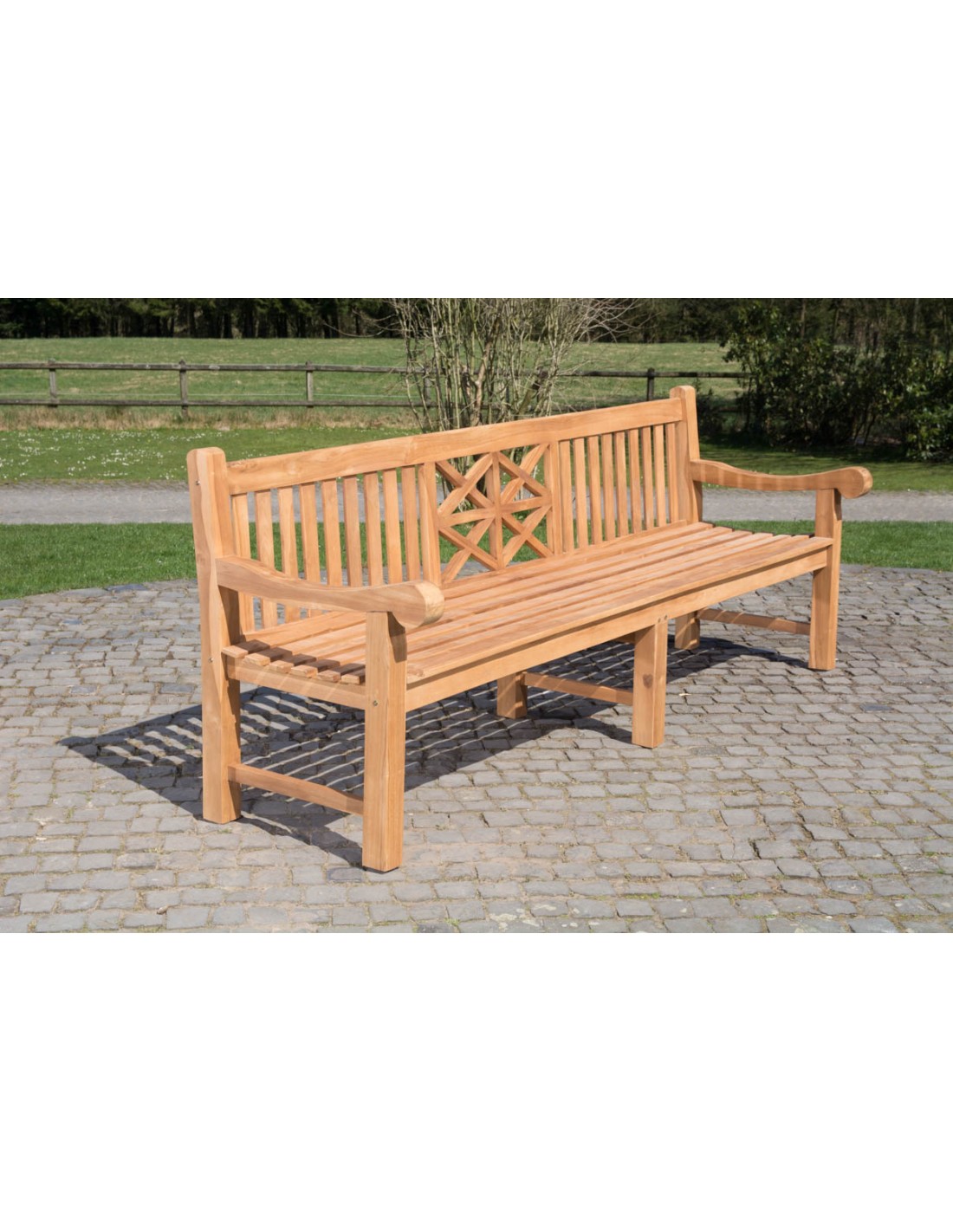 Havebænk udført i et design af teaktræ, der er naturligt resistent overfor fugt og regn. Vi anbefaler dog løbende behandling med teaktræsolie. Bænken måler 240 cm i bredden og 92 cm i højden over ryggen.