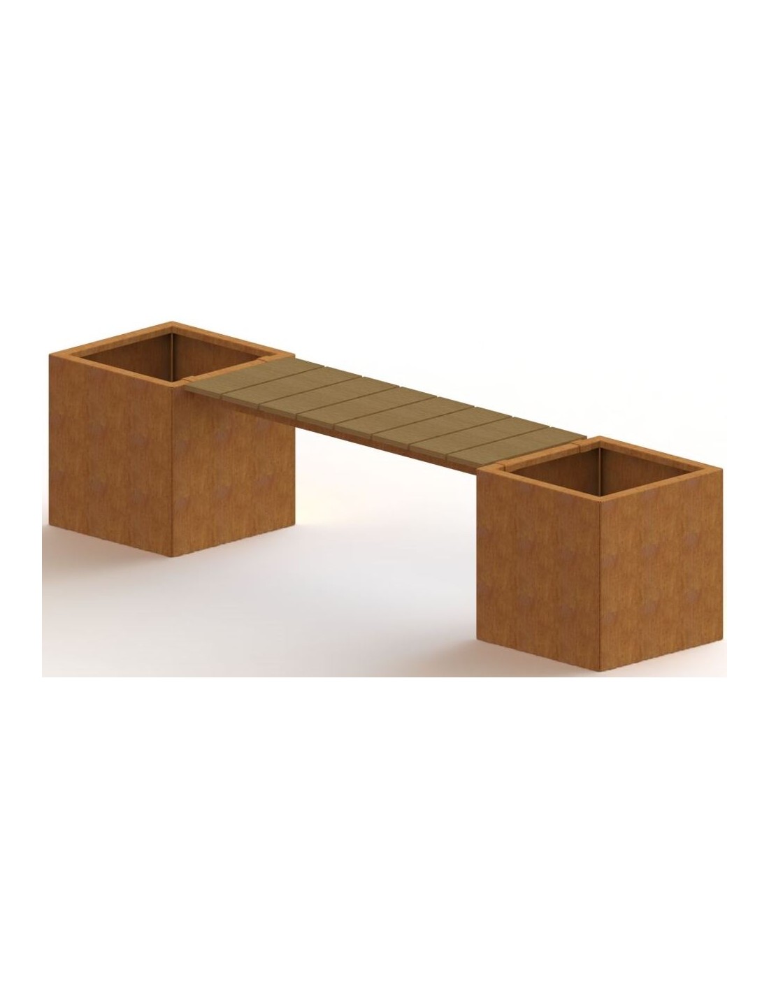 Bænkens plantekasser er lavet af Corten-A stålplade af høj kvalitet, der har den unikke egenskab, at den danner et meget tæt oxidlag (rustlag), som er umuligt at ruste igennem. På grund af det tætte oxidlag er det dybere materiale afskærmet for ilt, så oxidationen bremses betydeligt, mens korrosionen fortsætter. Bænken i cortenstål leveres urustet, i den grå metalfarve. Det brune/orange rustlag dannes inden for få uger til et par måneder og ingen behandling er påkrævet.