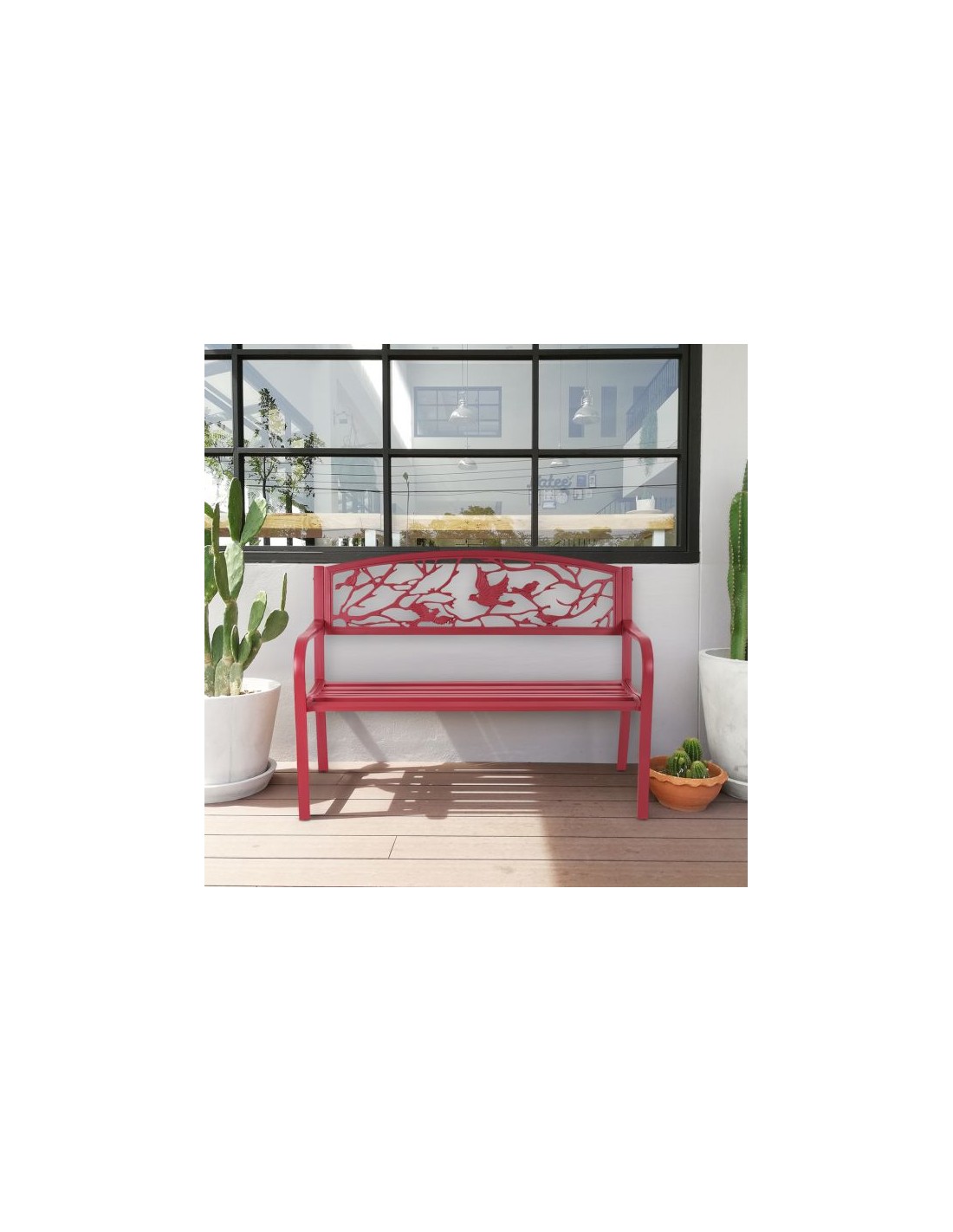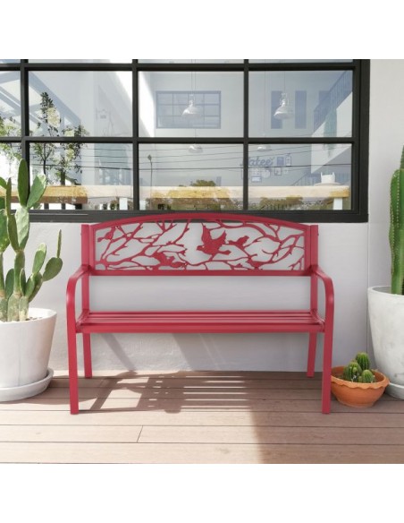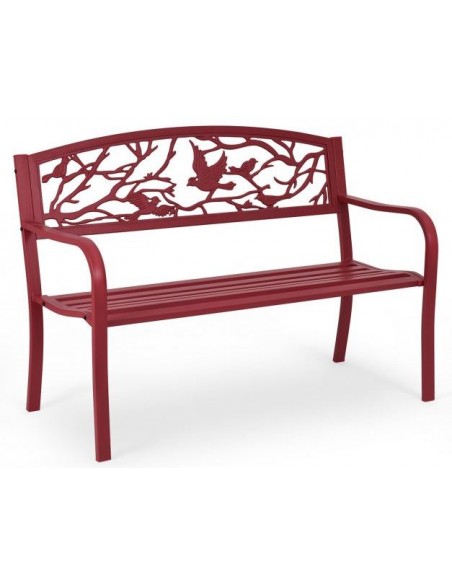 Havebænk udført i et design af rødlakeret stål. Bænken måler 87,5 cm i højden over ryggen og 123 x 59,5 cm i bredde og dybde. Siddehøjden er 39,5 cm.