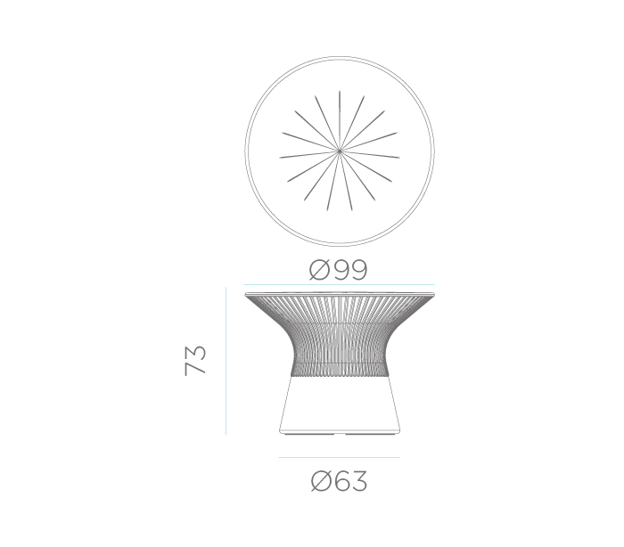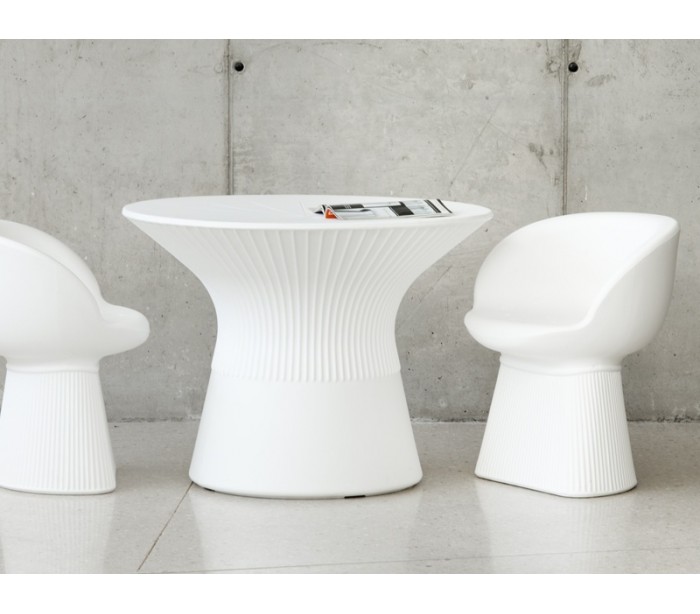 Havebord fremstillet i hvid polyethylene. Bordet måler 99 cm i diameter og 73 cm i højden.