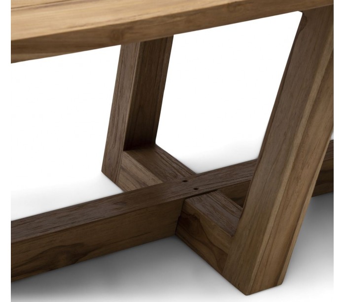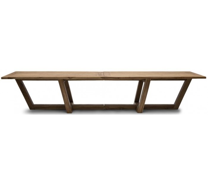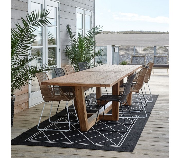 Riviera Maison havebord af teaktræ. Havebordet måler 400 x 100 cm i bredde og dybde. Teaktræ er naturligt resistent overfor fugt, men vi anbefaler løbende behandling med teaktræsolie for at holde træets glød. Ønskes bordet i en mere grålig nuance, undlades behandling blot og træet skifter nuance over årerne.