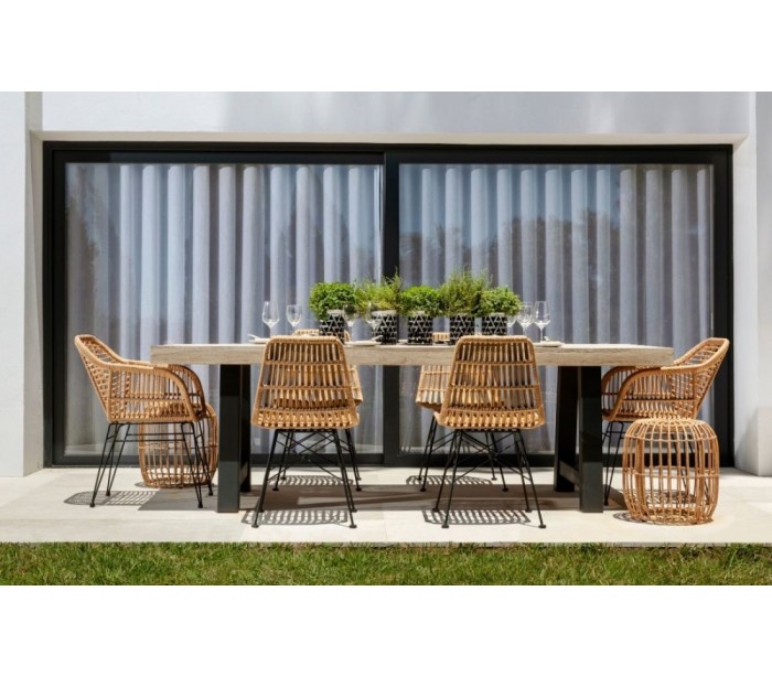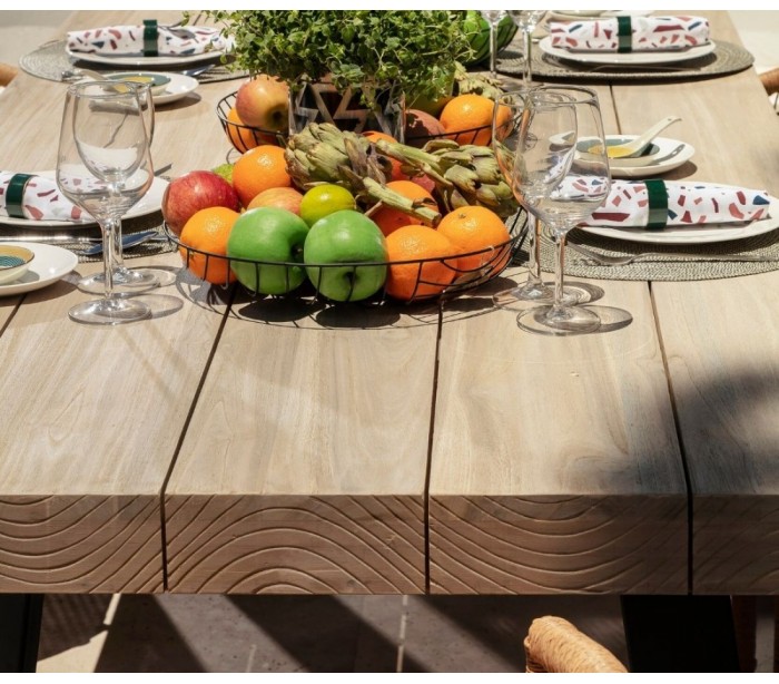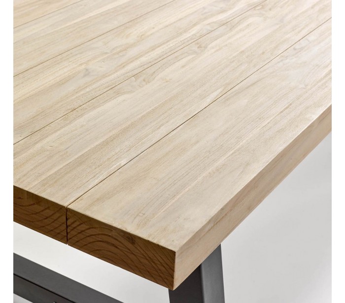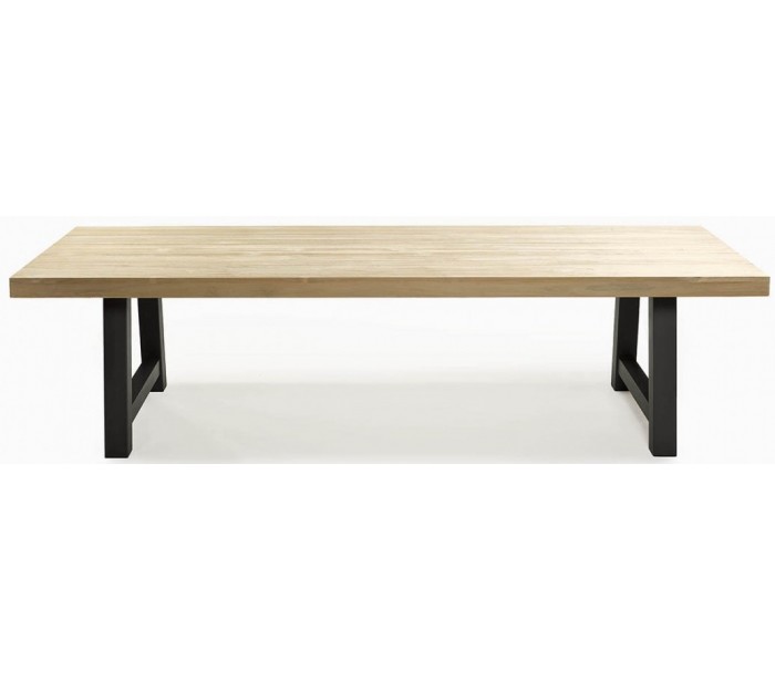 Havebord udført i et design i teaktræ og antracitlakeret aluminium. Havebordet måler 300 x 110 cm i bredde og dybde og 76 cm i højden. Teaktræ er naturligt resistent overfor fugt, men vi anbefaler løbende behandling med teaktræsolie.
