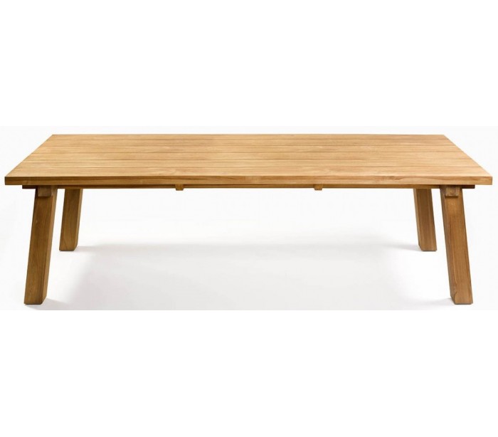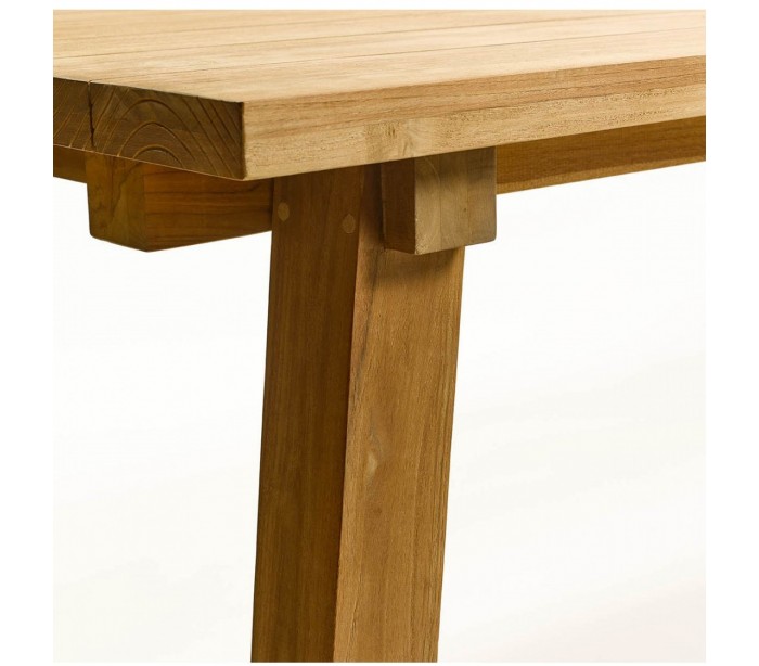 Havebord udført i et design i teaktræ. Havebordet måler 260 x 105 cm i bredde og dybde og 75 cm i højden. Teaktræ er naturligt resistent overfor fugt, men vi anbefaler løbende behandling med teaktræsolie.