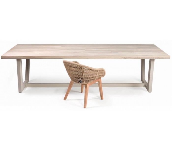 Havebord udført i et design i teaktræ og taupelakeret aluminium. Havebordet måler 300 x 110 cm i bredde og dybde og 76 cm i højden. Teaktræ er naturligt resistent overfor fugt, men vi anbefaler løbende behandling med teaktræsolie.
