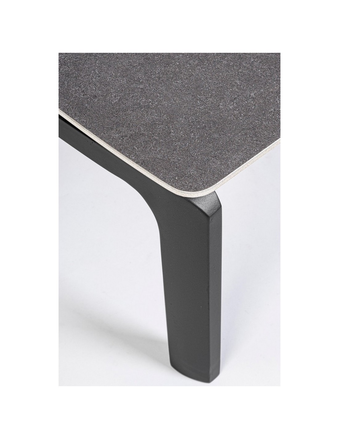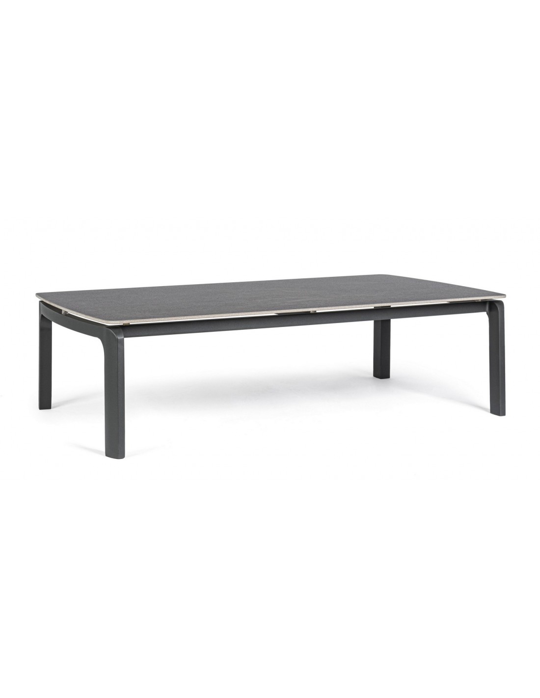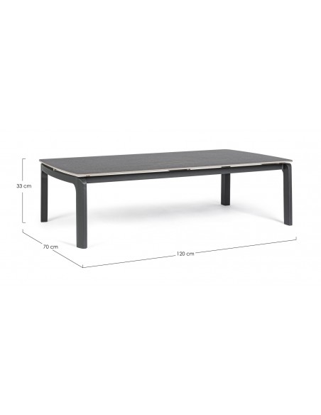 Loungebord i et design af charcoal pulverlakeret aluminium og med bordplade i keramik med stengrå effekt. Bordet måler 33 cm i højden og 120 x 70 cm i bredde og dybde.