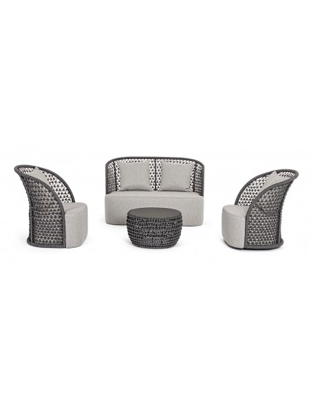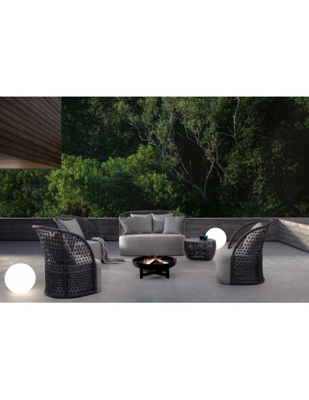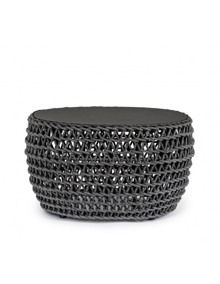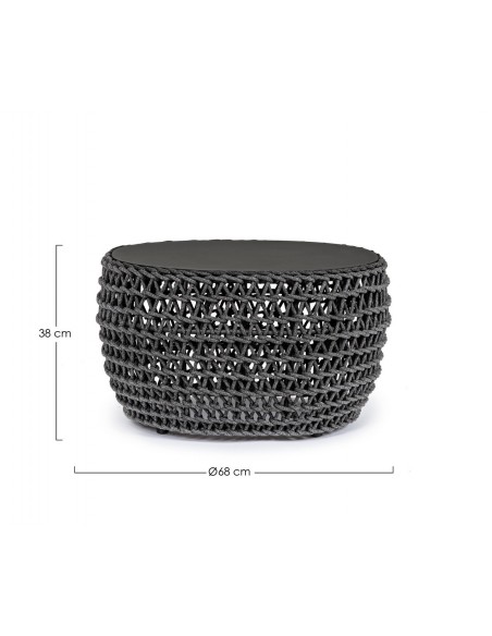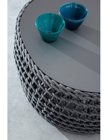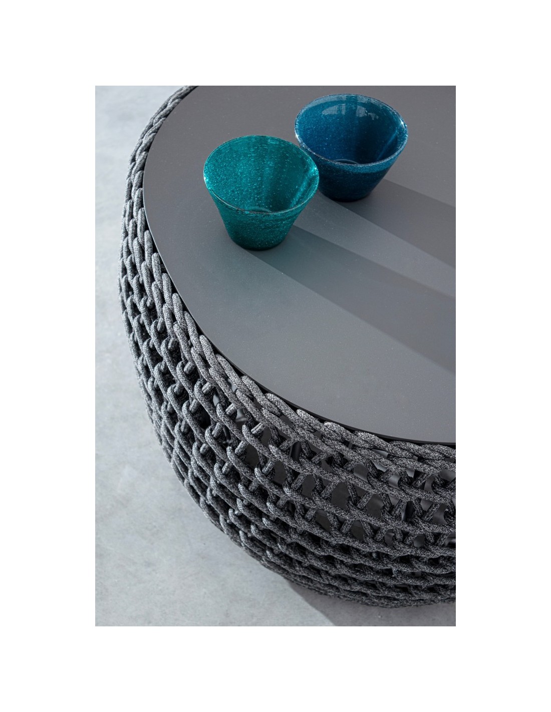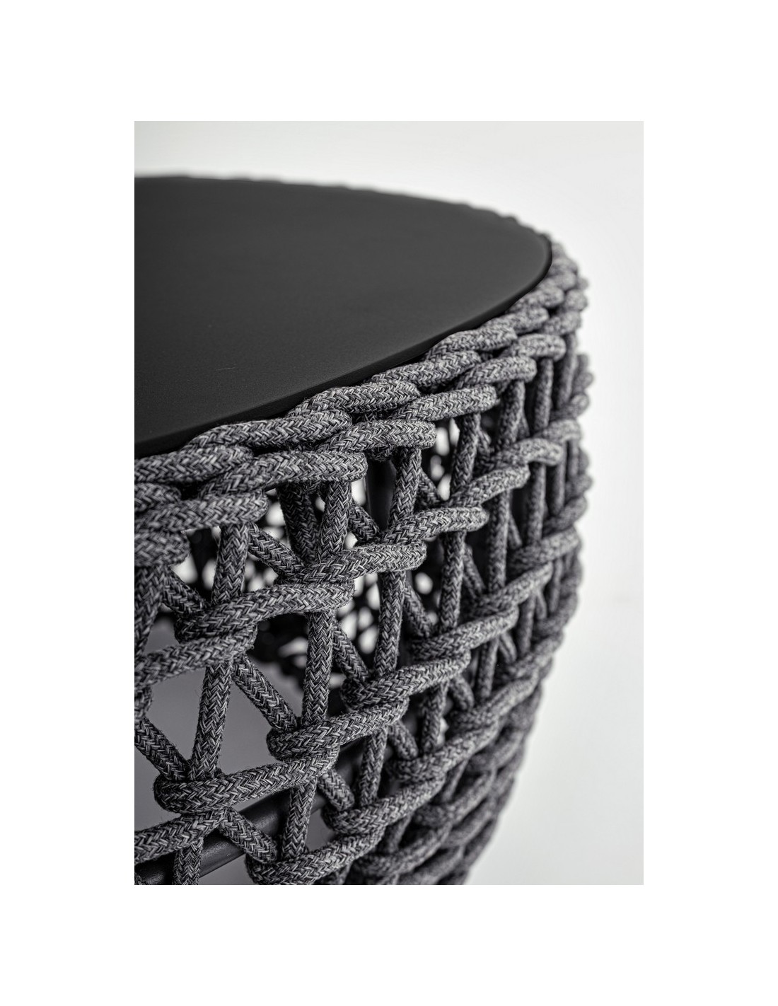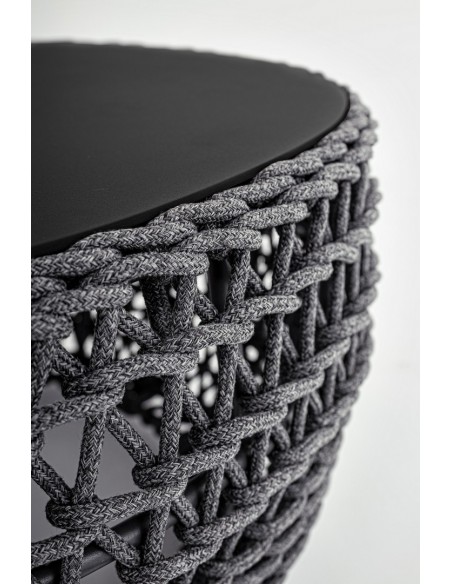 Loungebord udført i et design af aluminium betrukket med UV resistent og vandafvisende reb. Bordpladen er i aluminium. Bordet måler 64 cm i diameter. Møblet tåler regnvejr.