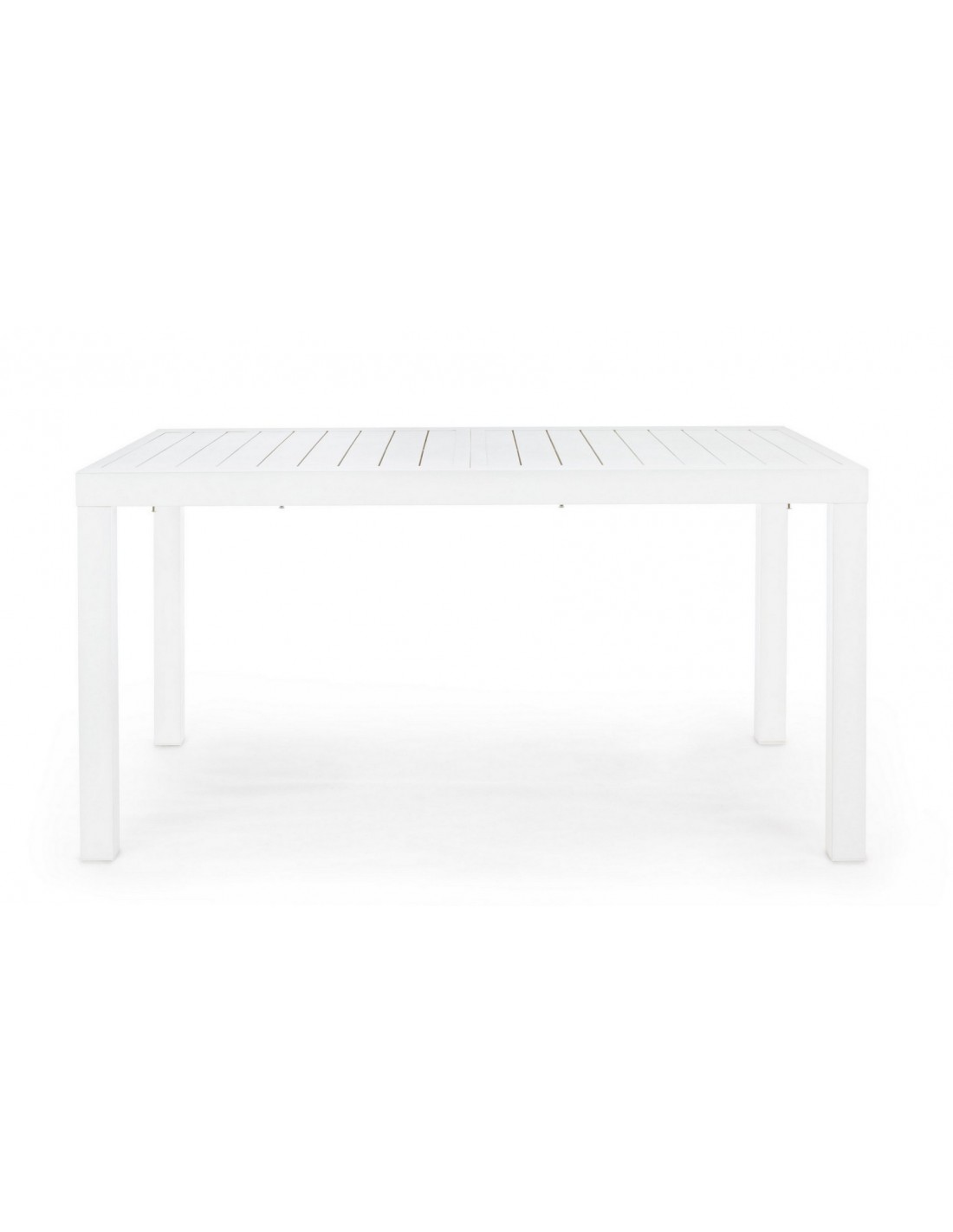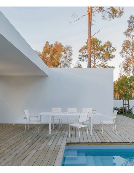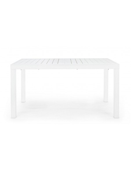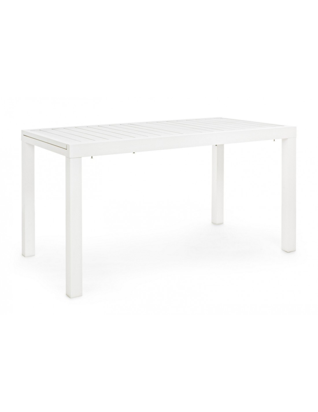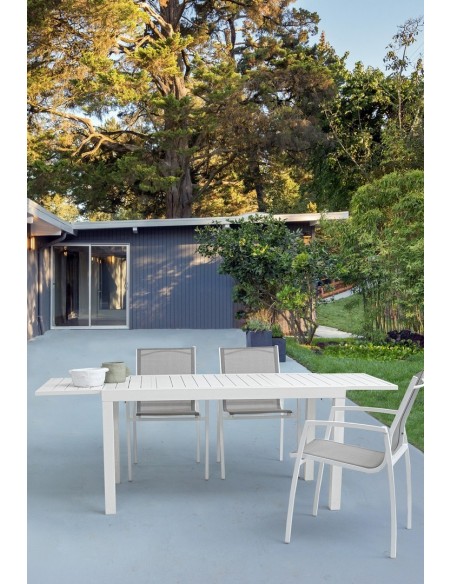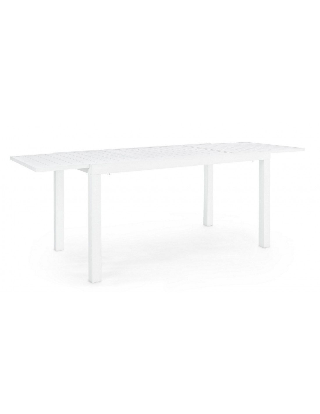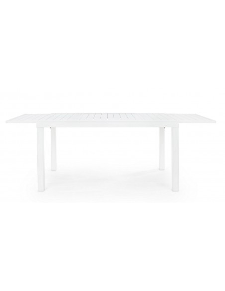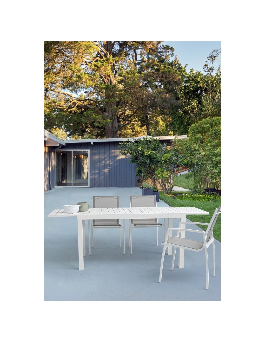 Havebord med udtræk, udført i et design af hvid pulverlakeret aluminium. Bordet måler 75 cm i højden og 140 - 210 x 77 cm i bredde og dybde.
