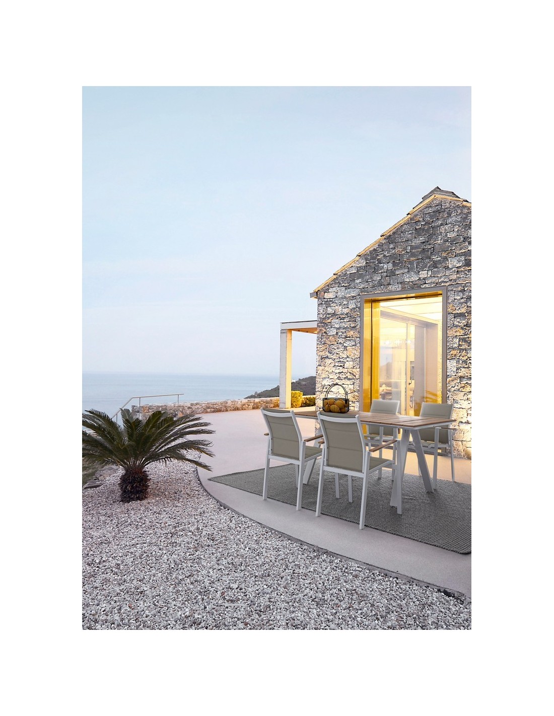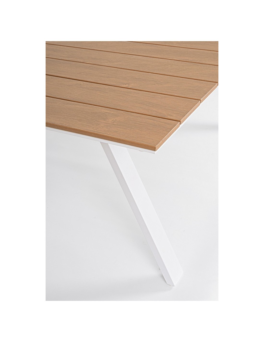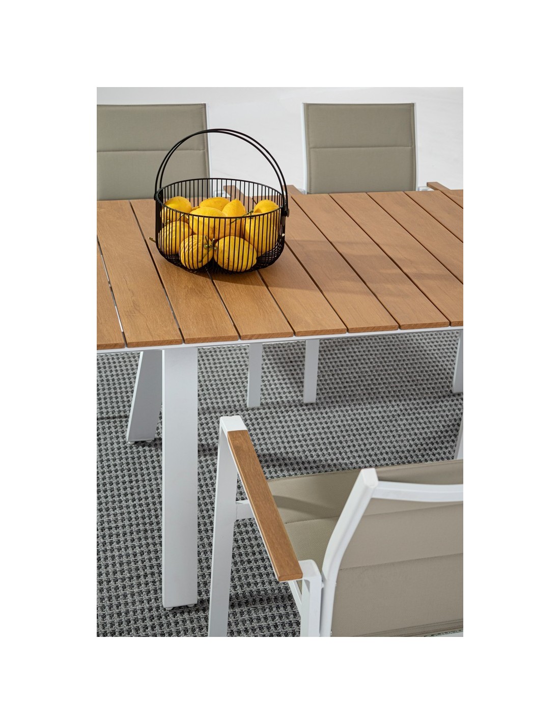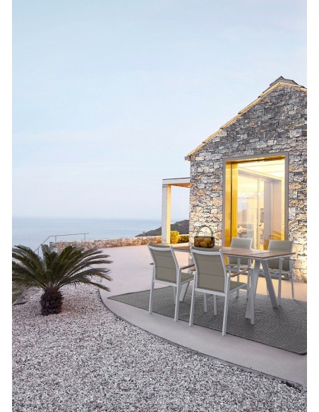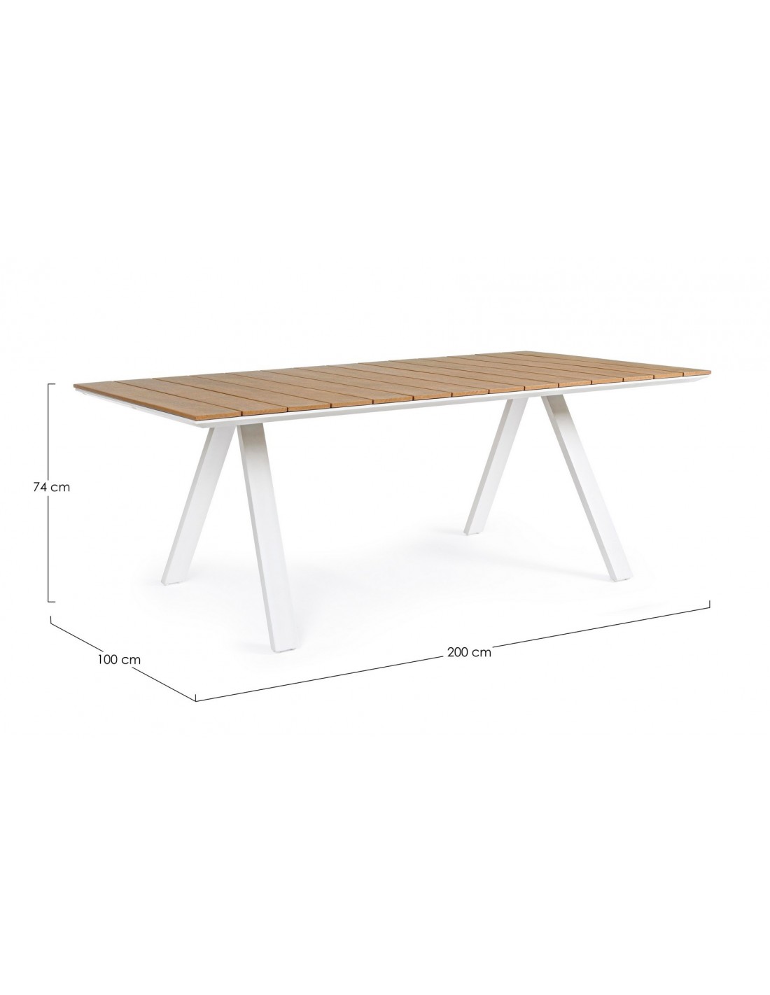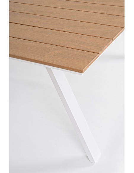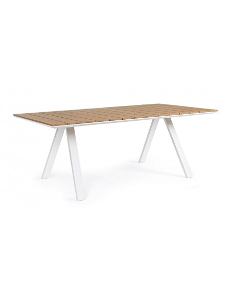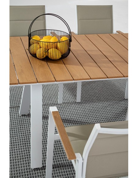 Havebord udført i et design af hvid pulverlakeret aluminium og med bordplade i komposit med udseende af teaktræ. Bordet måler 74 cm i højden og 200 x 100 cm i bredde og dybde.