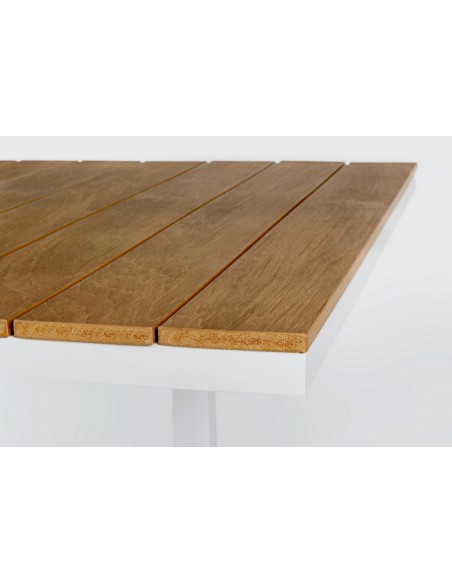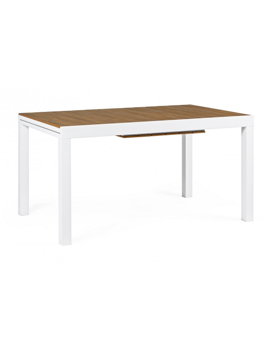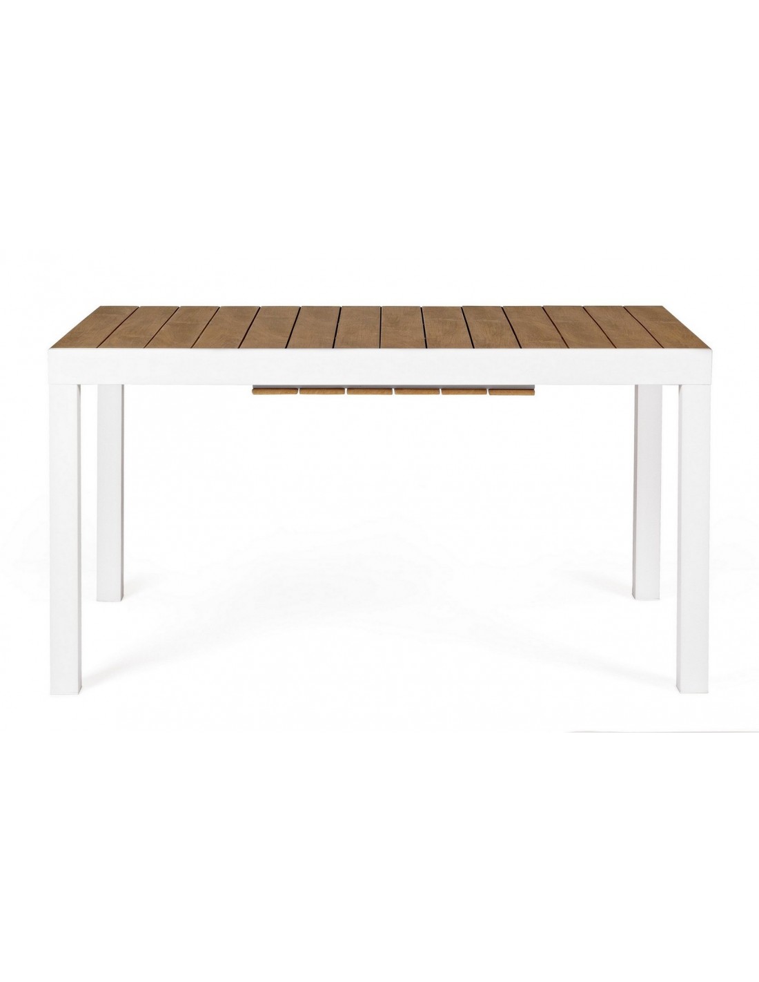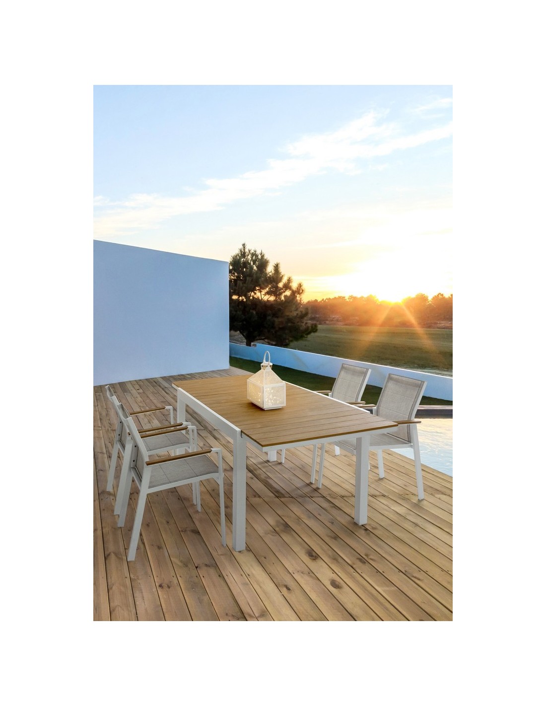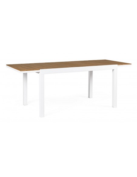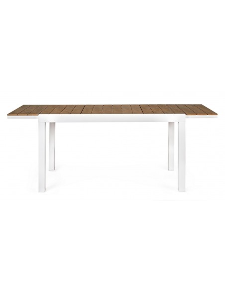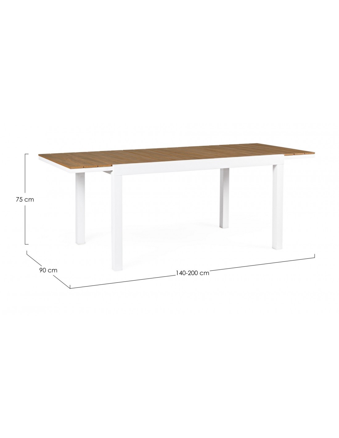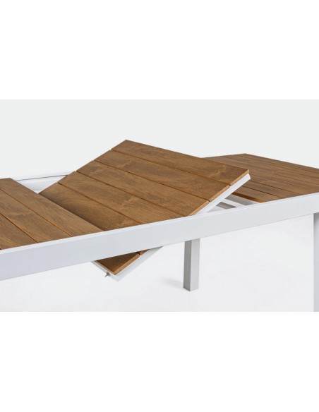Havebord med udtræk, udført i et design af hvid pulverlakeret aluminium og teaktræsfarvet komposit. Bordet måler 75 cm i højden og 140 - 200 x 90 cm i bredde og dybde.