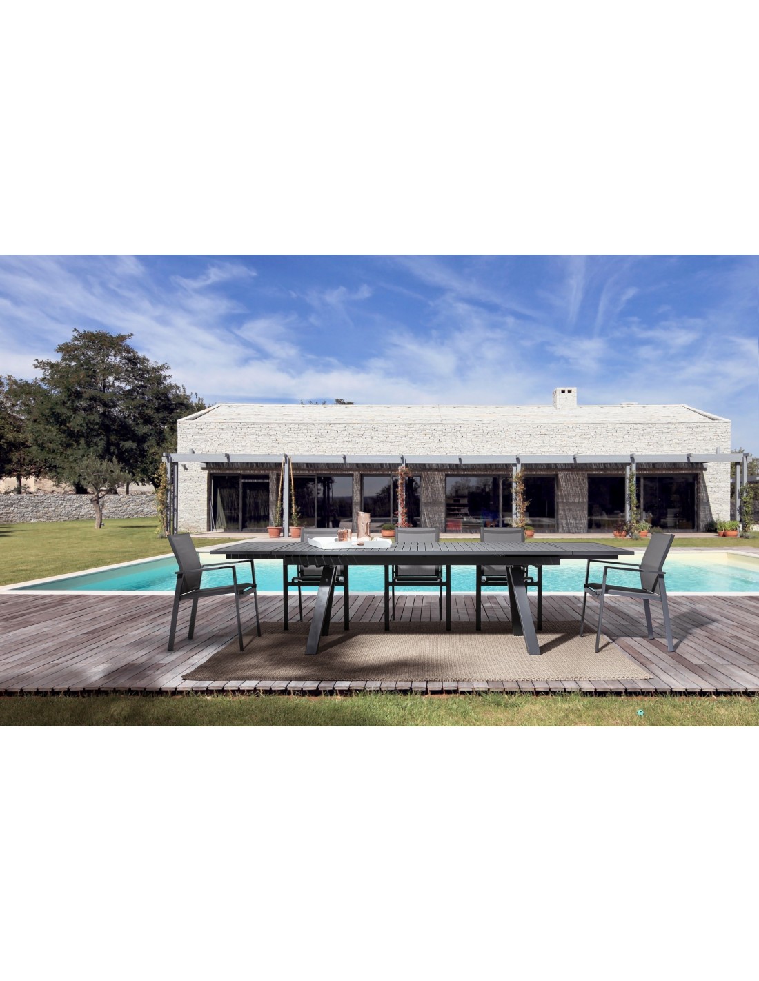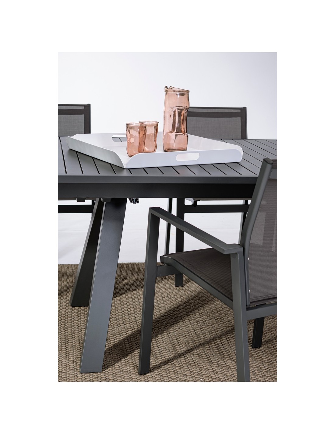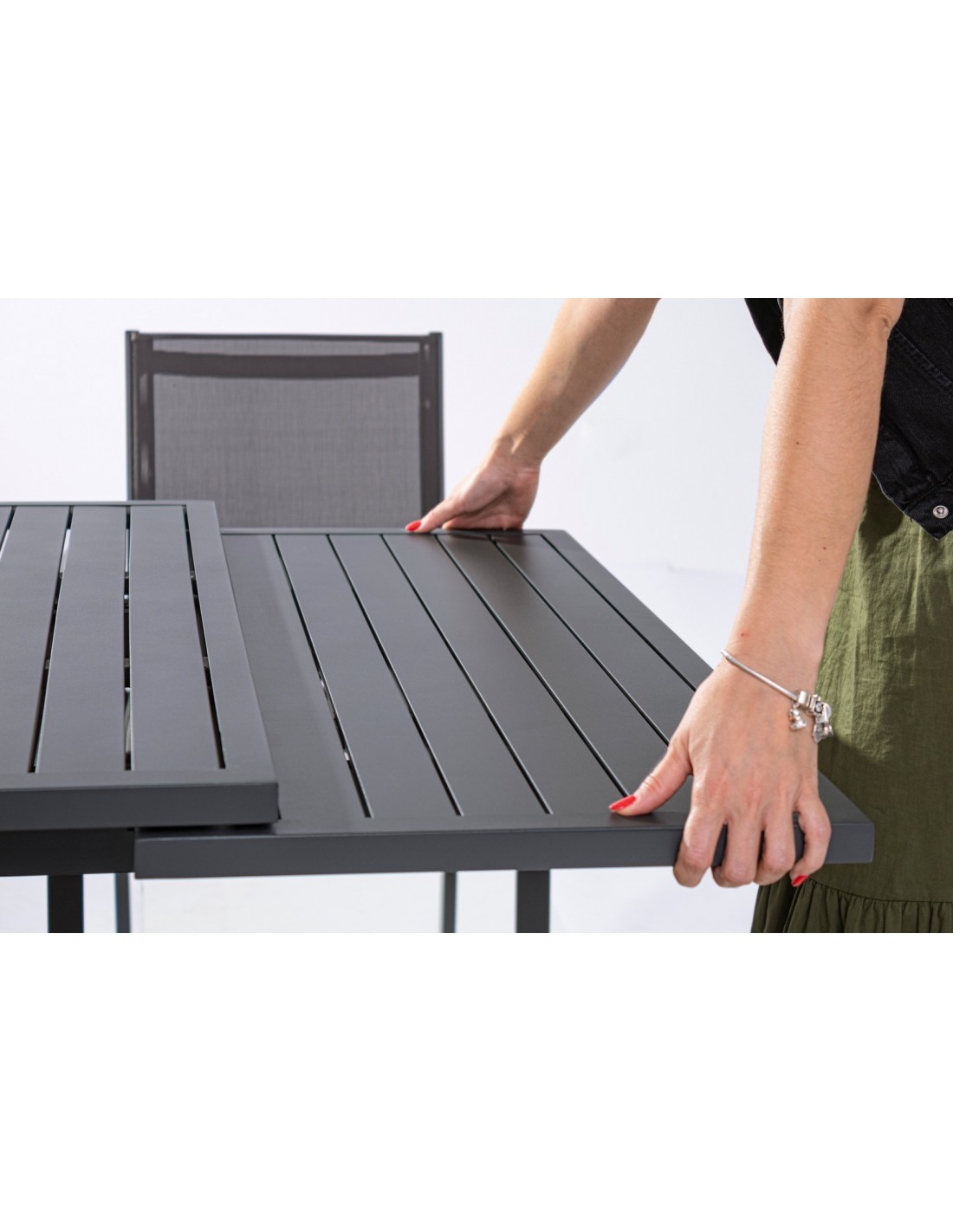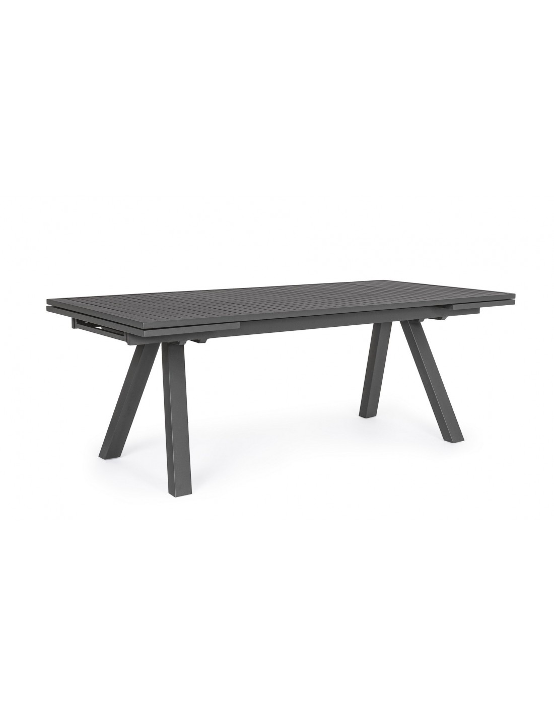 Havebord med udtræk, udført i et design af charcoal pulverlakeret aluminium. Bordet måler 75 cm i højden og 206 - 251 - 296 x 100 cm i bredde og dybde.