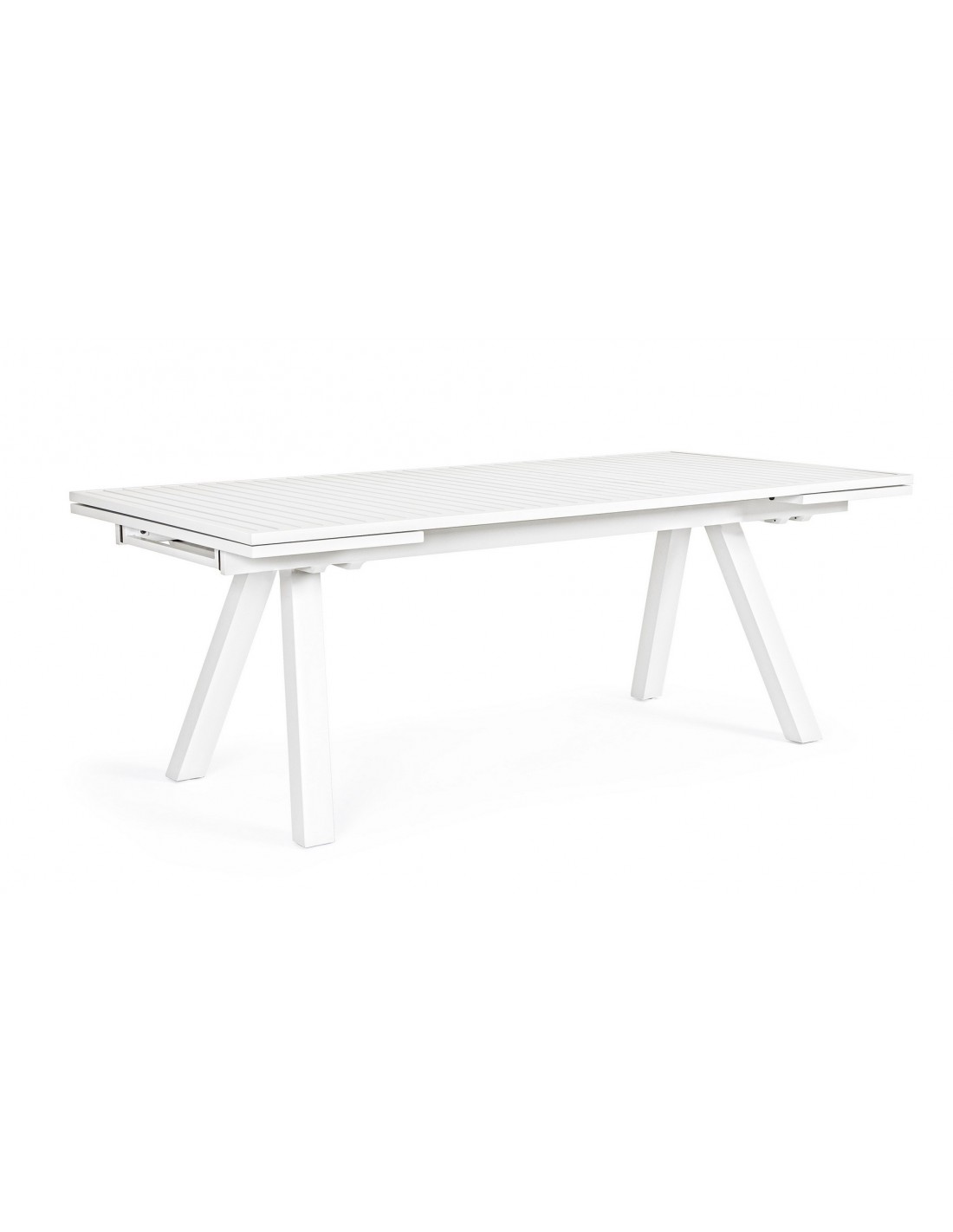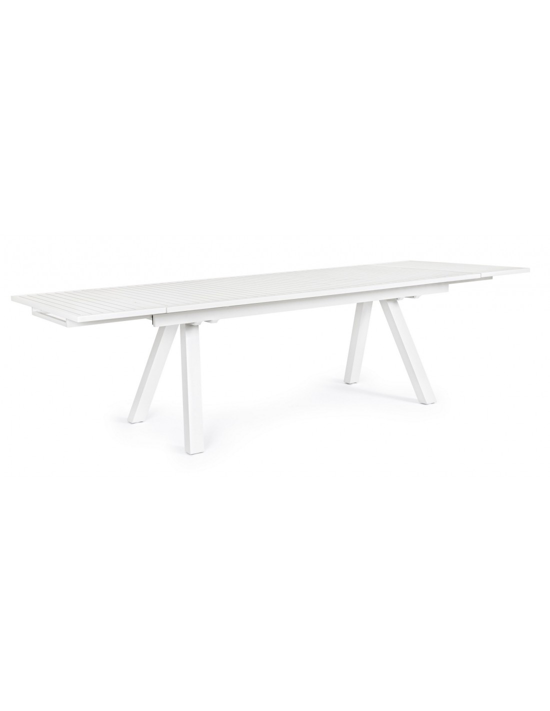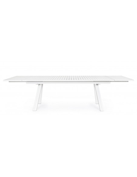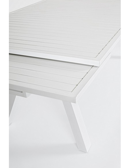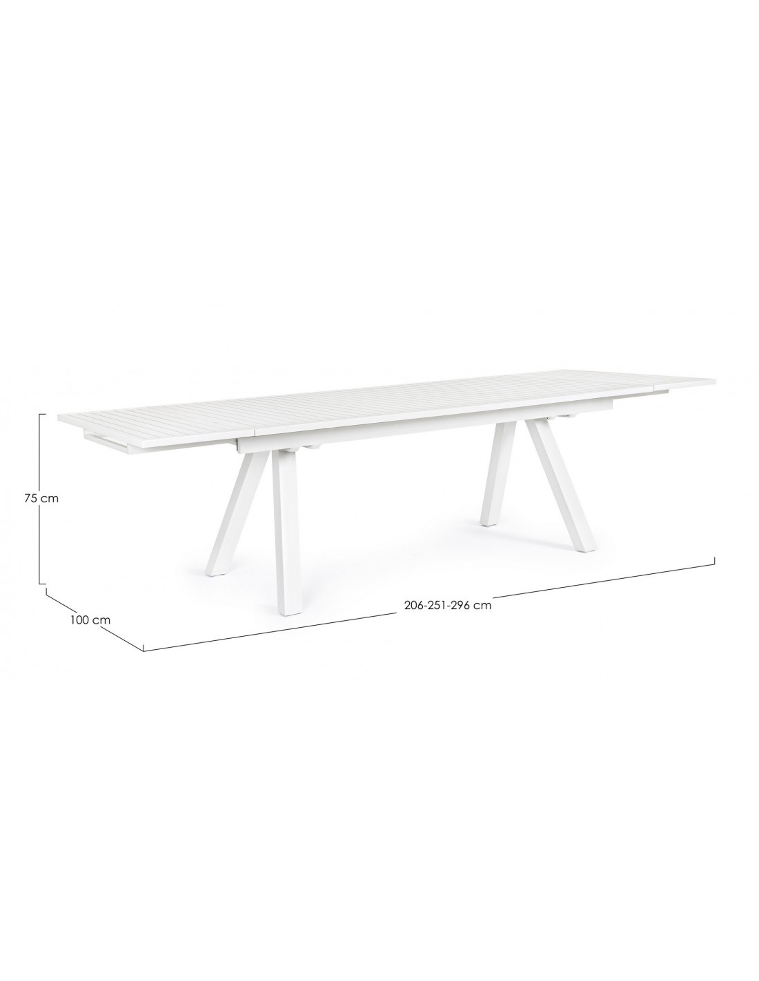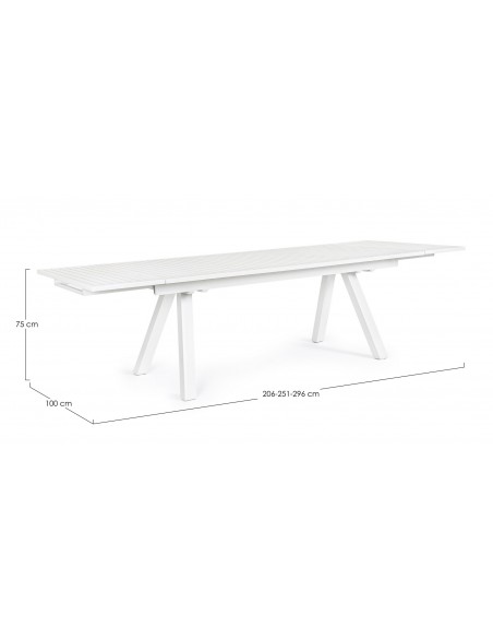 Havebord med udtræk, udført i et design af hvid pulverlakeret aluminium. Bordet måler 75 cm i højden og 206 - 251 - 296 x 100 cm i bredde og dybde.