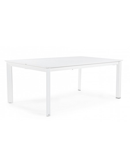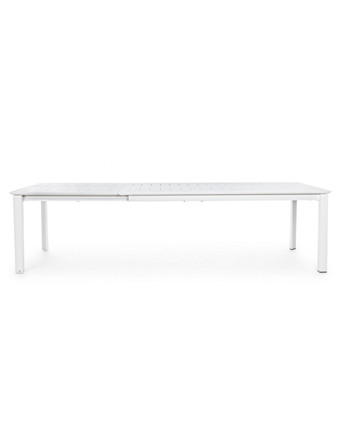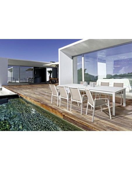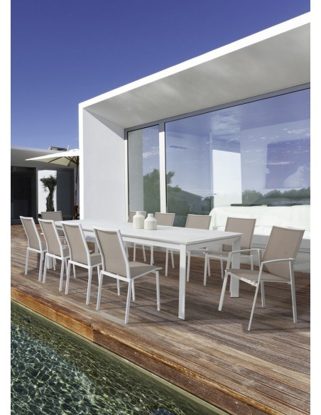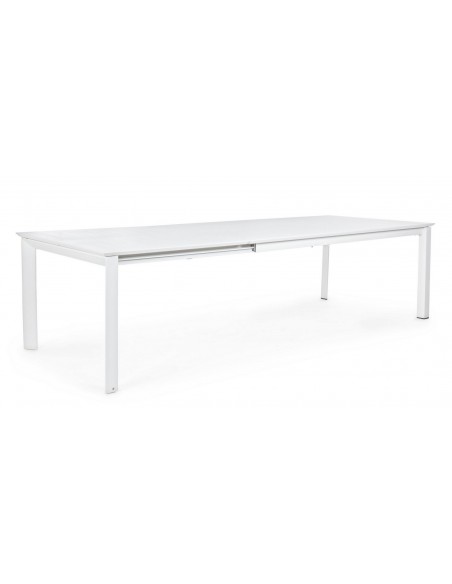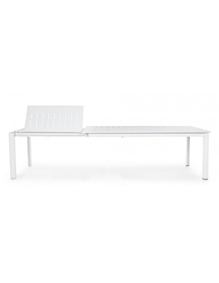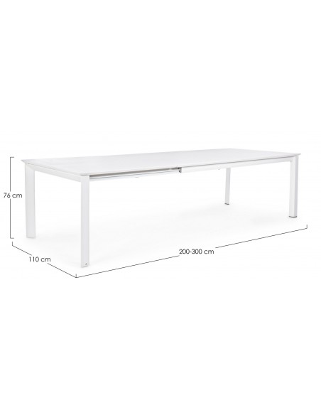 Havebord med udtræk, udført i et design af hvid pulverlakeret aluminium. Bordet måler 76 cm i højden og 200 - 300 x 110 cm i bredde og dybde.