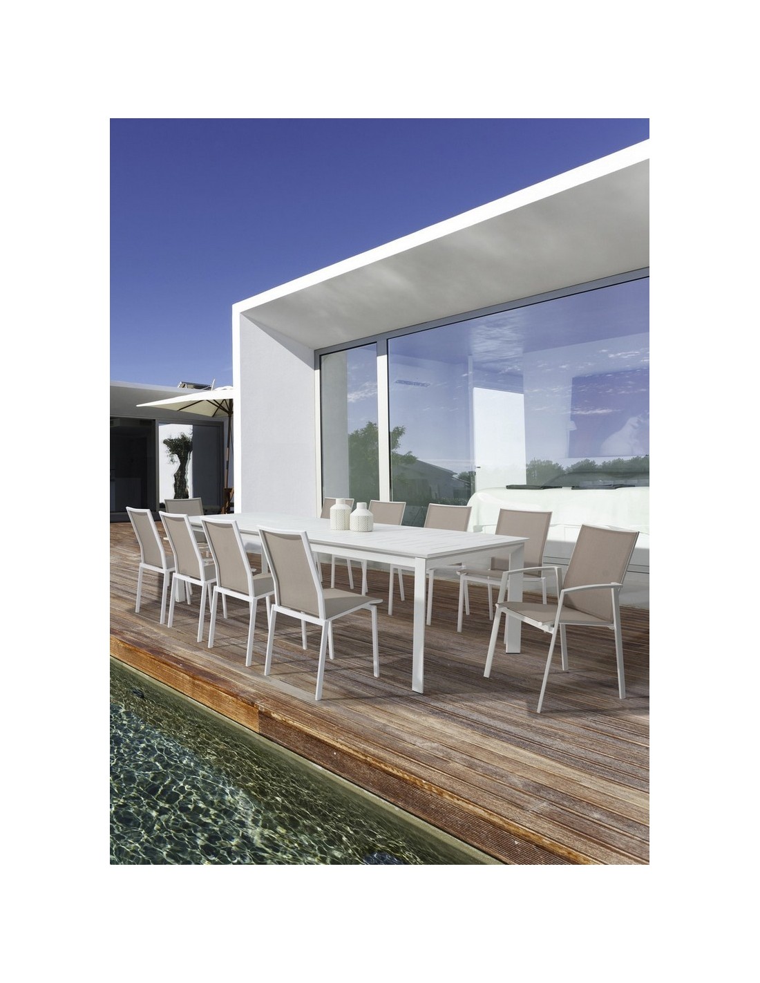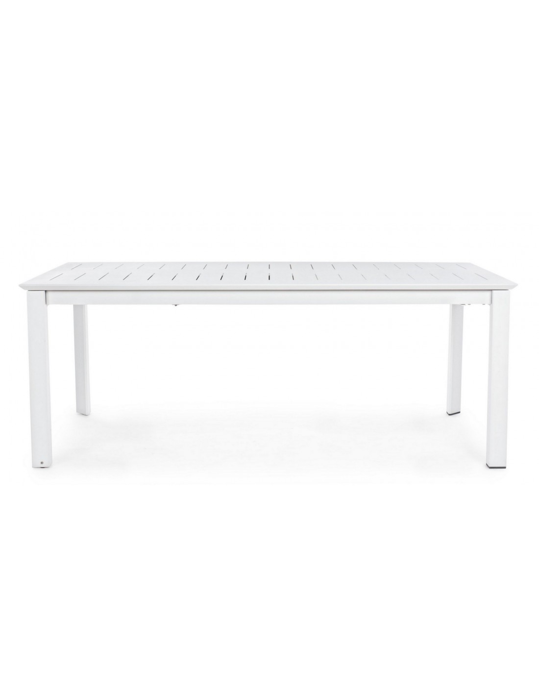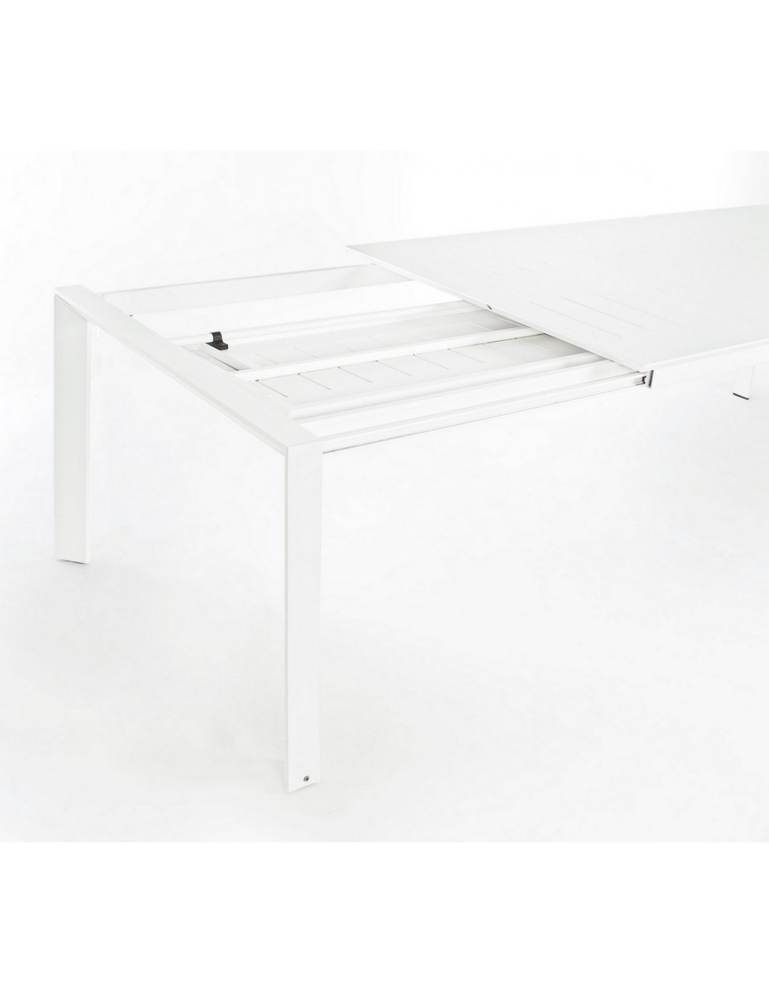 Havebord med udtræk, udført i et design af hvid pulverlakeret aluminium. Bordet måler 76 cm i højden og 200 - 300 x 110 cm i bredde og dybde.