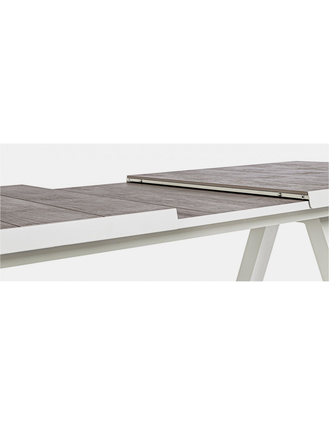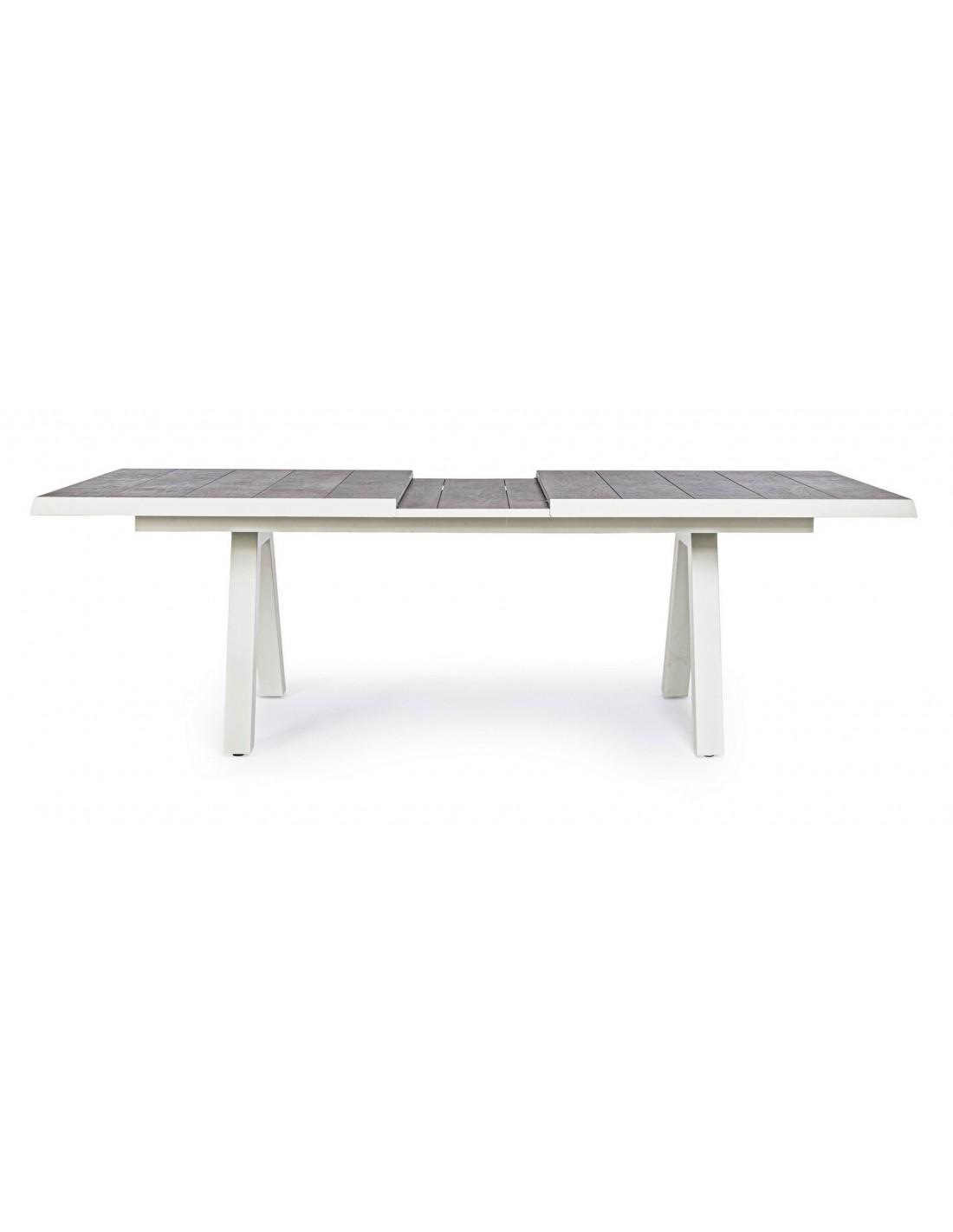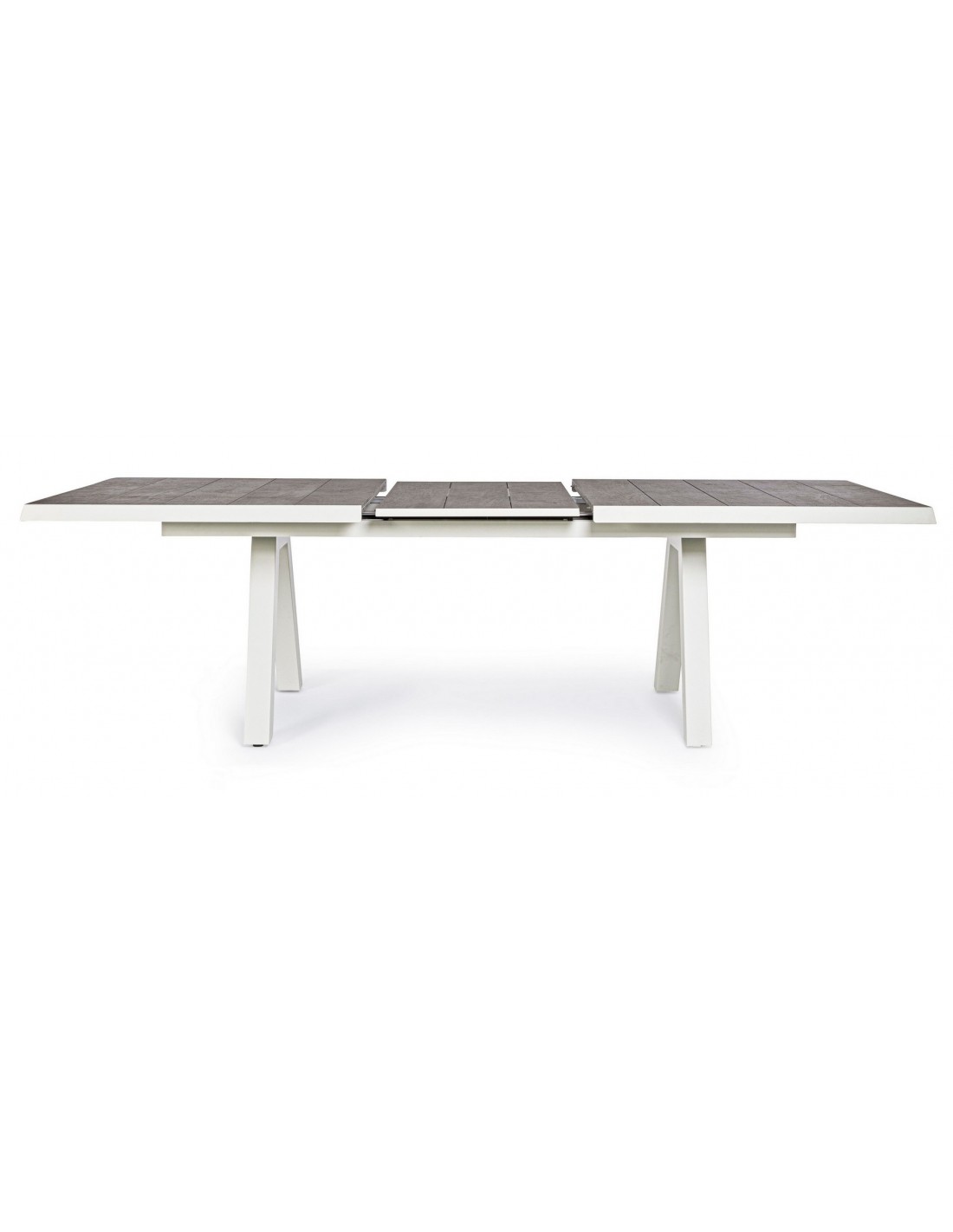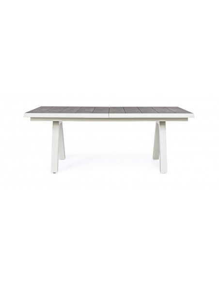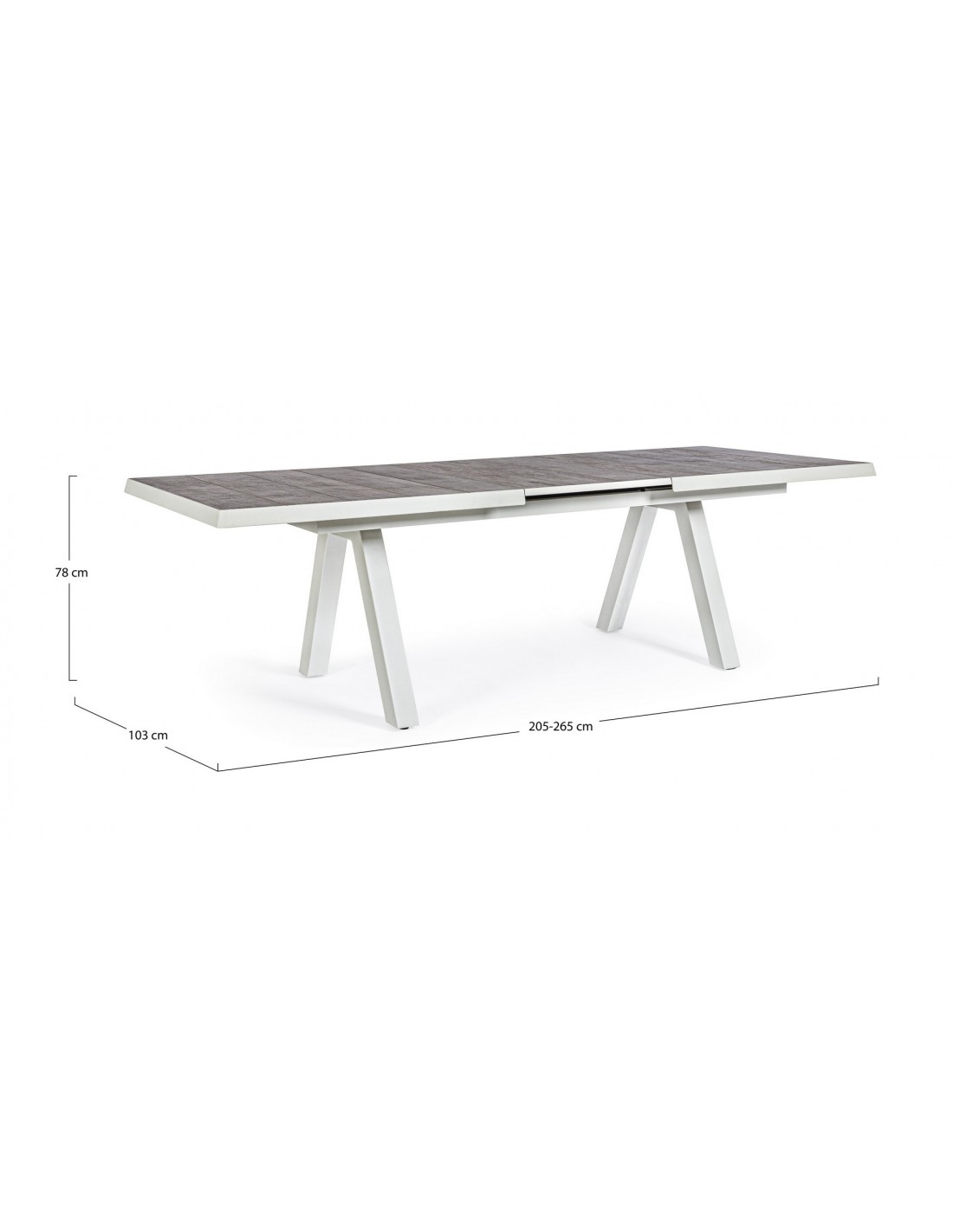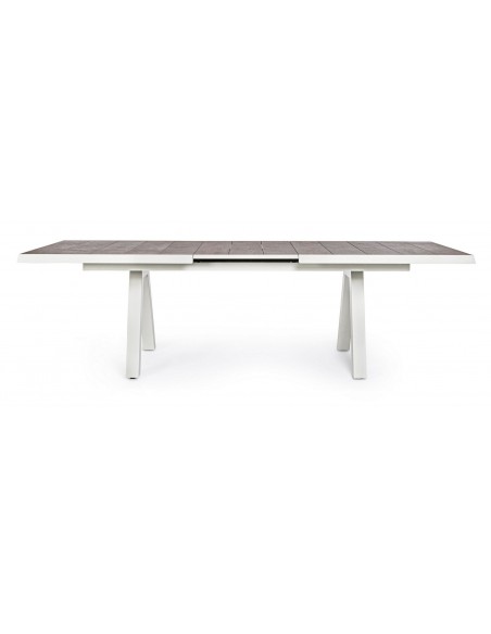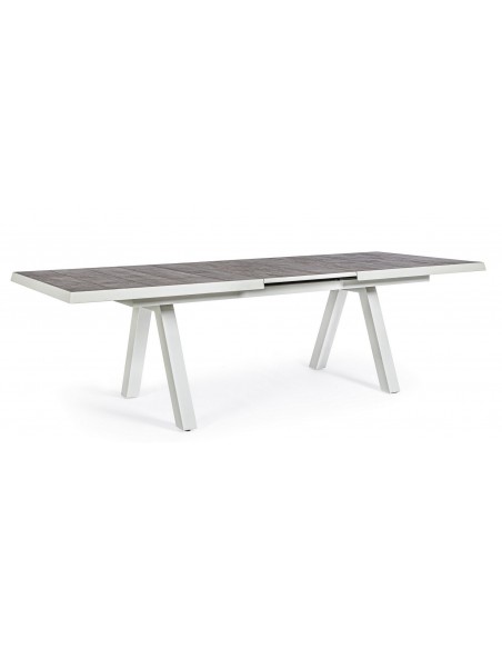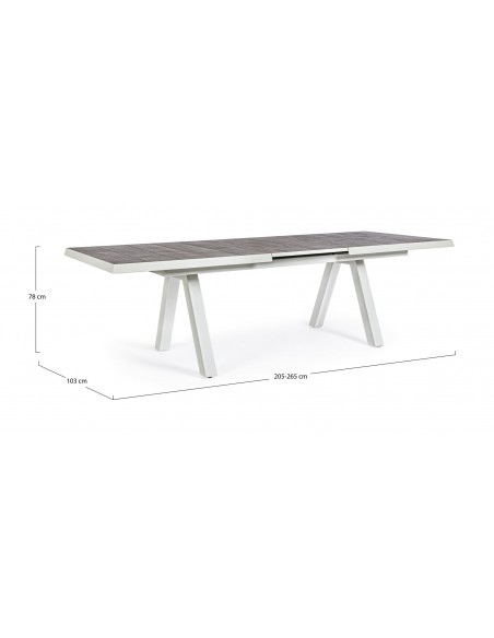 Havebord med udtræk, udført i et design af hvid pulverlakeret aluminium og stengrå keramik. Bordet måler 78 cm i højden og 205 - 265 x 103 cm i bredde og dybde.