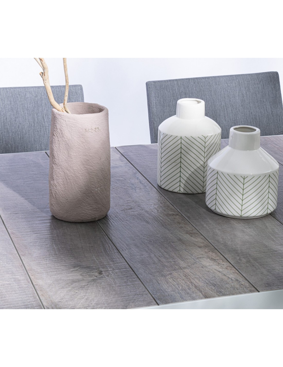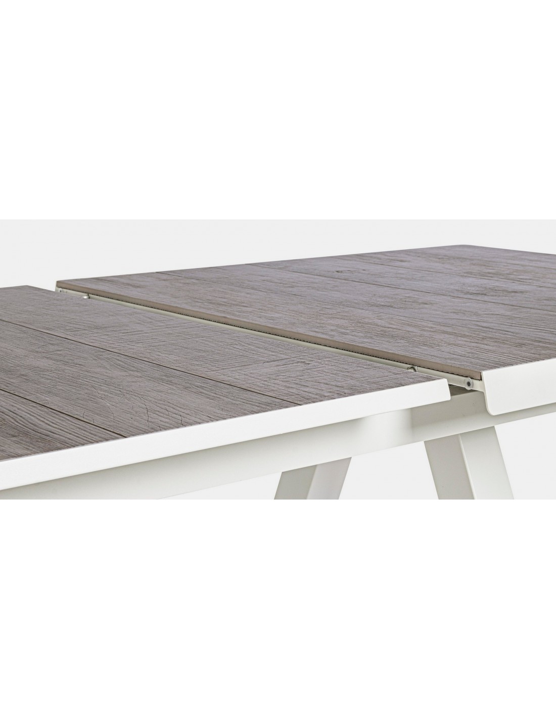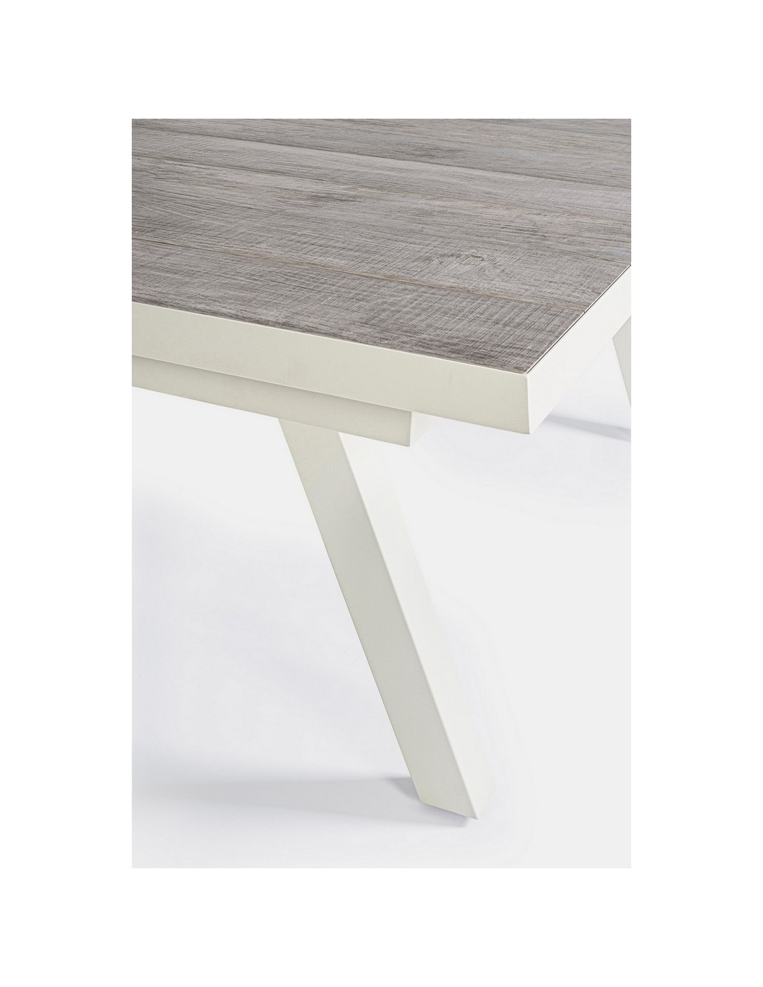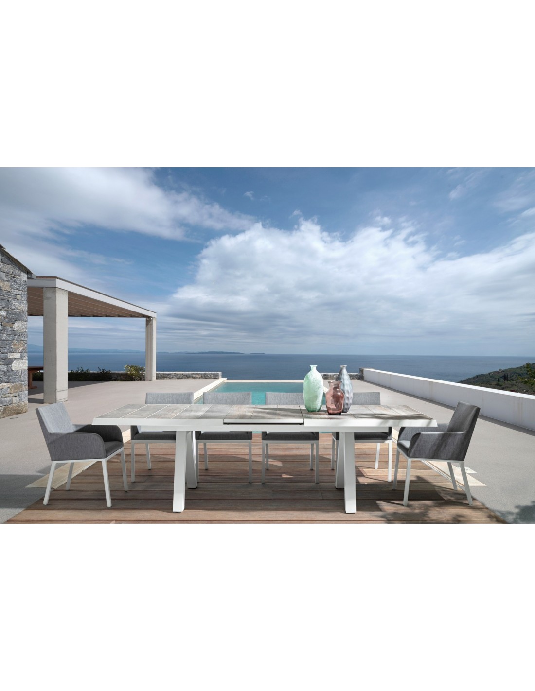 Havebord med udtræk, udført i et design af hvid pulverlakeret aluminium og stengrå keramik. Bordet måler 78 cm i højden og 205 - 265 x 103 cm i bredde og dybde.