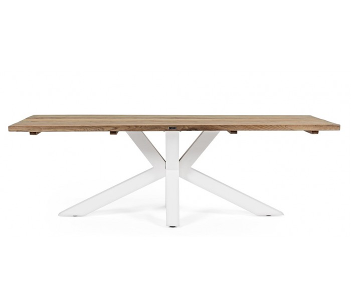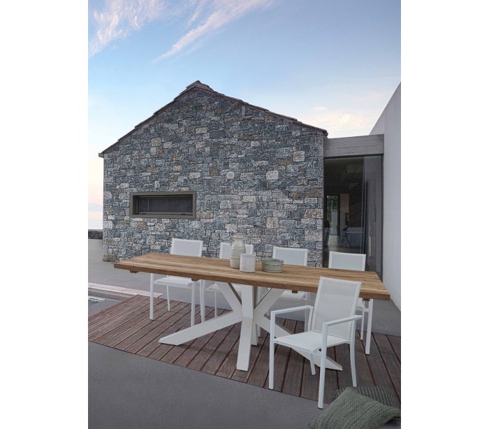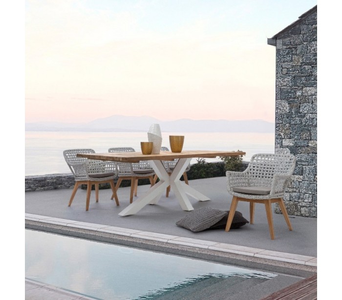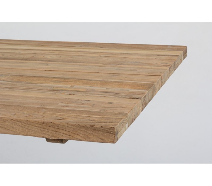 Havebord udført i et design af hvid pulverlakeret aluminium og med bordplade i genanvendt teaktræ. Bordet er med justérbare fødder. Teaktræ er naturligt resistent overfor fugt, men vi anbefaler løbende behandling med teaktræsolie. Bordet måler 77 cm i højden og 240 x 100 cm i bredde og dybde.