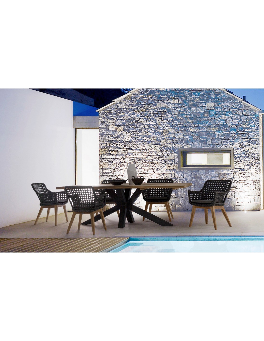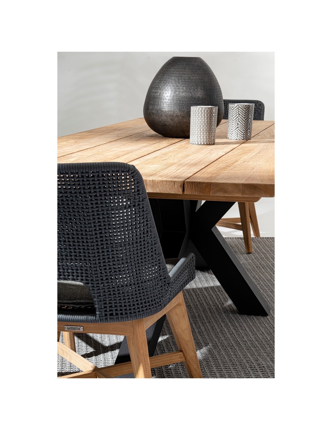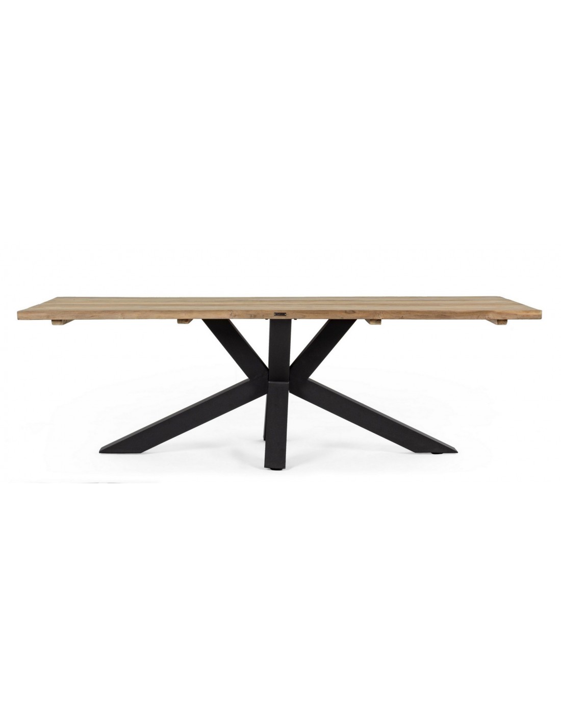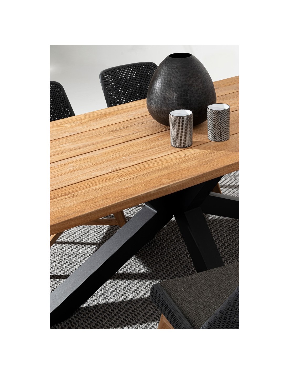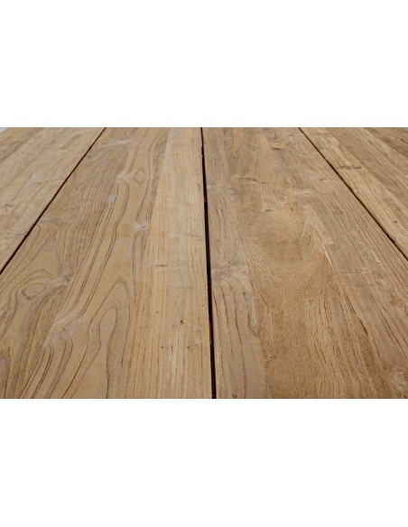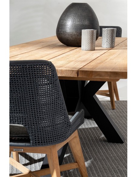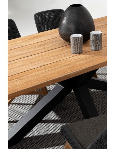 Havebord udført i et design af sort pulverlakeret aluminium og med bordplade i genanvendt teaktræ. Bordet er med justérbare fødder. Teaktræ er naturligt resistent overfor fugt, men vi anbefaler løbende behandling med teaktræsolie. Bordet måler 77 cm i højden og 240 x 100 cm i bredde og dybde.