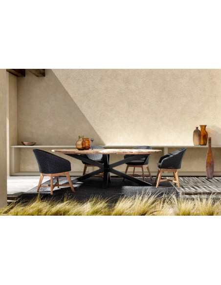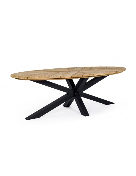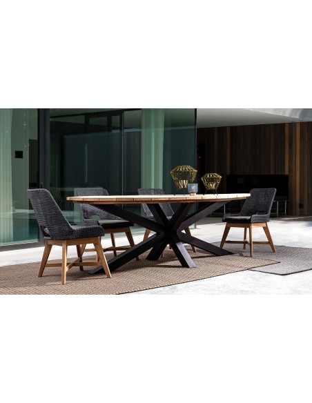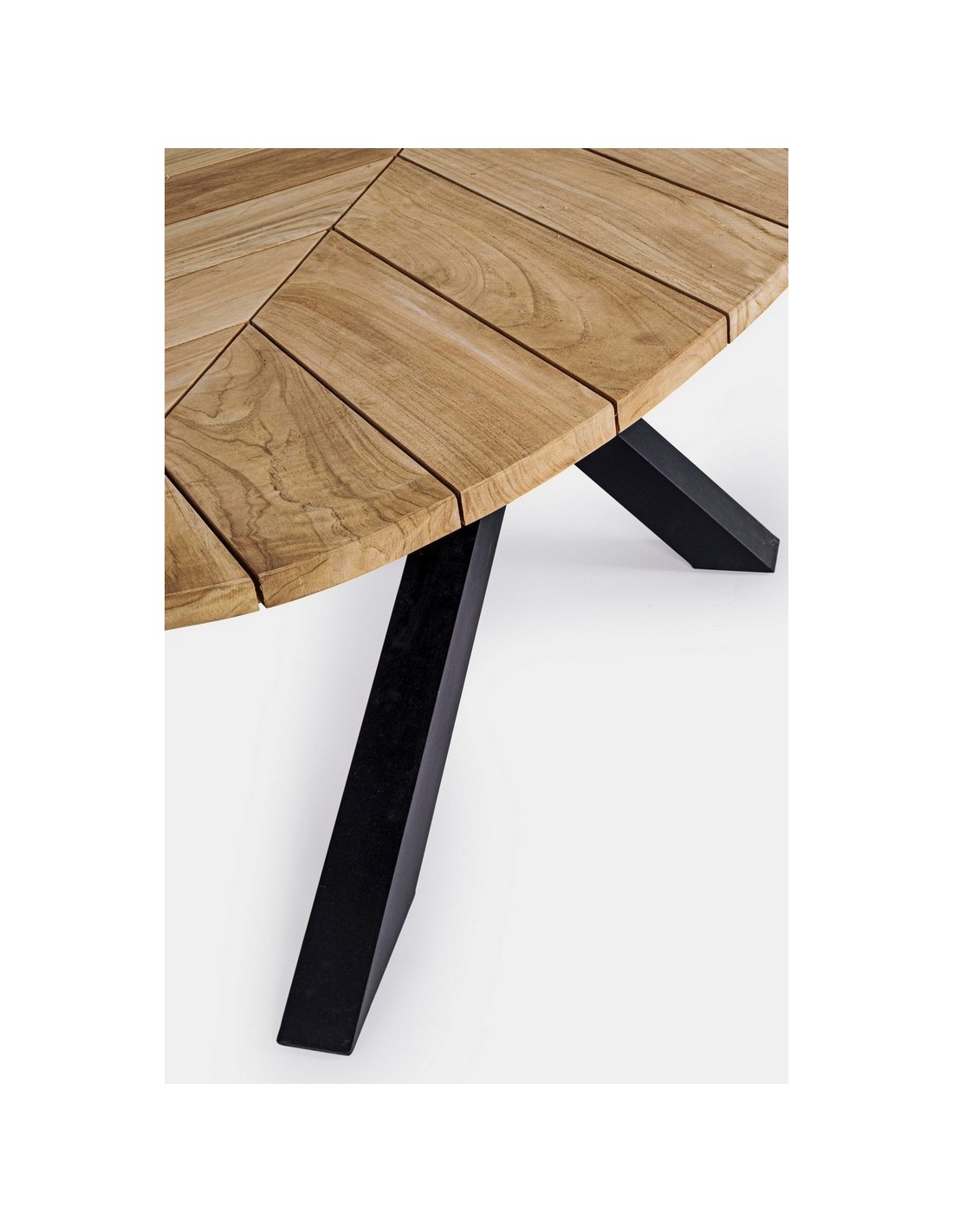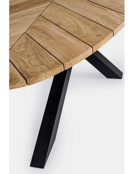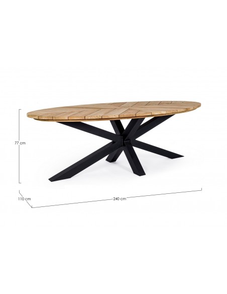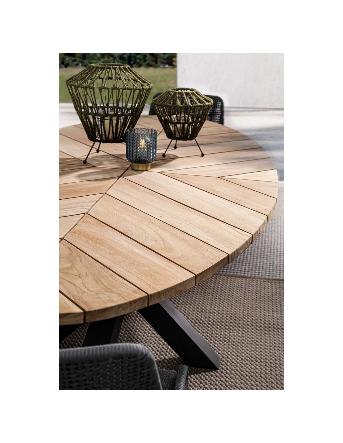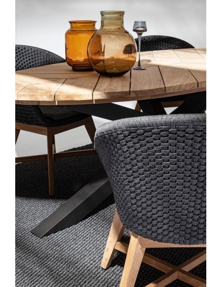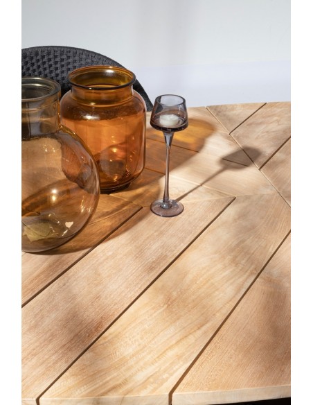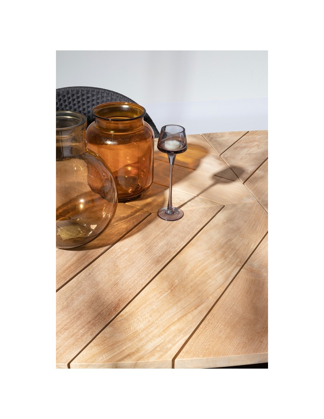 Havebord udført i et design af sort pulverlakeret aluminium og med bordplade i genanvendt teaktræ. Teaktræ er naturligt resistent overfor fugt, men vi anbefaler løbende behandling med klar lak. Bordet måler 77 cm i højden og 240 x 110 cm i bredde og dybde.