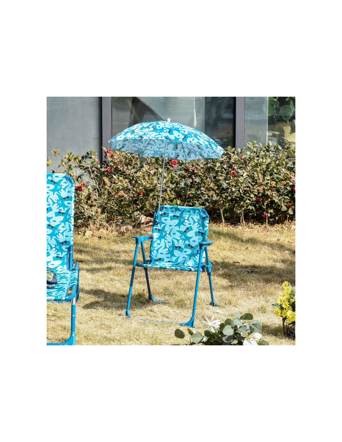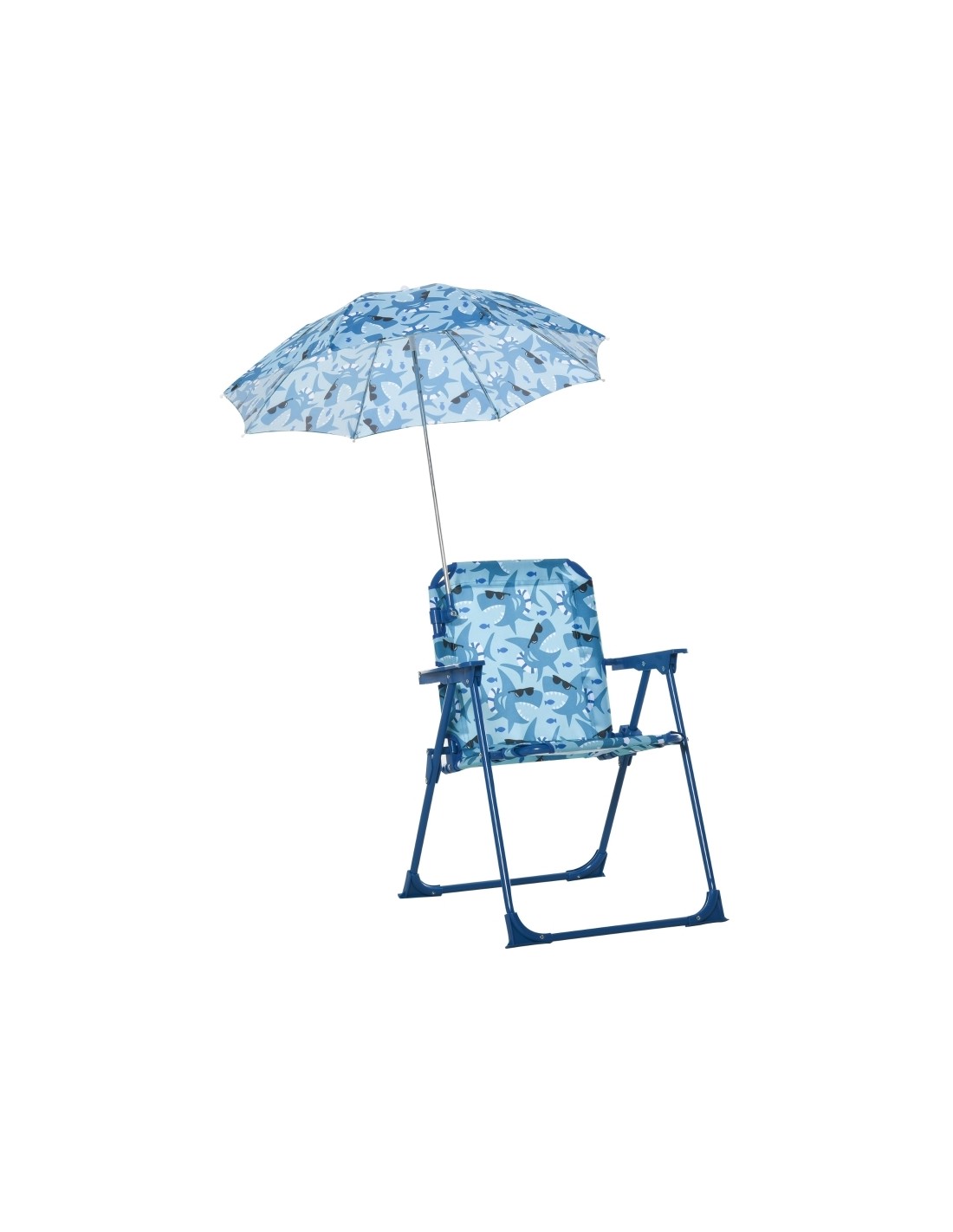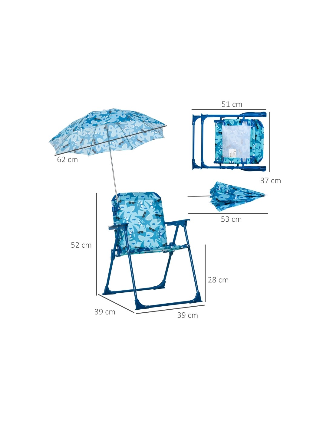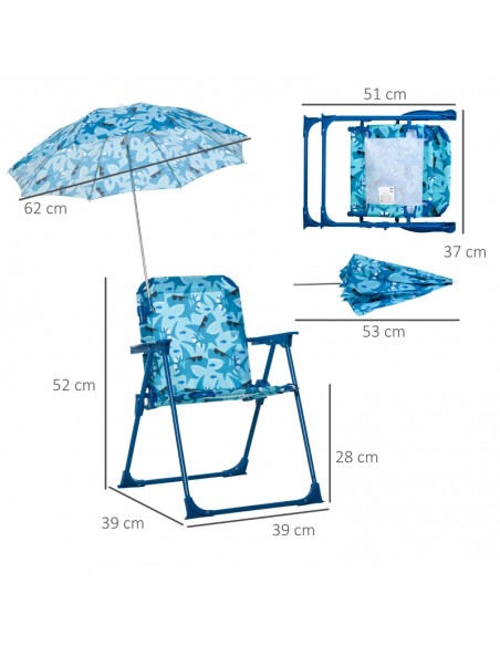 Havestol med parasol til børn. Stol og parasol kan klappes sammen, således det er lettere at flytte eller opbevare. Stolen måler 52 cm i højden over ryggen, og parasollen måler 62 cm i diameter.