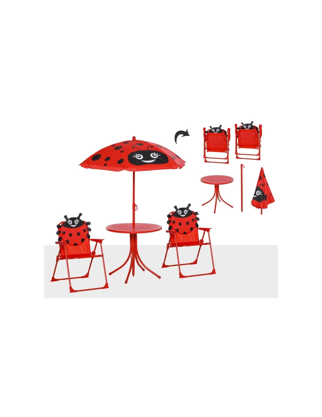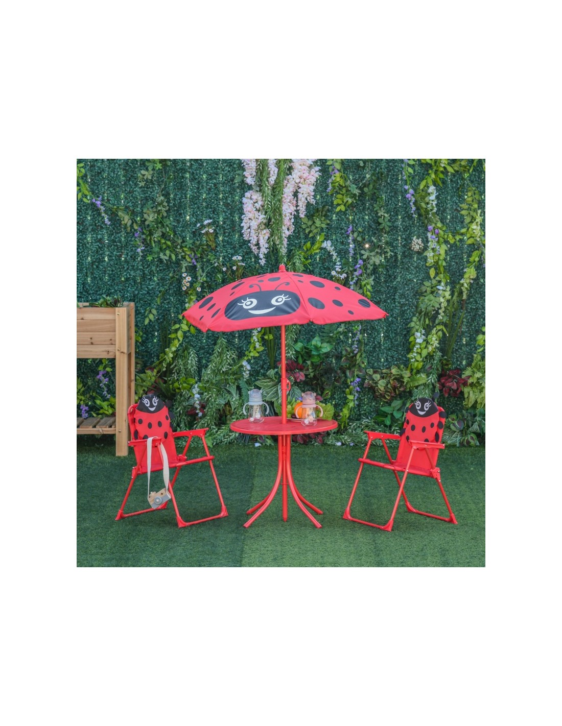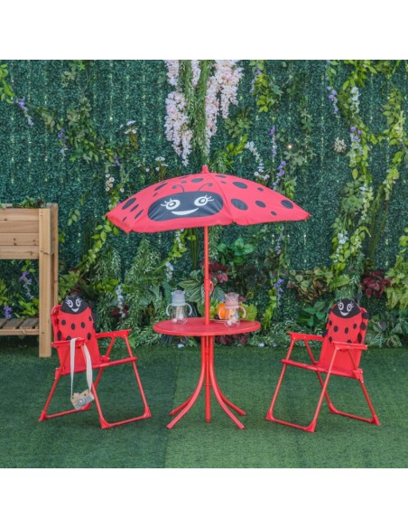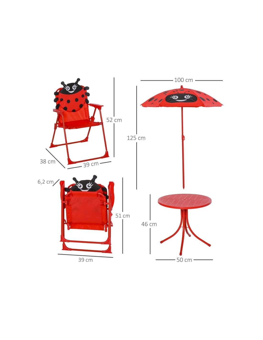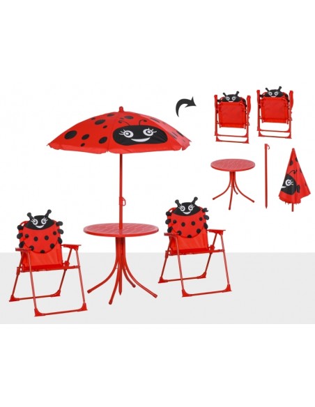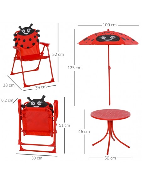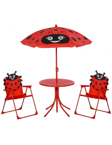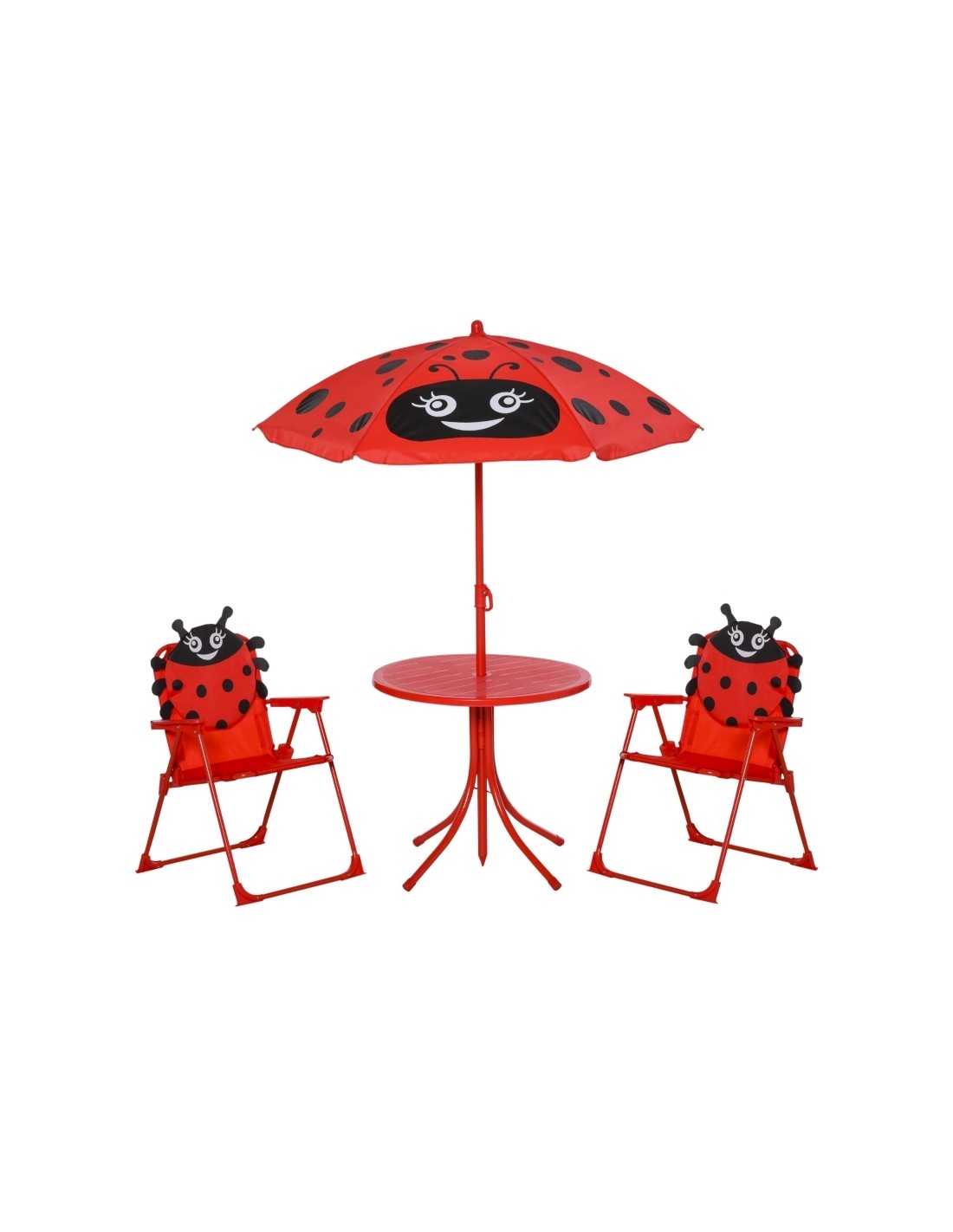 Bord og stolesæt til haven, til børn. Sættet består af 2 stole samt 1 bord med parasol, hvor parasollen er justerbar i højden.