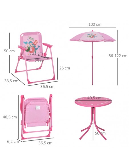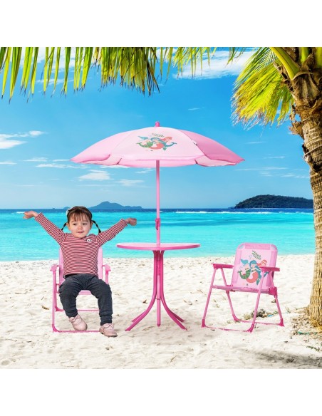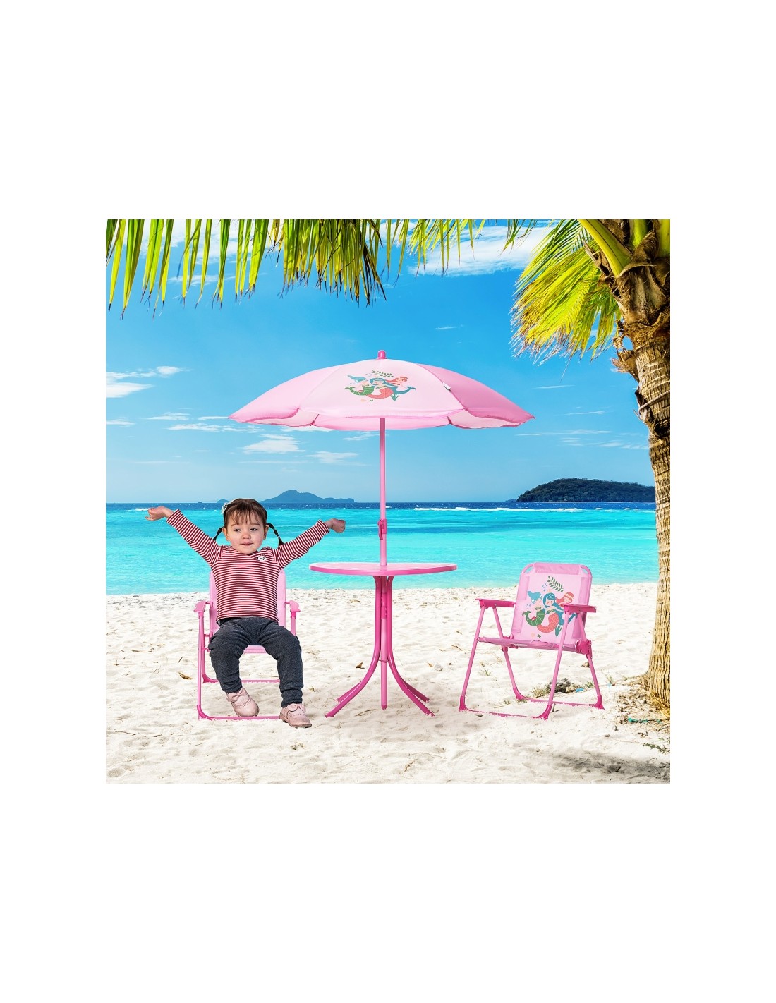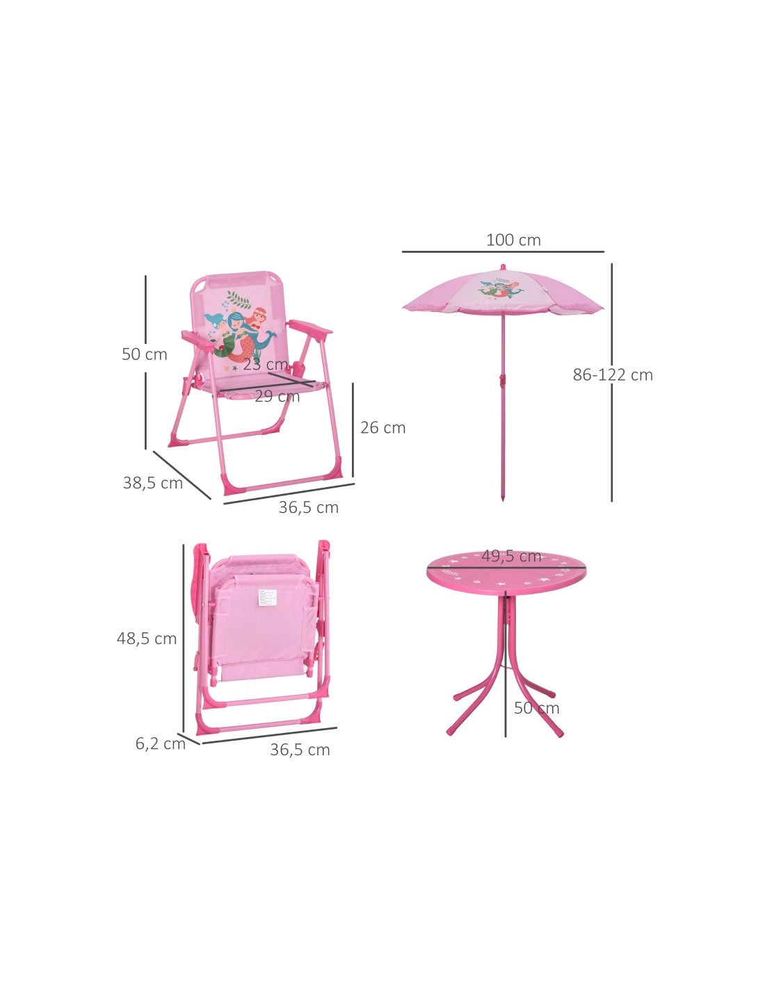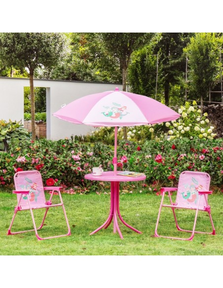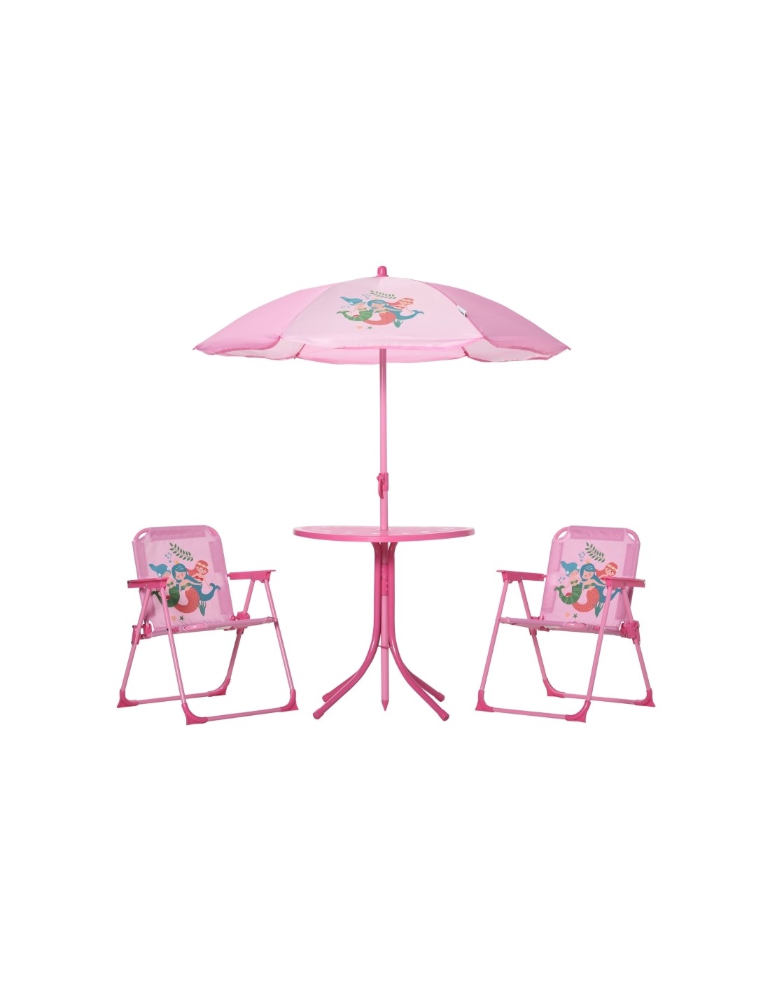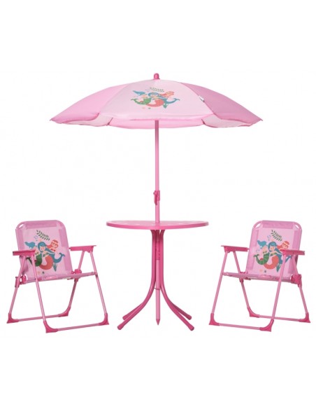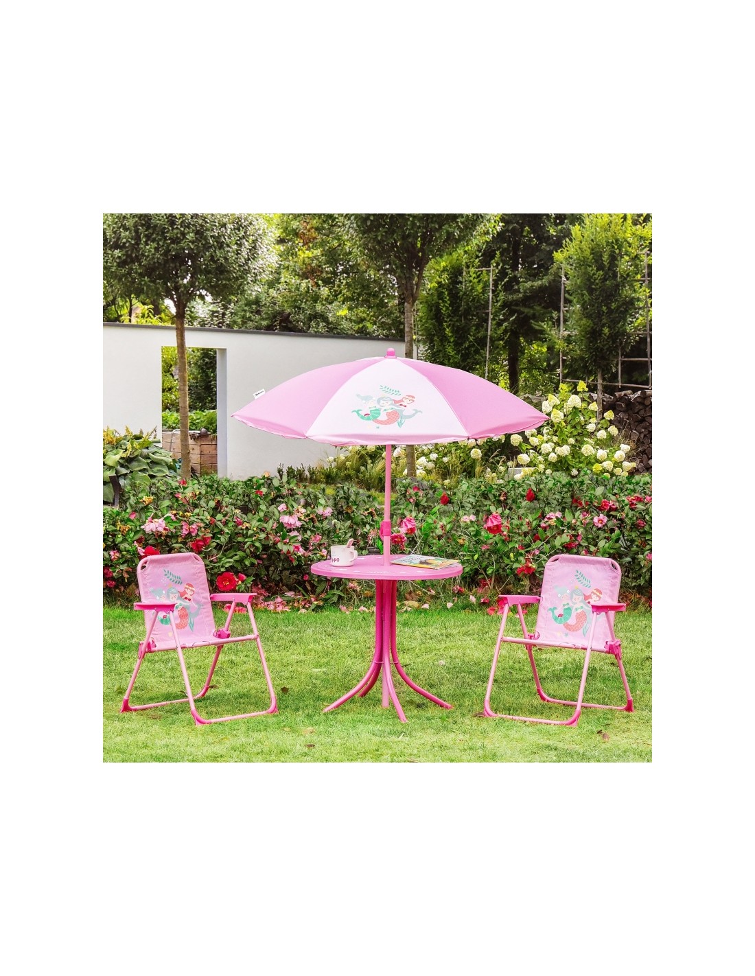 Bord og stolesæt til haven, til børn. Sættet består af 2 stole samt 1 bord med parasol, hvor parasollen er justerbar i højden.