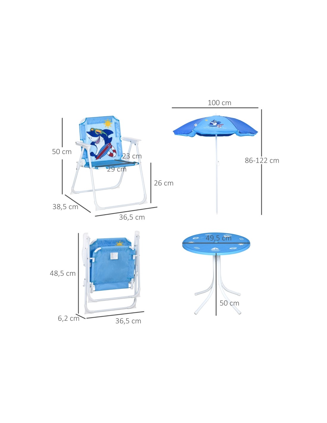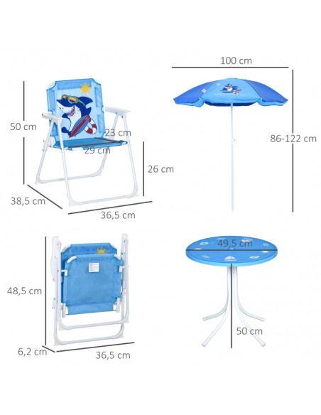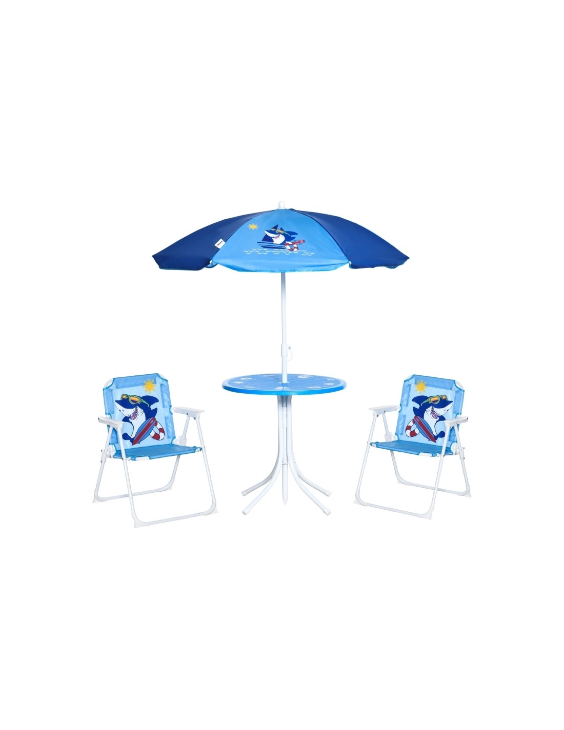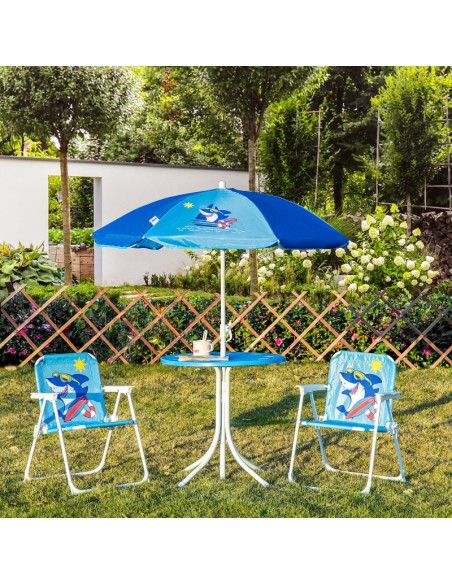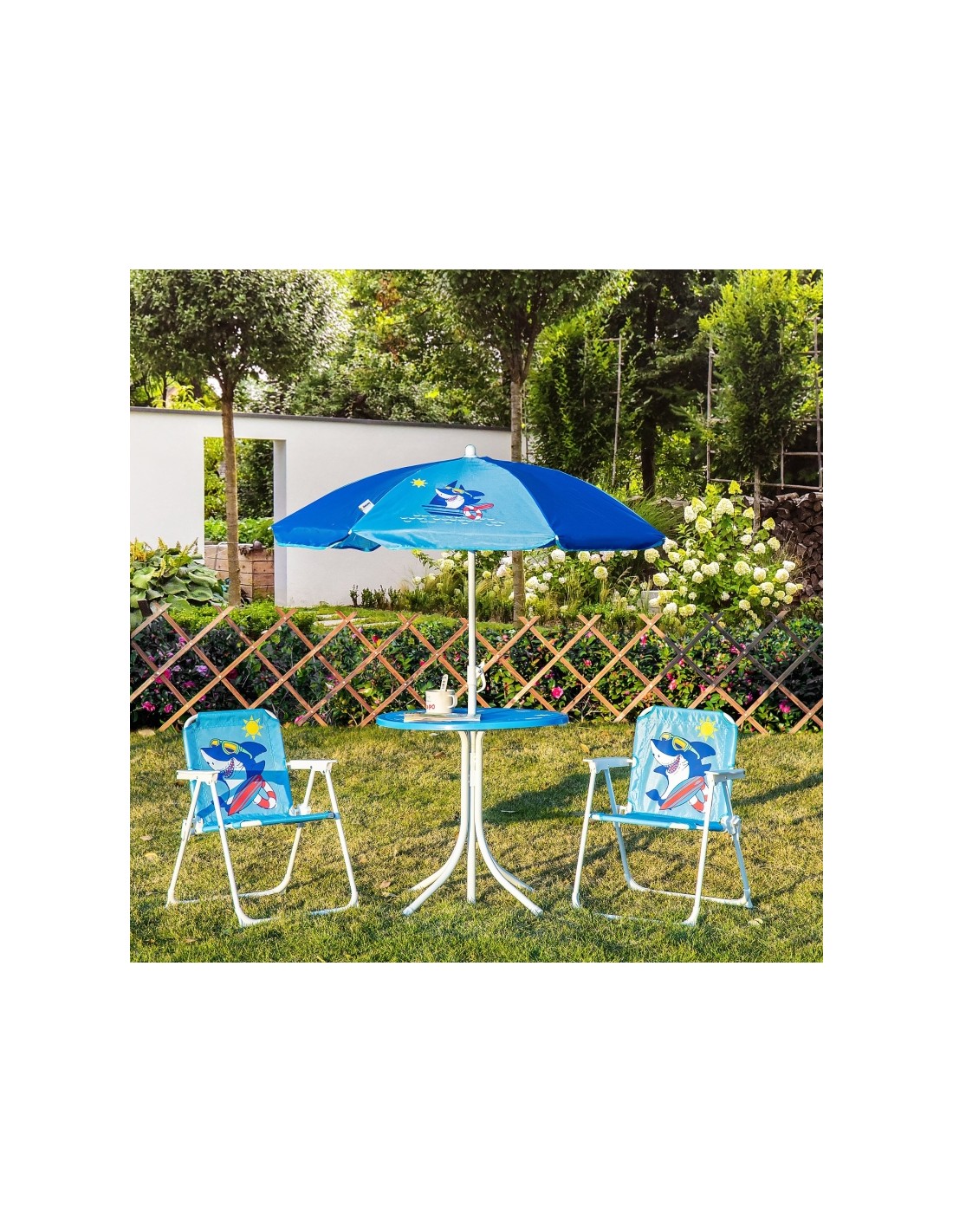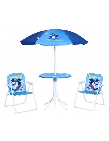 Bord og stolesæt til haven, til børn. Sættet består af 2 stole samt 1 bord med parasol, hvor parasollen er justerbar i højden.