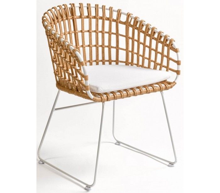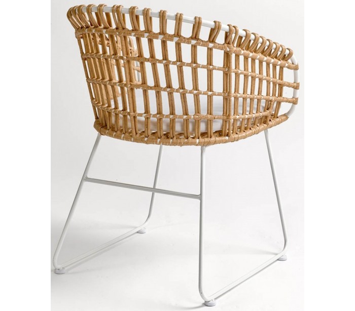 Havestol udført i et design i naturfarvet syntetisk rattan og hvidlakeret metal, med hynde i hvid polyester. Havestolen måler 81 cm i højden over ryggen og med siddehøjde på 46 cm.
