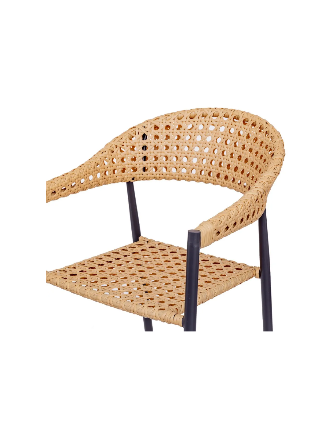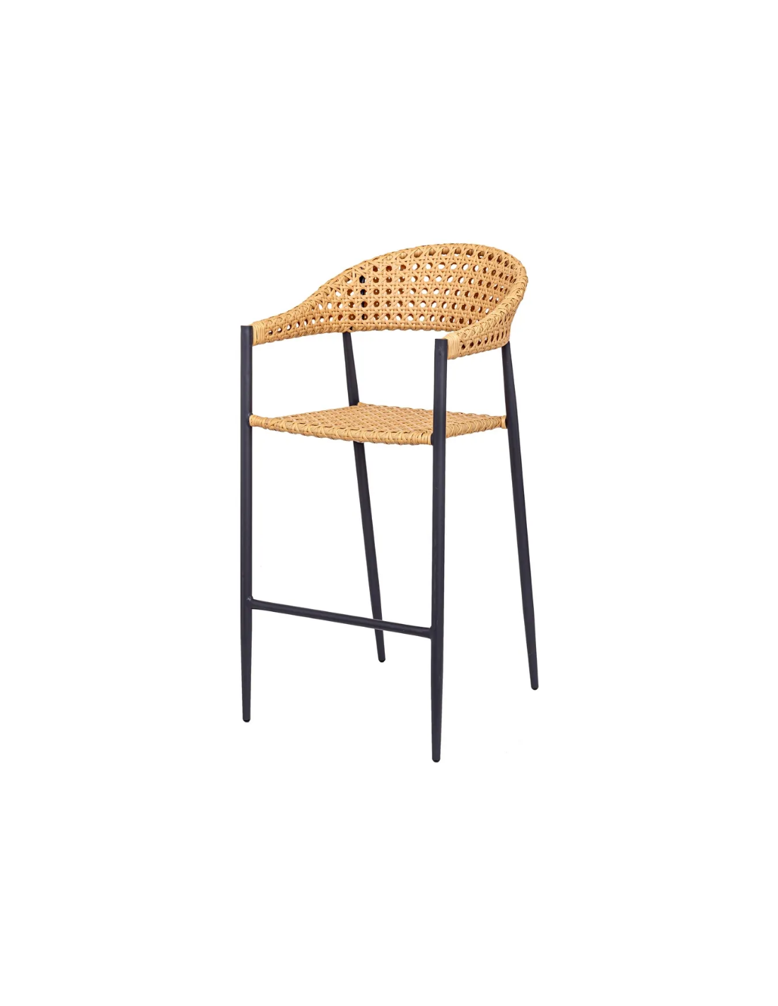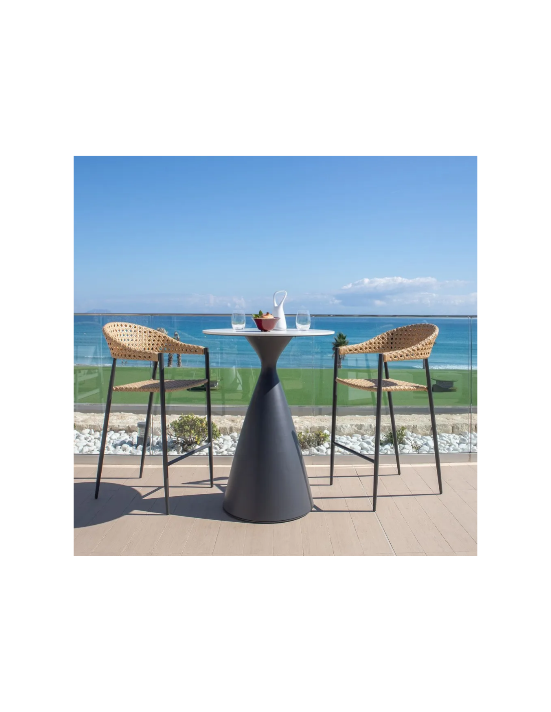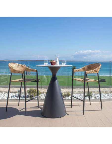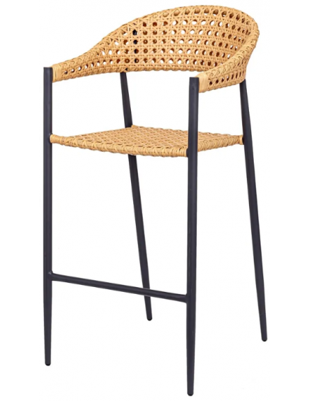 Have barstol udført i et design af antracit lakeret aluminium og brunt syntetisk rattan. Stolen måler 112 cm i højden og 56 cm i bredden. Stolen tåler at stå ude hele sommeren og er resistent overfor regn og fugt.