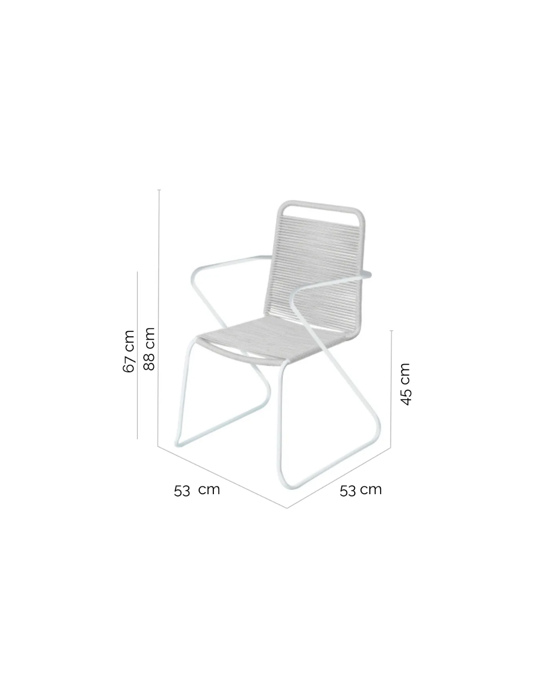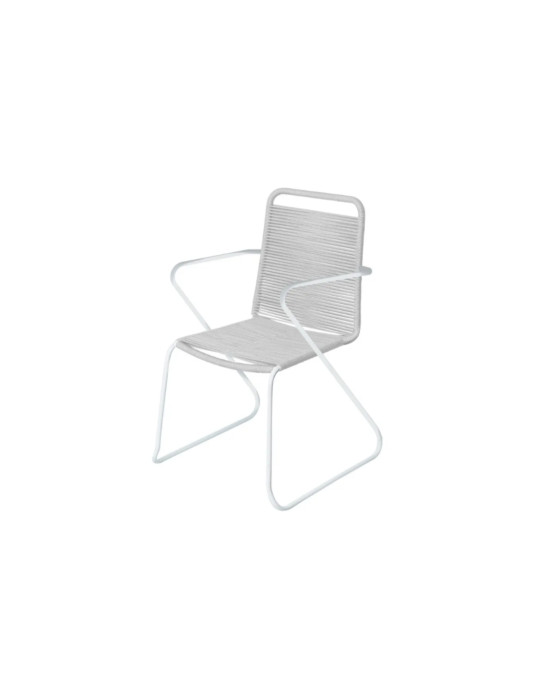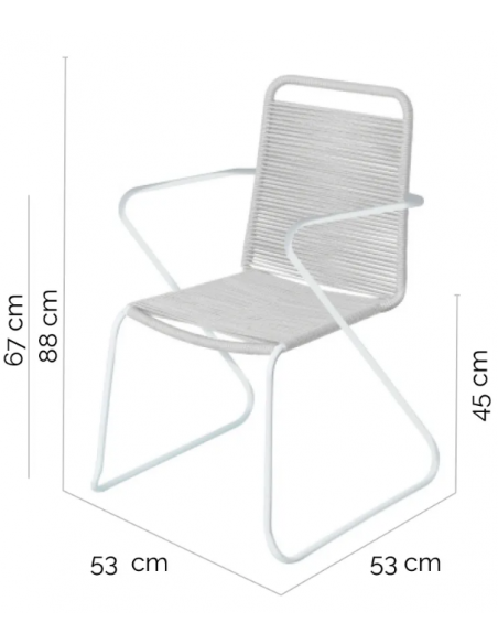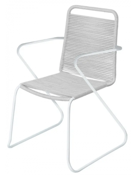 Havestol udført i et design af hvidlakeret aluminium og lysegrå fiberreb. Havestolen måler 88 cm i højden og 53 cm i bredden. Stolen tåler at stå ude hele sommeren og er resistent overfor regn og fugt.