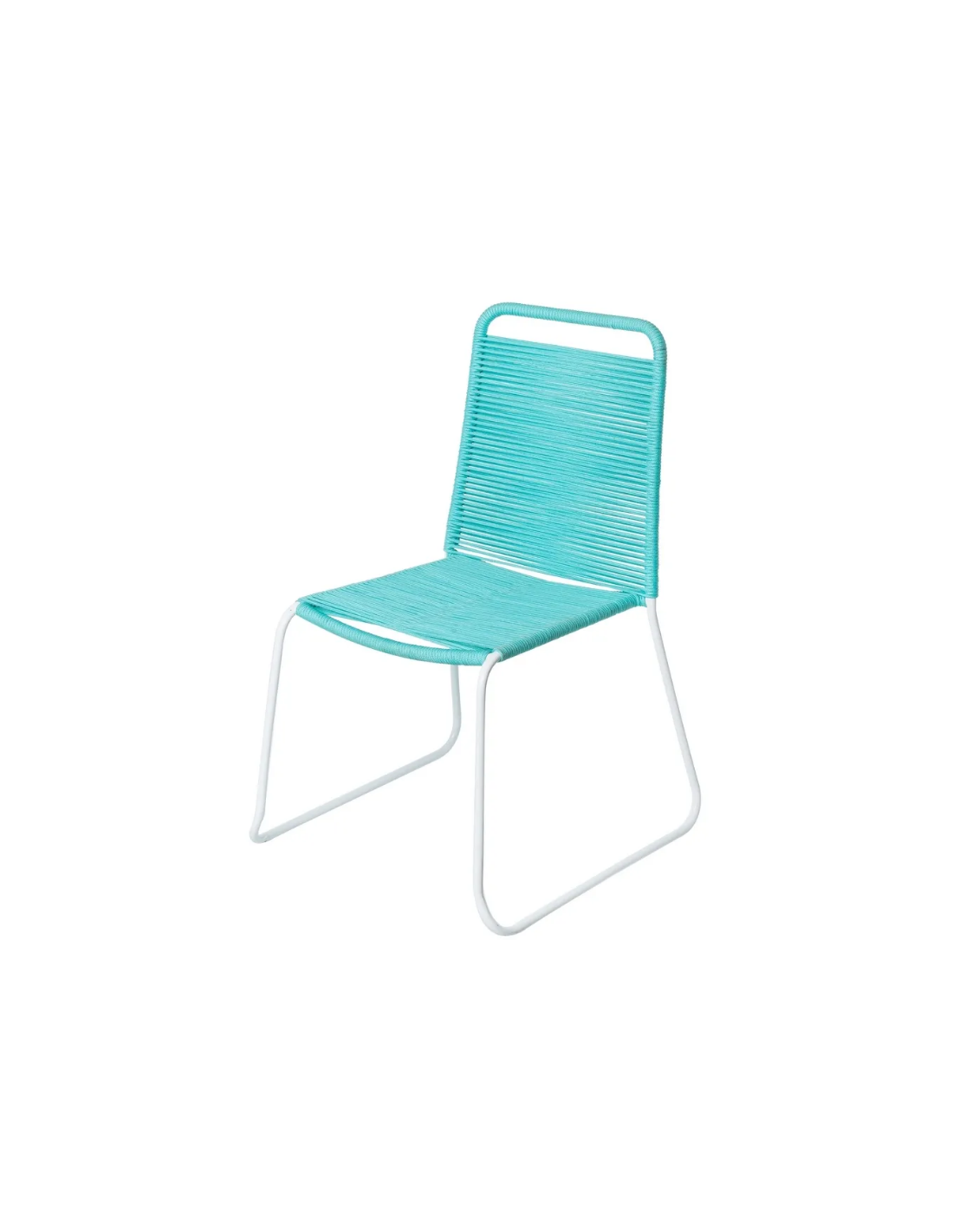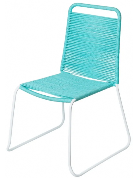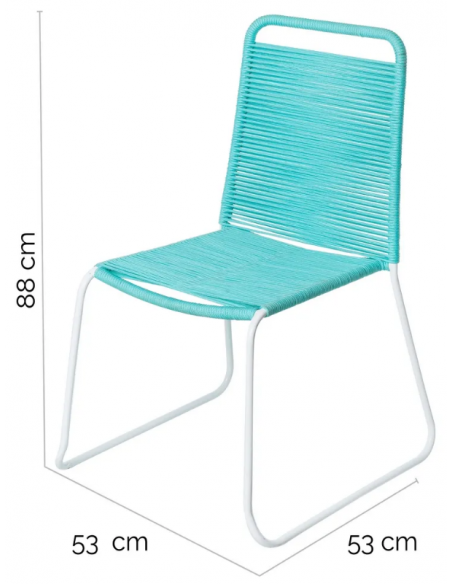 Havestol udført i et design af hvidlakeret aluminium og azurblå fiberreb. Havestolen måler 88 cm i højden og 53 cm i bredden. Stolen tåler at stå ude hele sommeren og er resistent overfor regn og fugt.