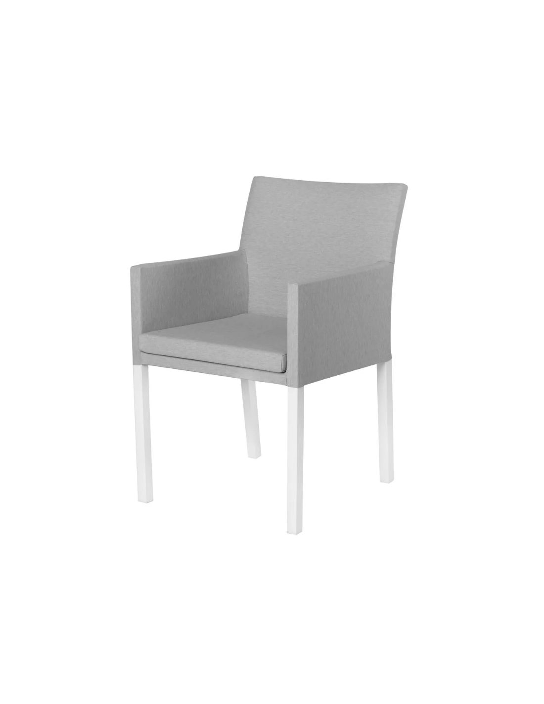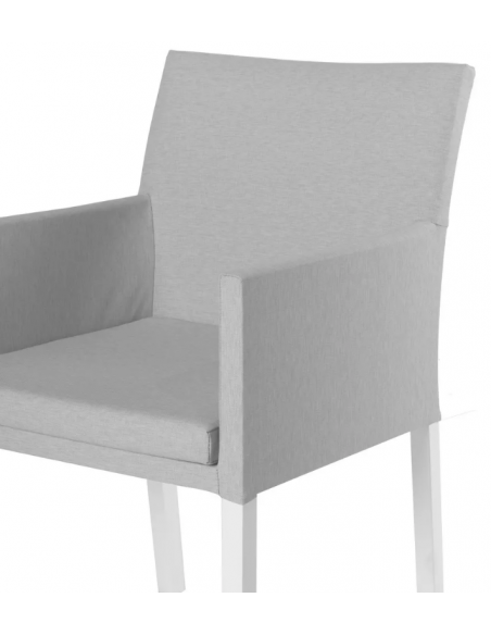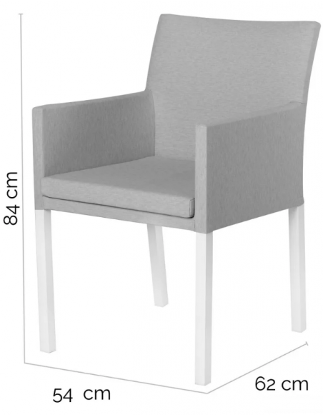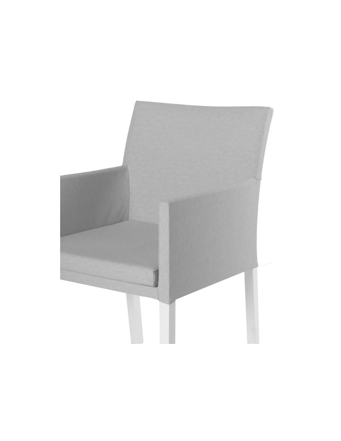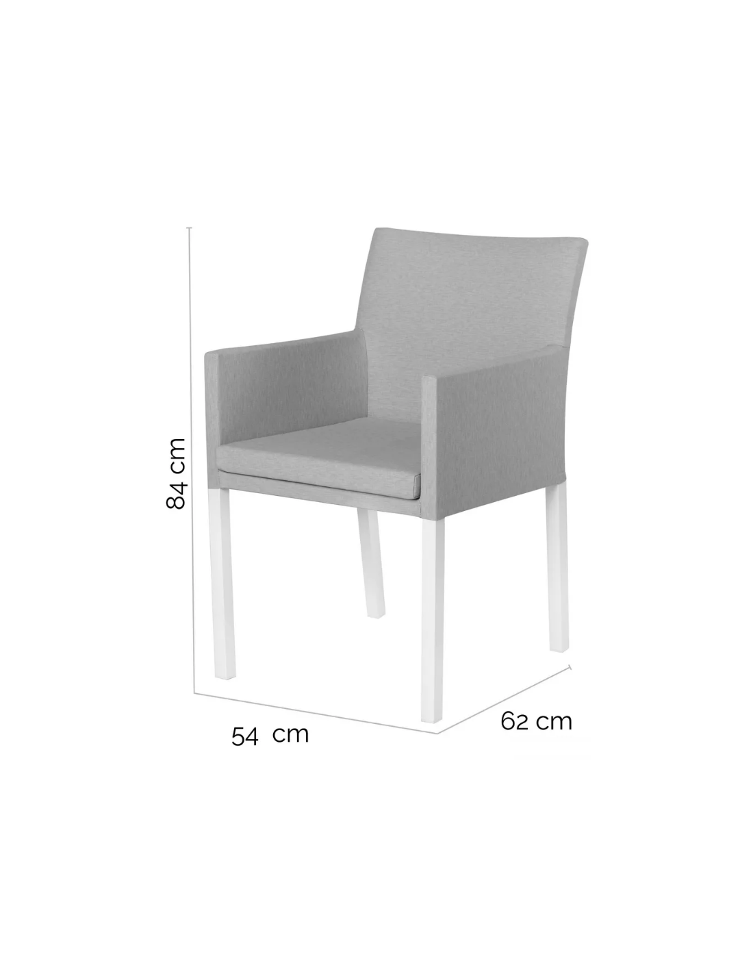 Havestol udført i et design af hvidlakeret aluminium og gråt vandafvisende textilene (vandafvisende, ikke vandtæt). Havestolen måler 84 cm i højden og 54 cm i bredden. Stolen tåler at stå ude hele sommeren og er resistent overfor regn og fugt.