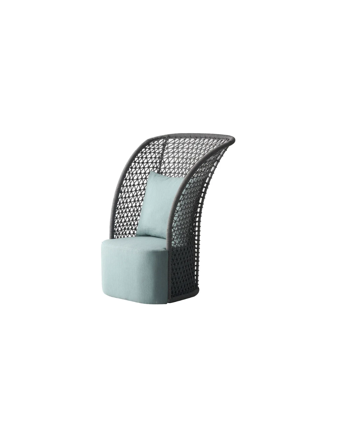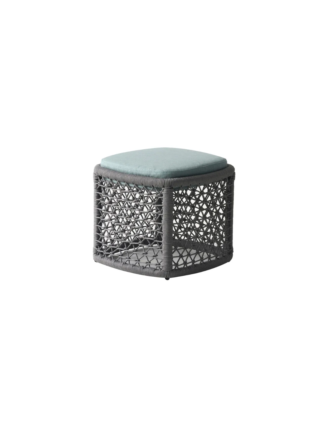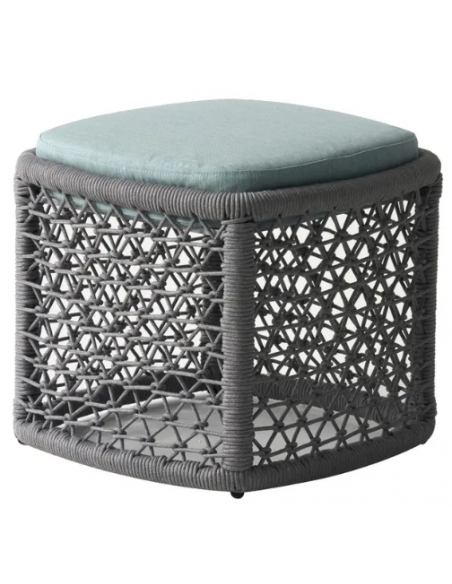 Loungestol med skammel til haven, udført i et design af grå syntetisk rattan med stel af aluminium og med tyk komfortabel hynde og rygpude i azurblå vandafvisende olefin (vandafvisende, ikke vandtæt). Stolen tåler at stå ude hele sommeren og er resistent overfor regn og fugt.