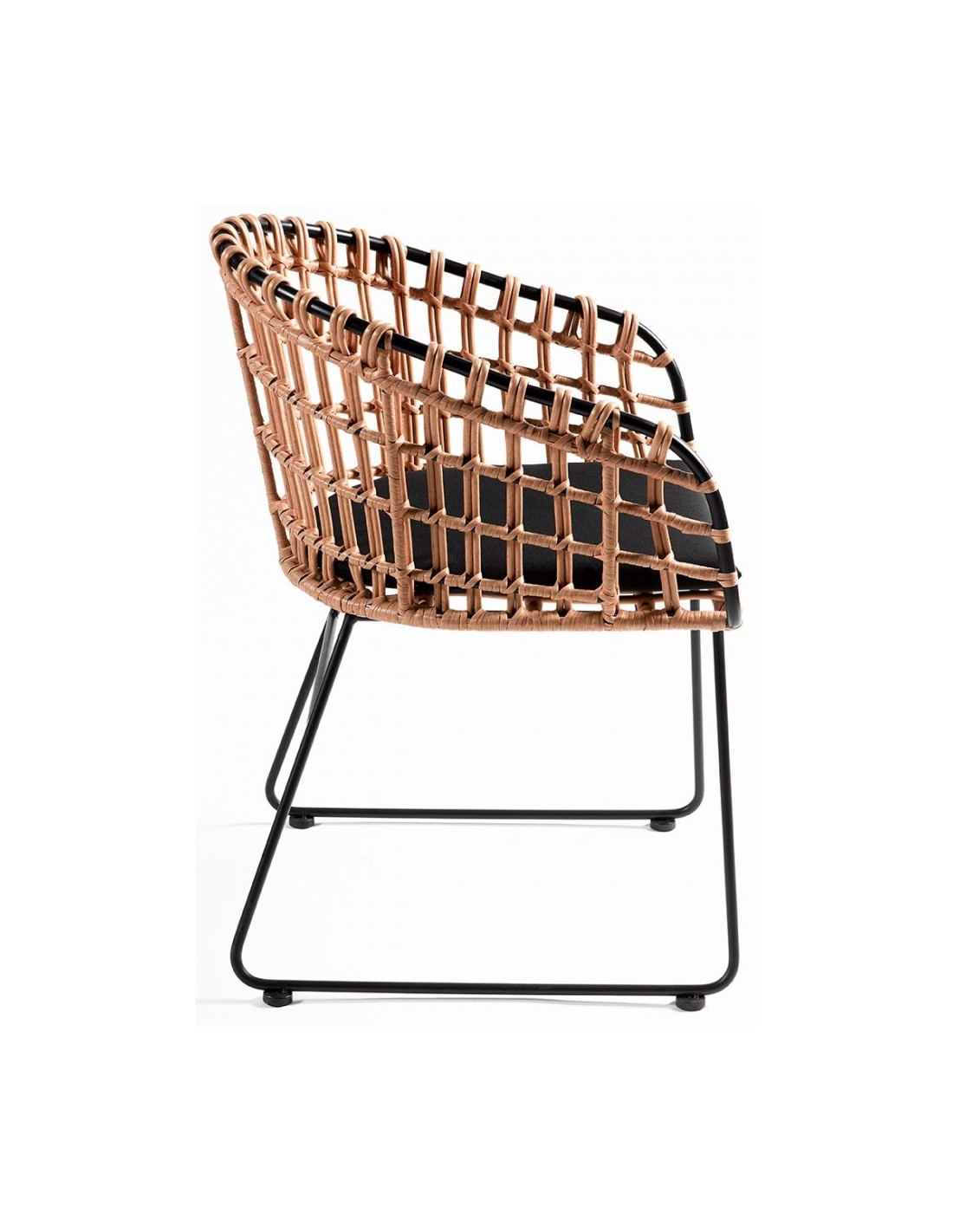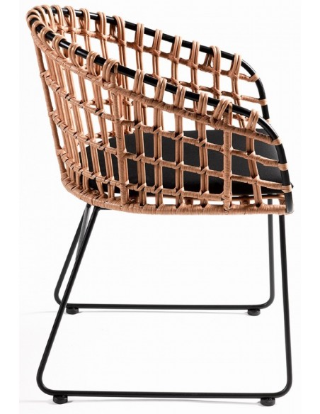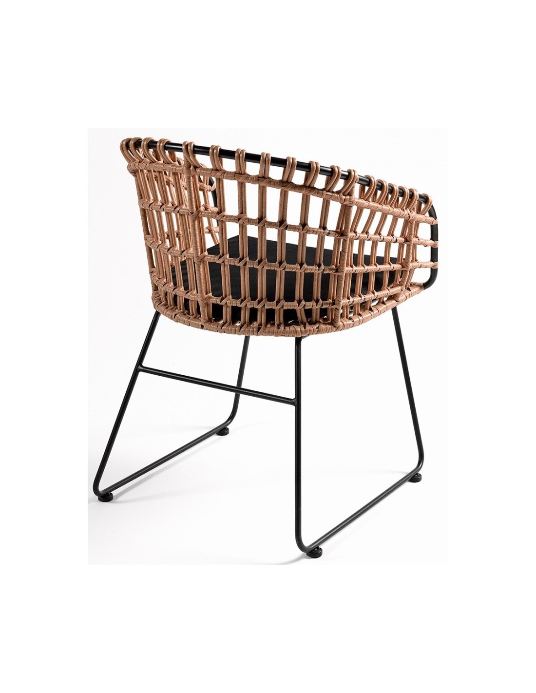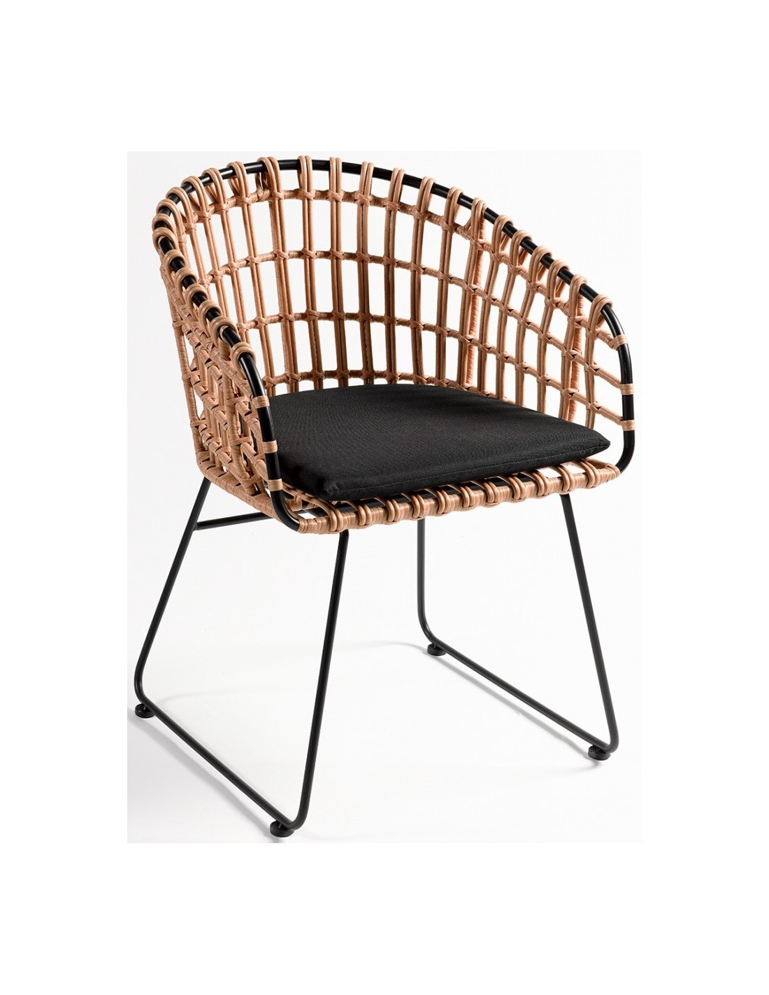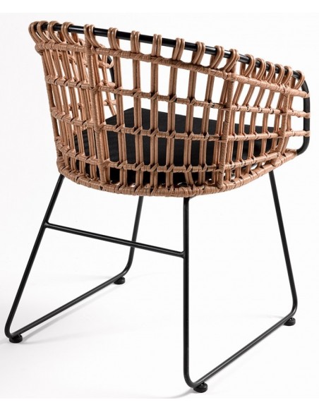 Havestol udført i et design i naturfarvet syntetisk rattan og sortlakeret metal, med hynde i sort polyester. Havestolen måler 81 cm i højden over ryggen og med siddehøjde på 46 cm.