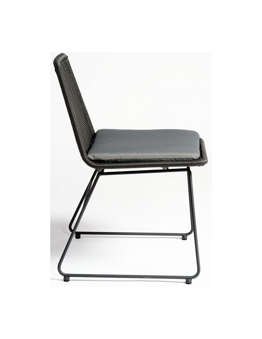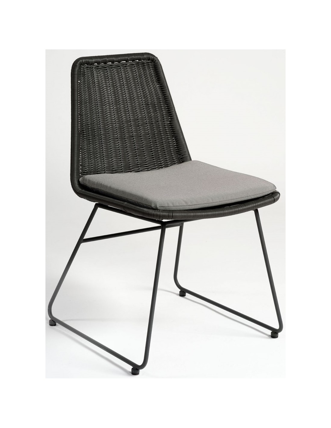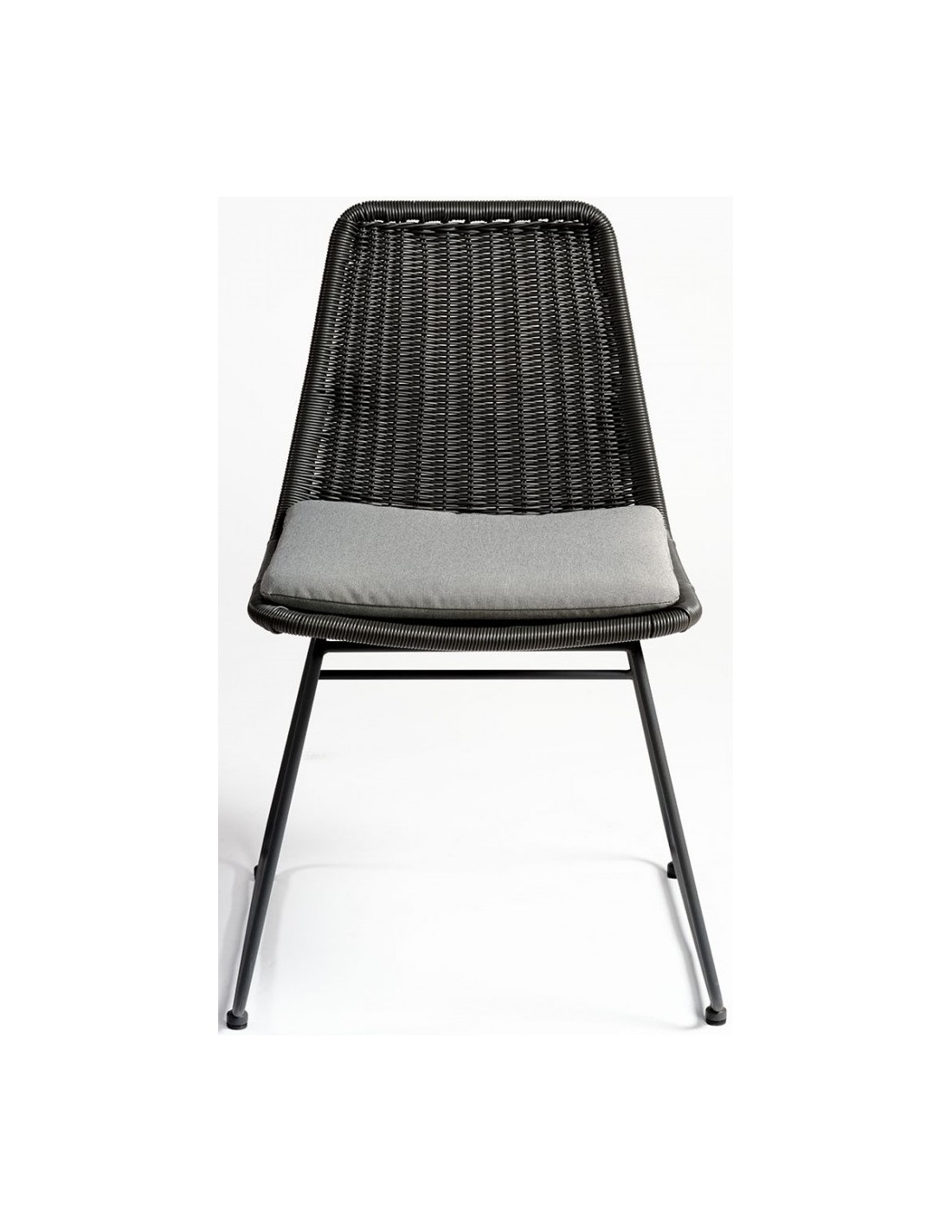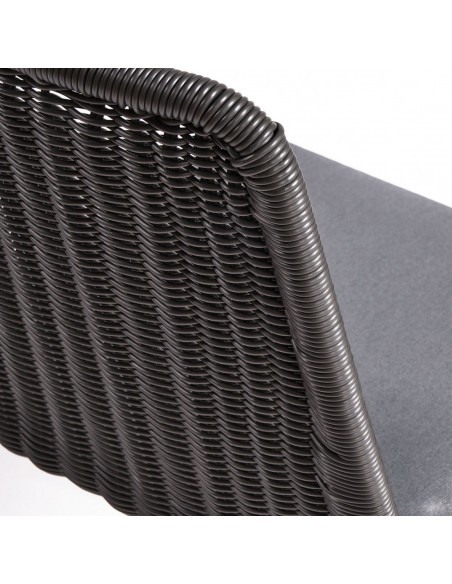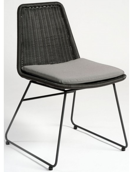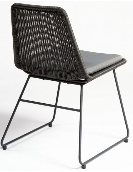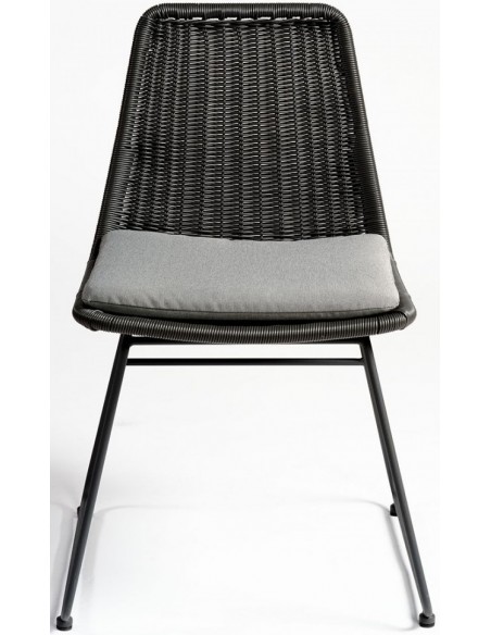 Havestol udført i et design i sort syntetisk rattan og sortlakeret metal, med hynde i grå polyester. Havestolen måler 83 cm i højden over ryggen og med siddehøjde på 46 cm.