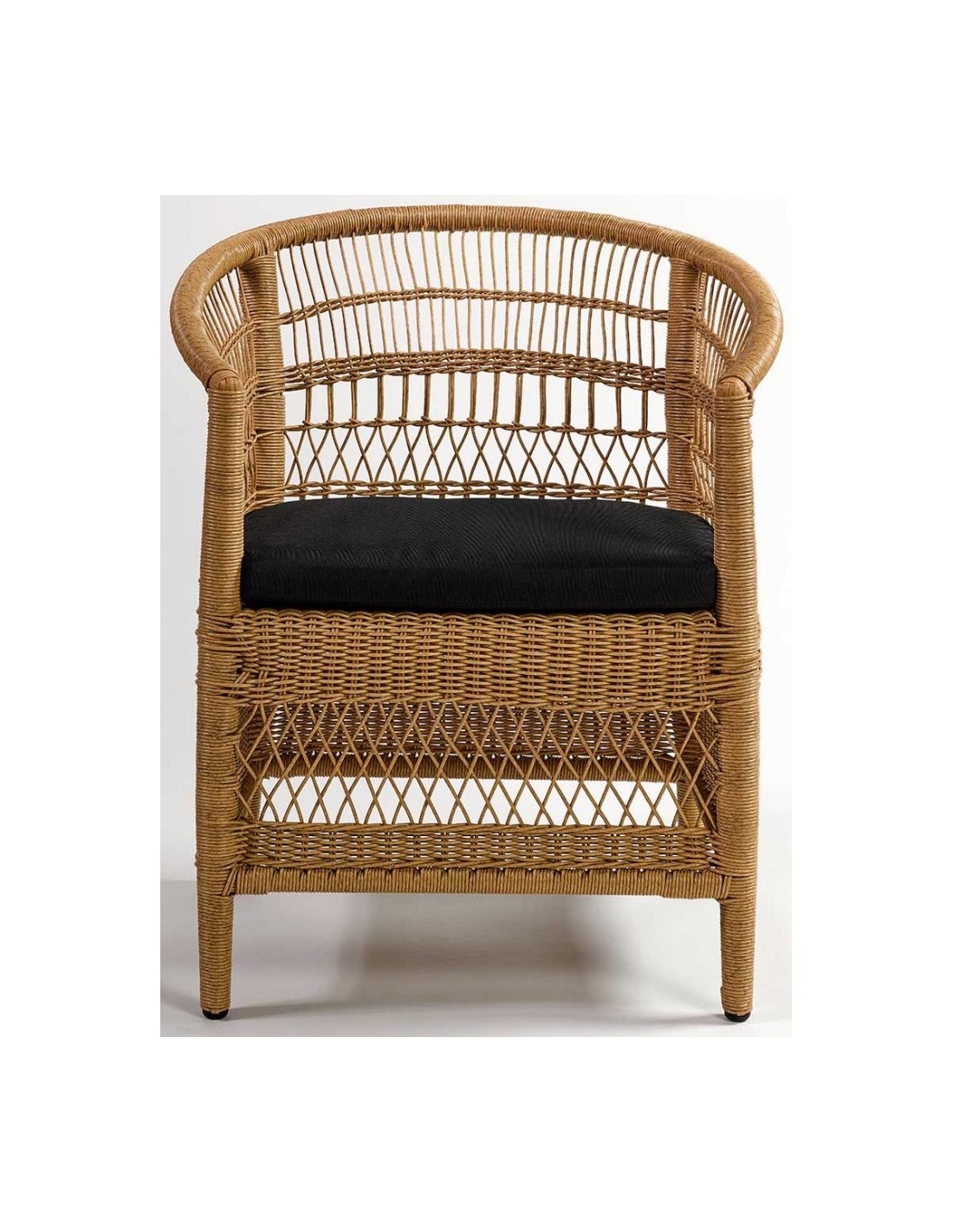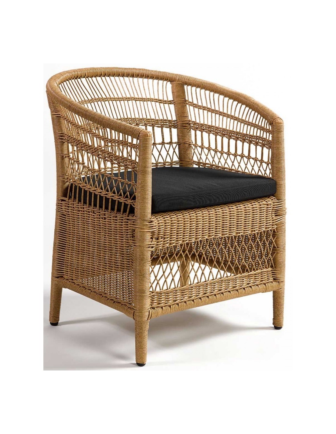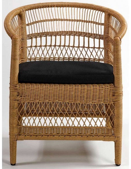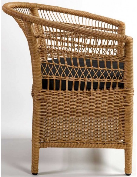 Havestol udført i et design i naturfarvet syntetisk rattan og med hynde i sort polyester. Havestolen måler 79 cm i højden over ryggen og med siddehøjde på 50 cm.