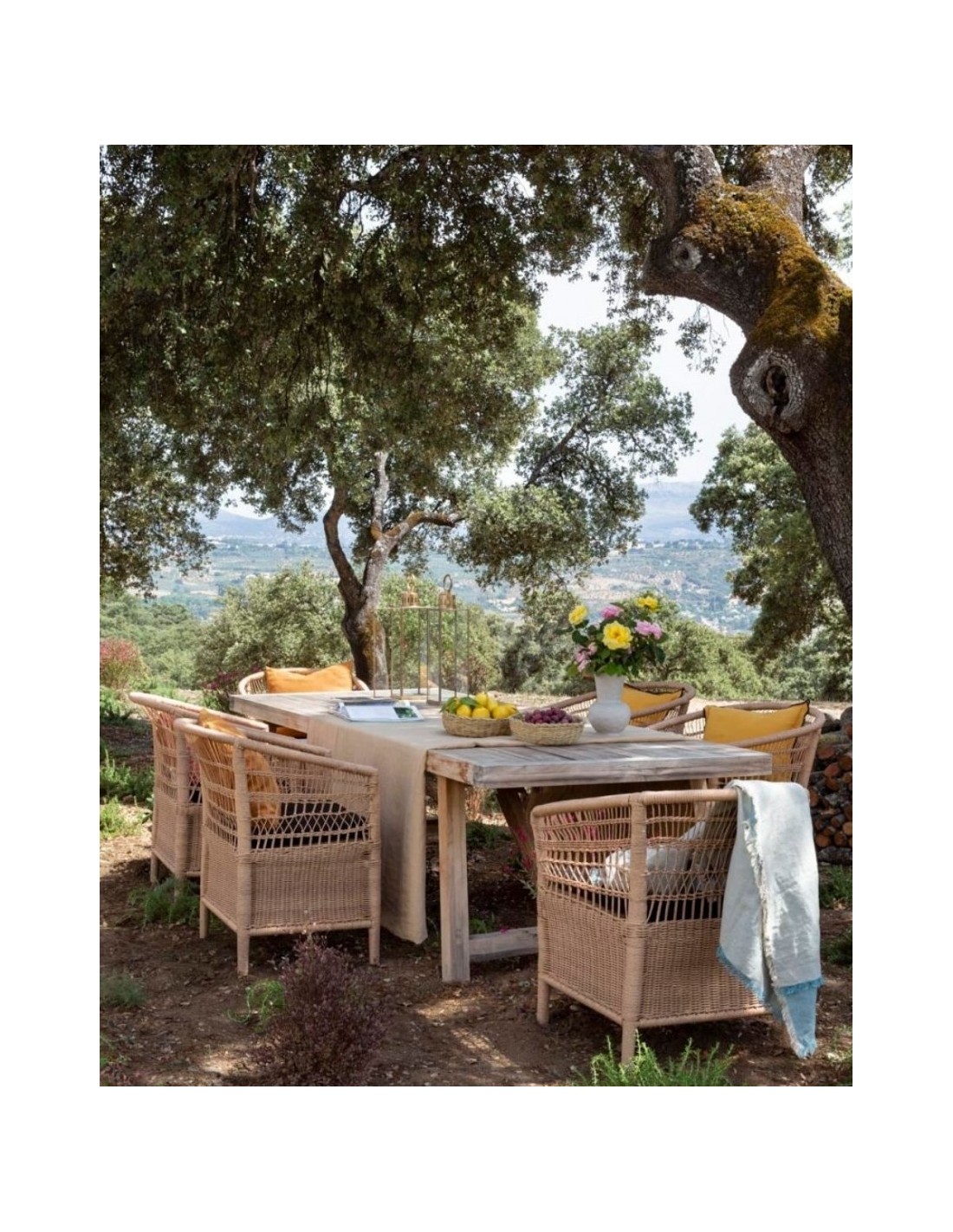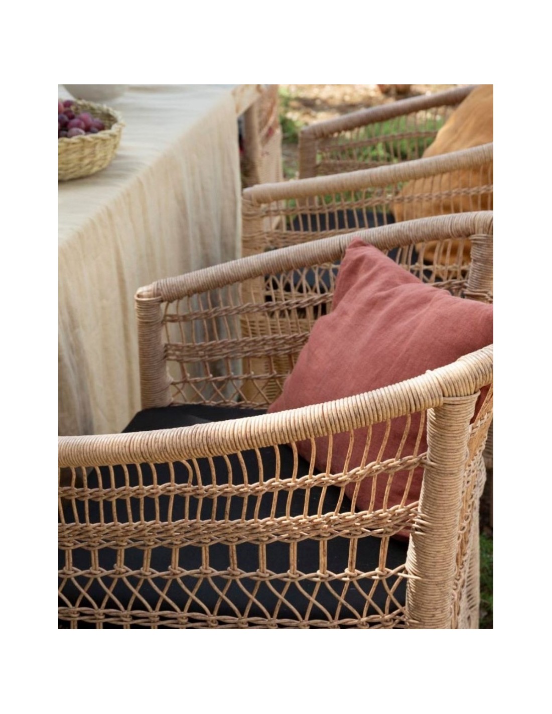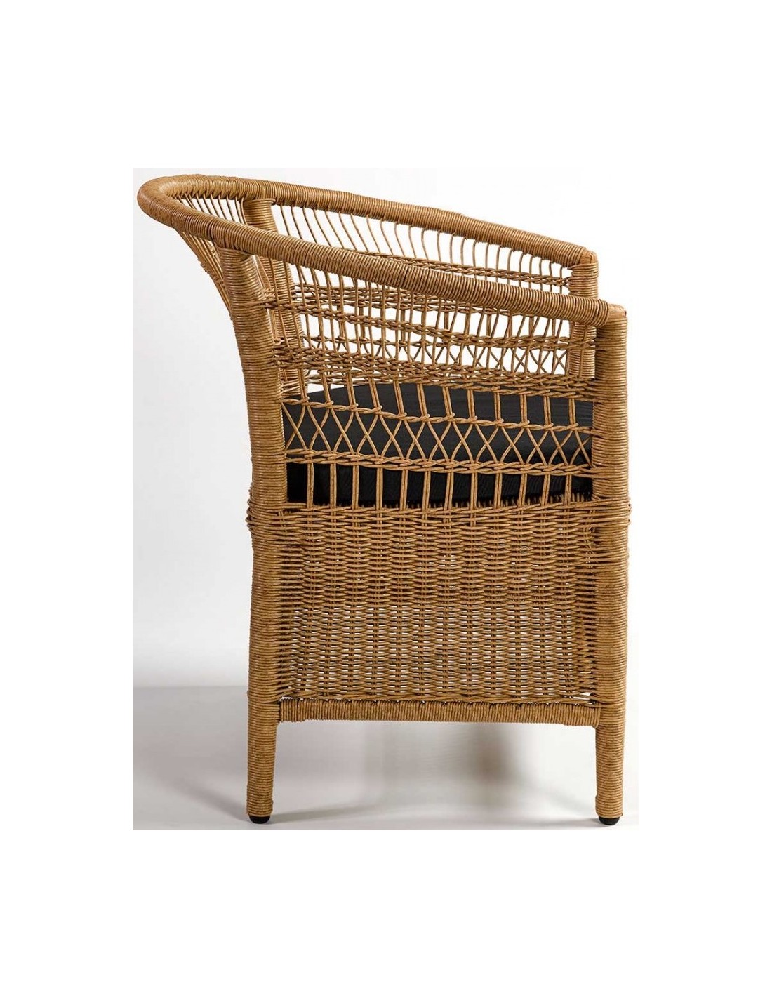 Havestol udført i et design i naturfarvet syntetisk rattan og med hynde i sort polyester. Havestolen måler 79 cm i højden over ryggen og med siddehøjde på 50 cm.