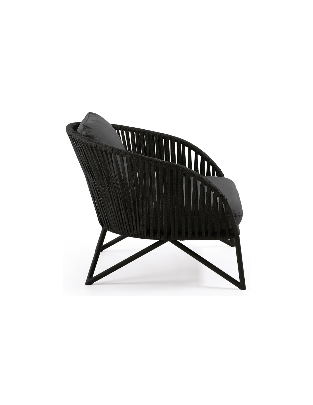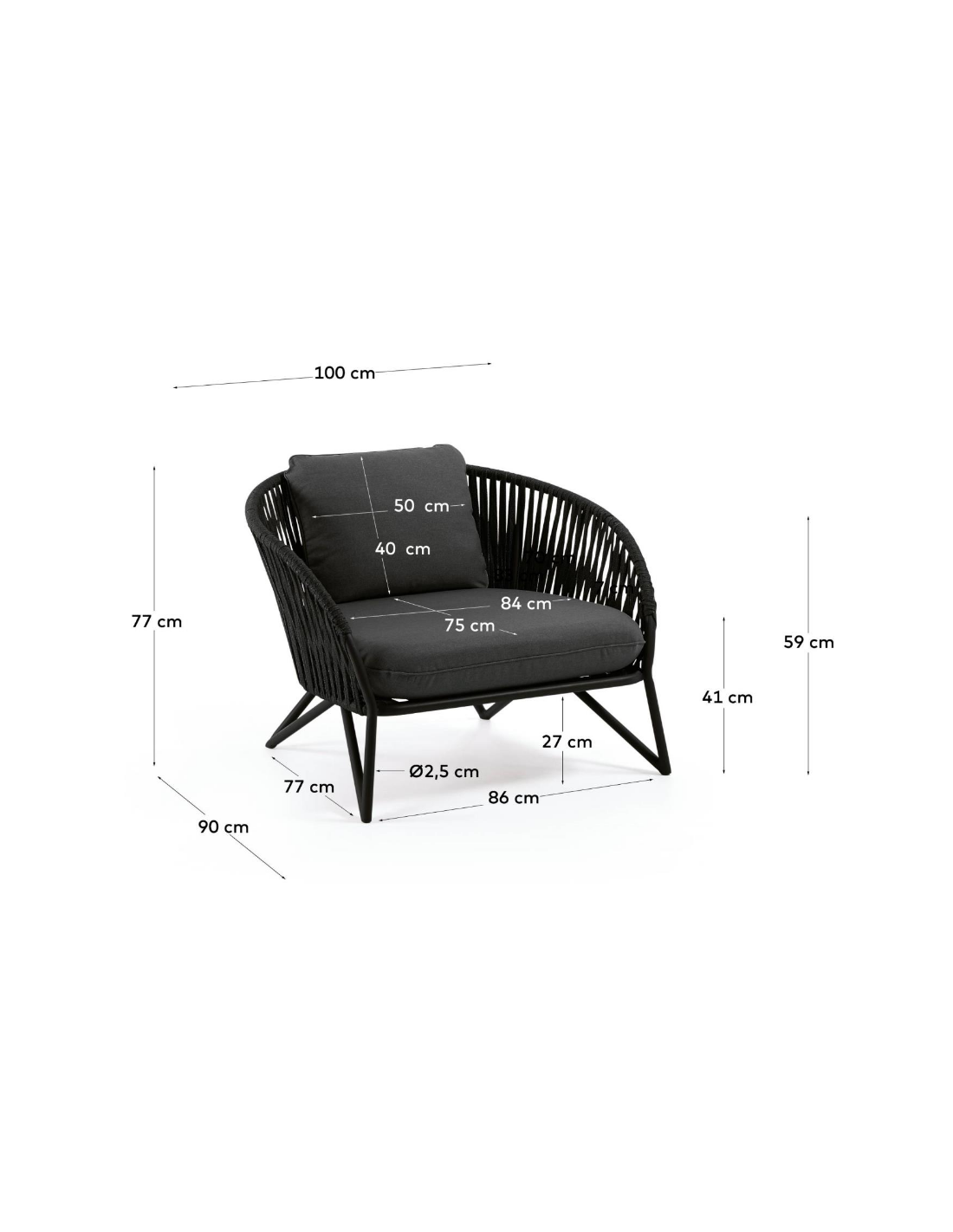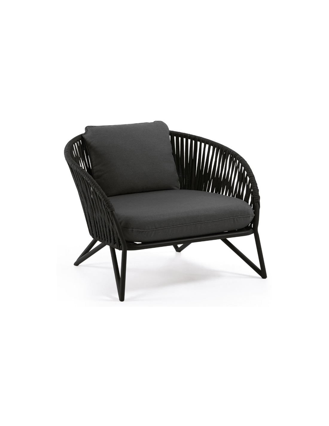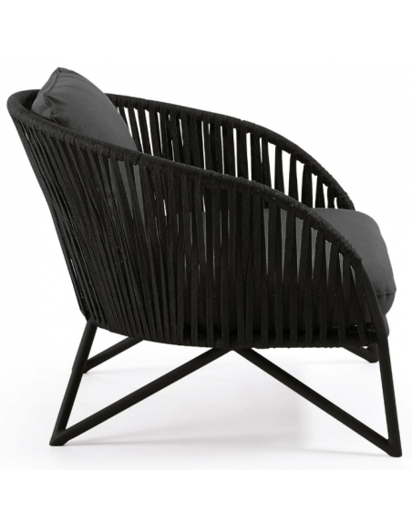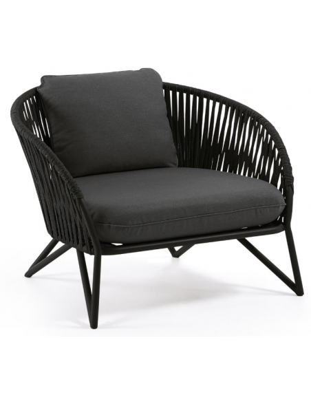 Lounge havestol i et design fra LaForma. Stolen er fremstillet i sortlakeret aluminium og vejrbestandigt reb og med hynder i mørkegrå tekstil. Stolen måler 77 cm i højden over ryggen og 100 x 90 cm i bredde og dybde. Både siddehynde og rygpude medfølger.