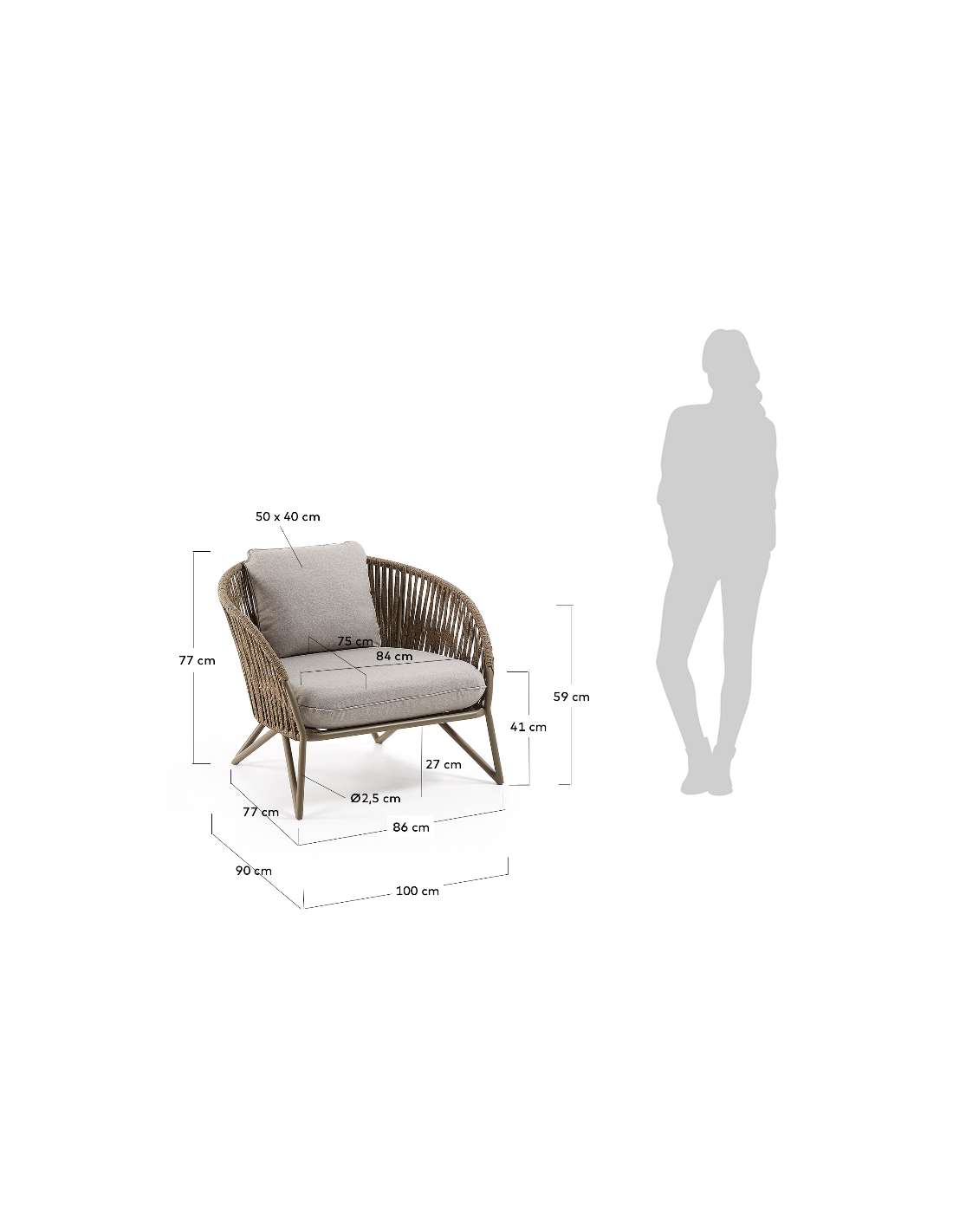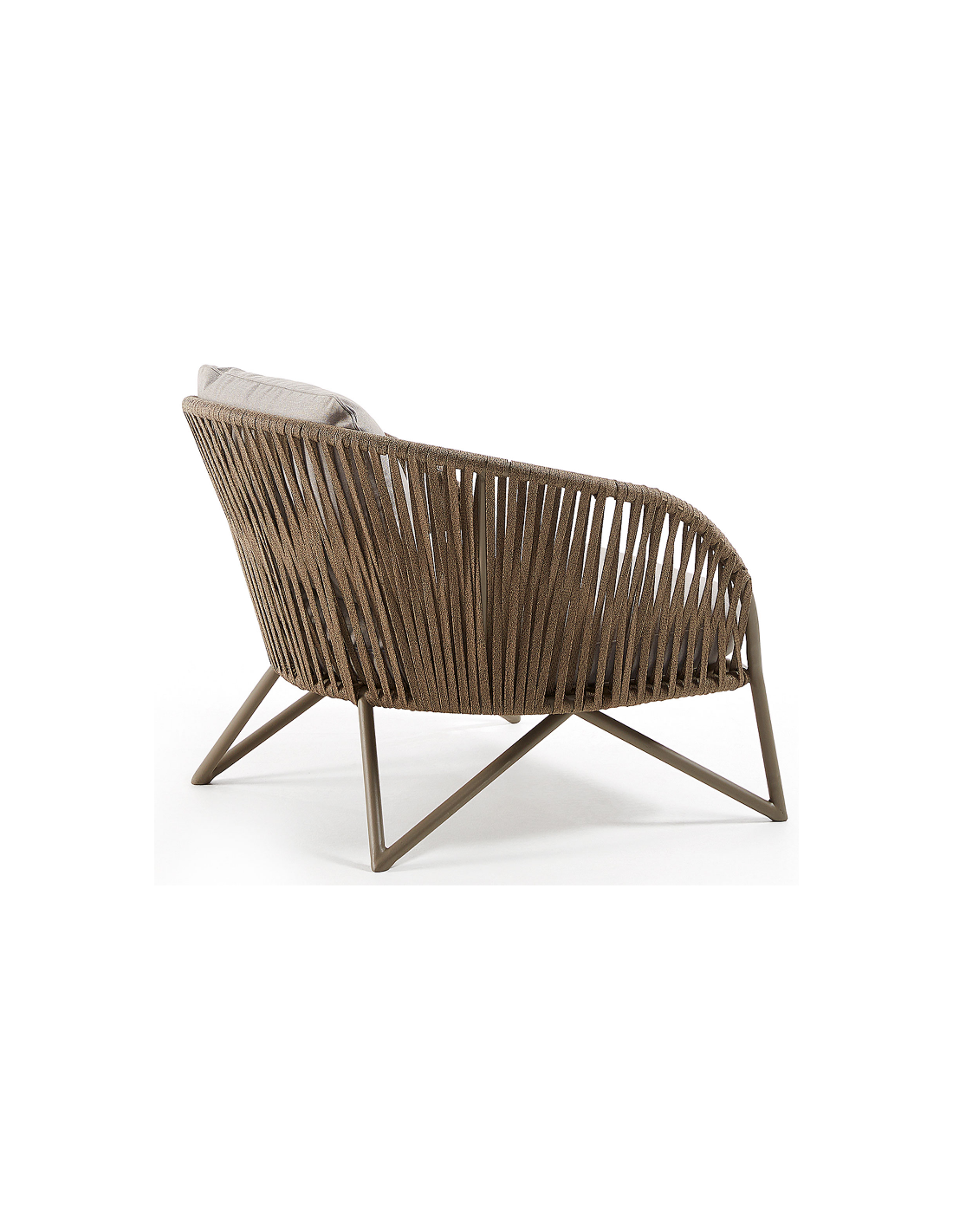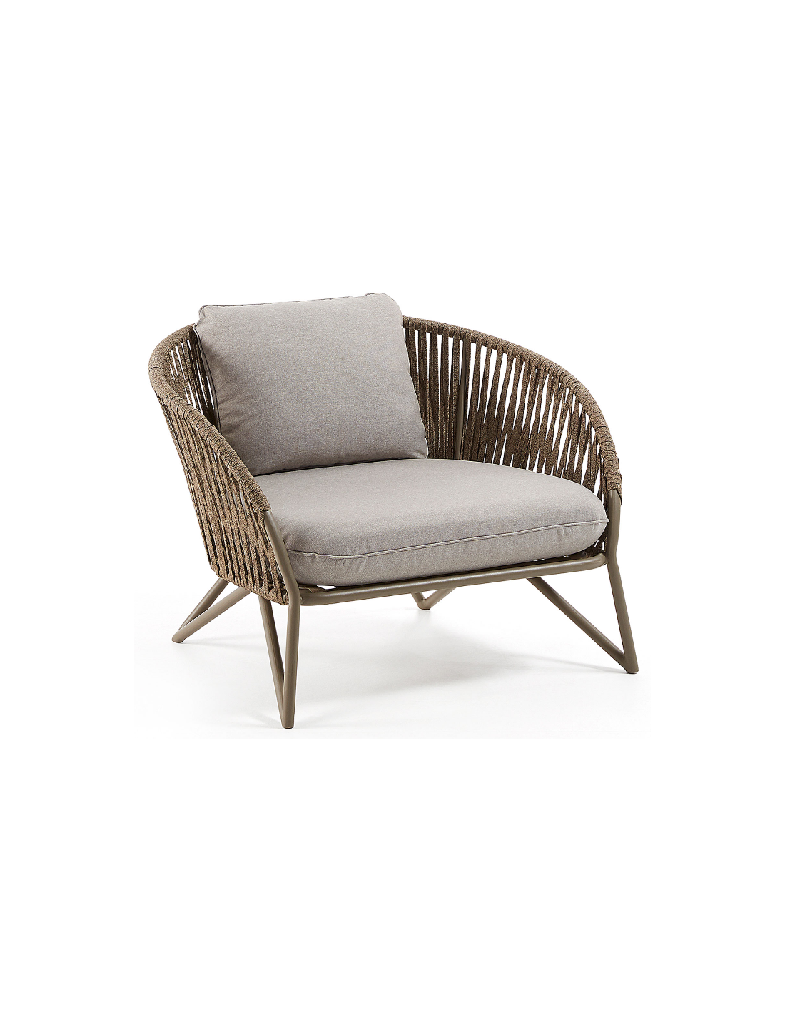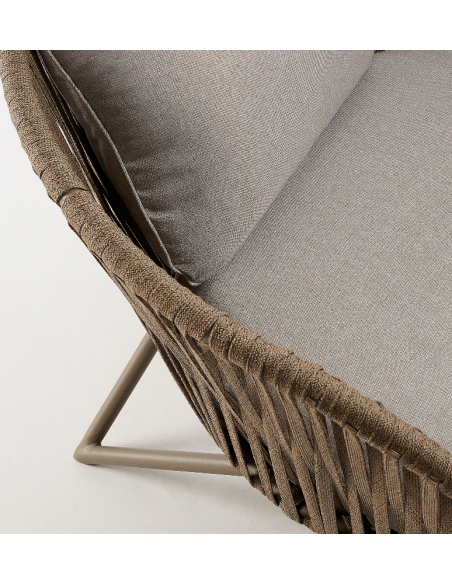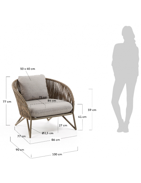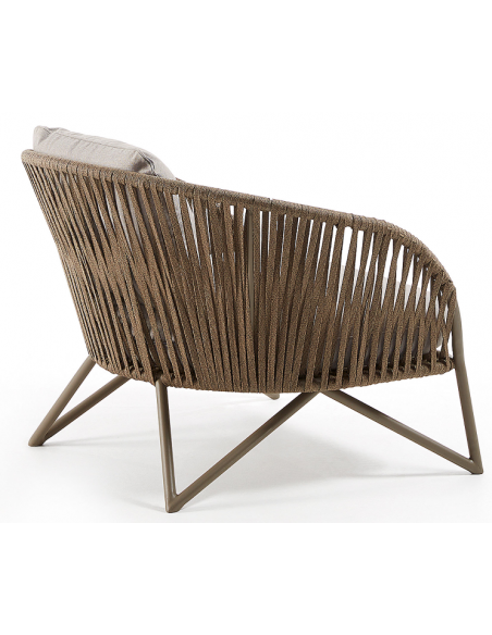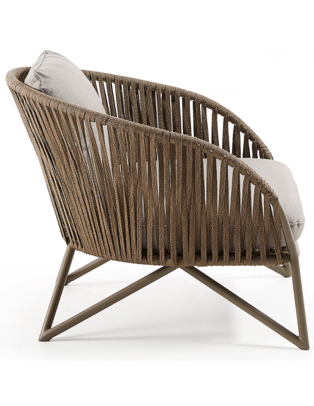 Lounge havestol i et design fra LaForma. Stolen er fremstillet i brunlakeret aluminium og vejrbestandigt reb og med hynder i grå tekstil. Stolen måler 77 cm i højden over ryggen og 100 x 90 cm i bredde og dybde. Både siddehynde og rygpude medfølger.