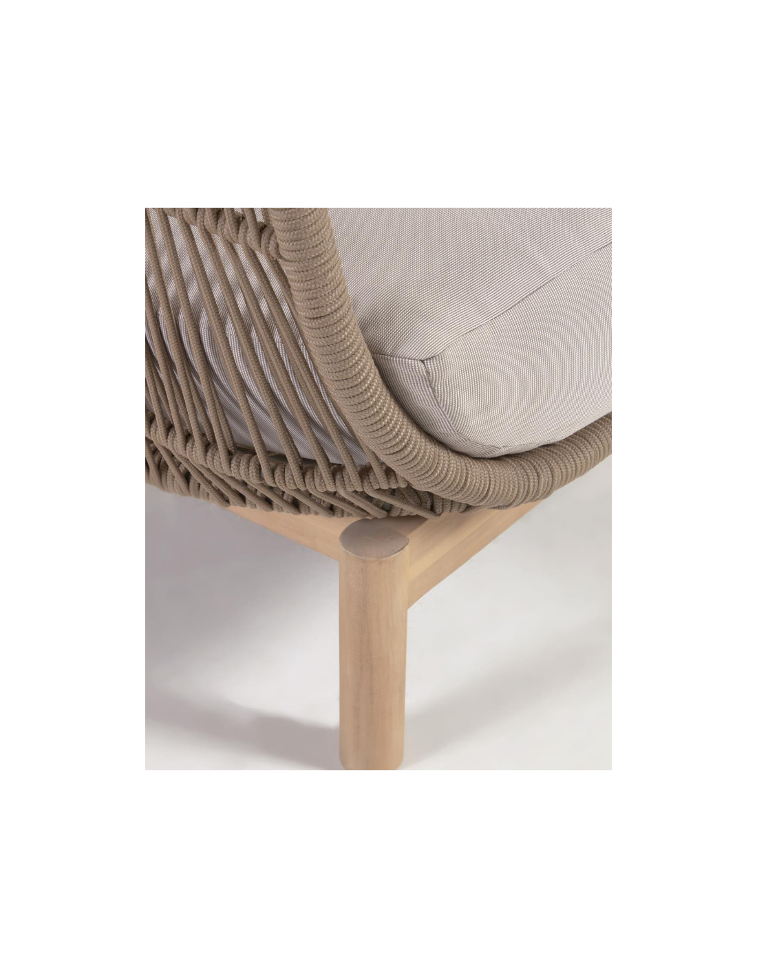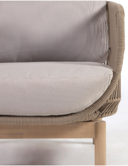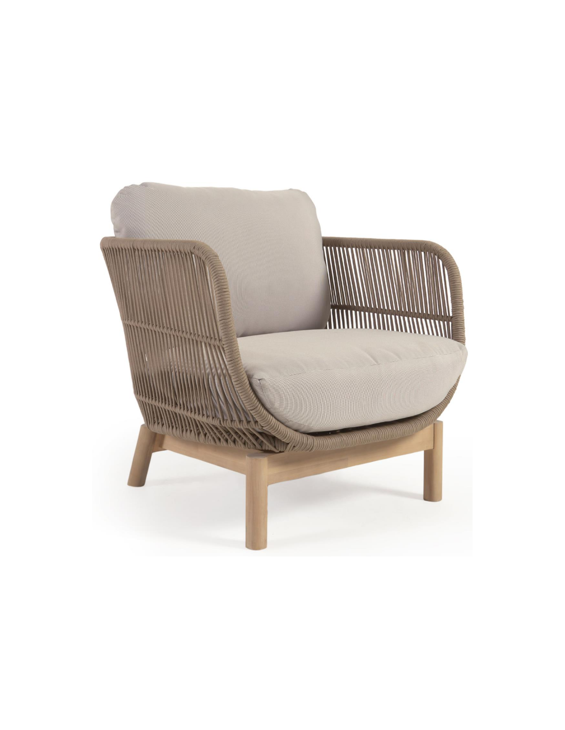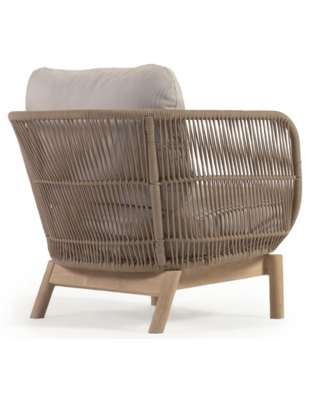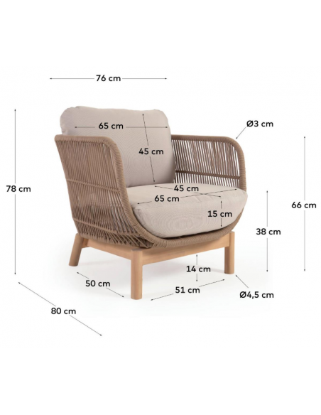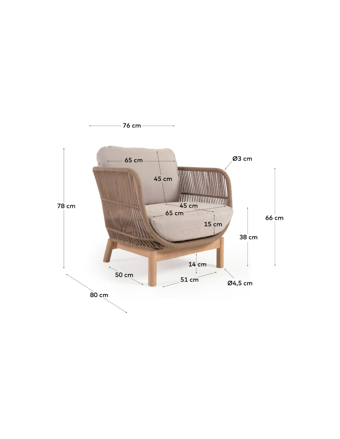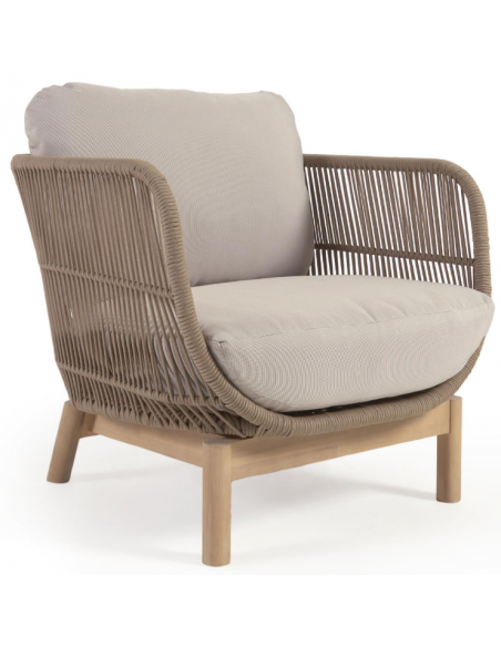 Lounge havestol i et design fra LaForma. Stolen er fremstillet i akacietræ med reb i beige , og hynder i beige tekstil. Stolen måler 78 cm i højden over ryggen og 76 x 80 cm i bredde og dybde. Både siddehynde og rygpude medfølger.