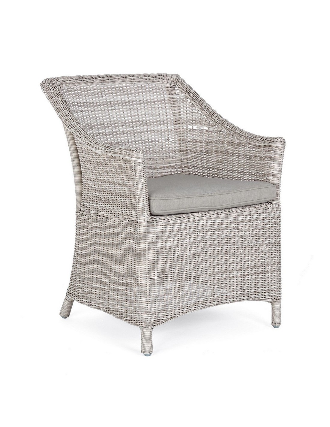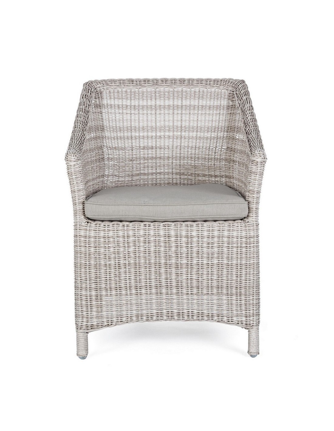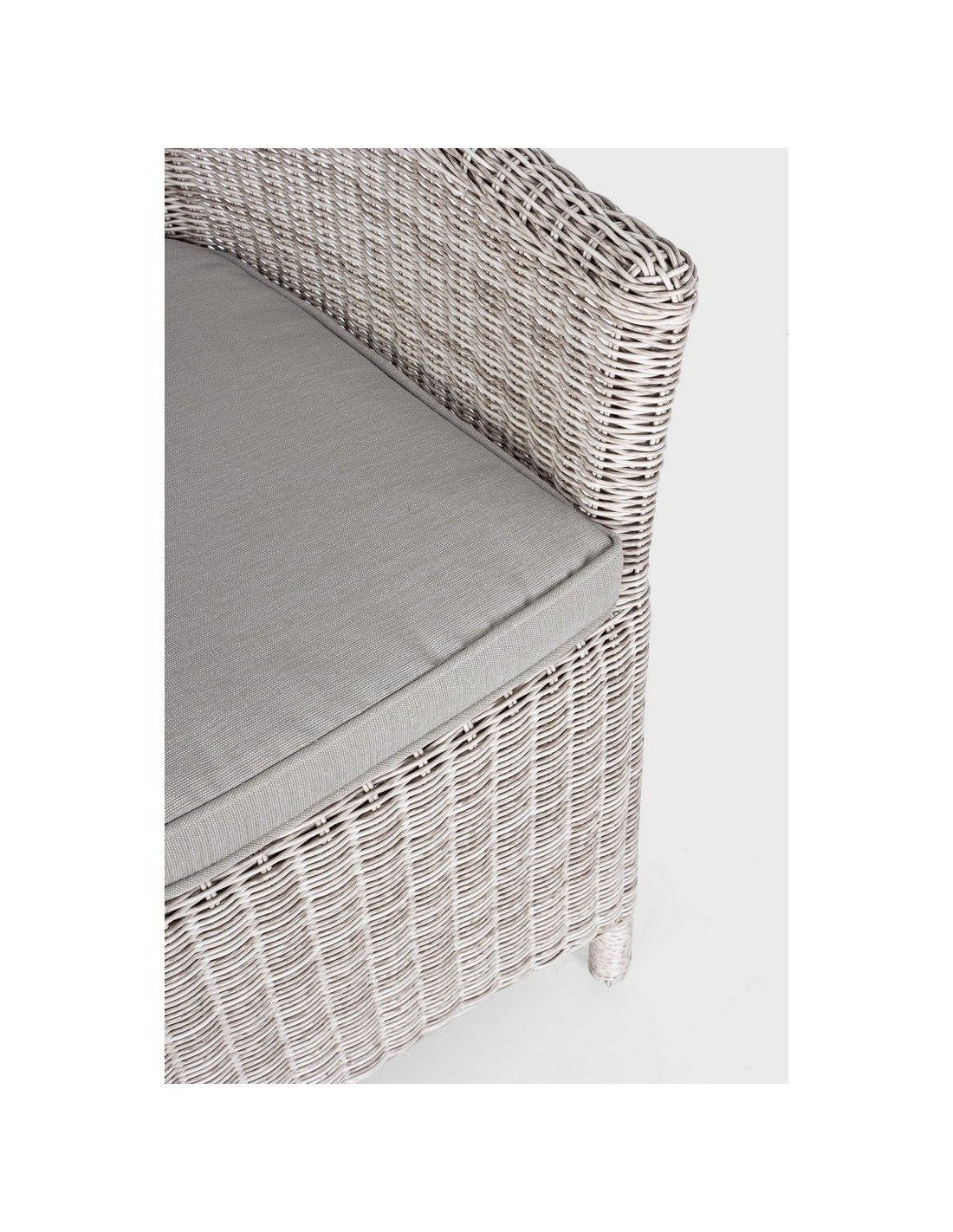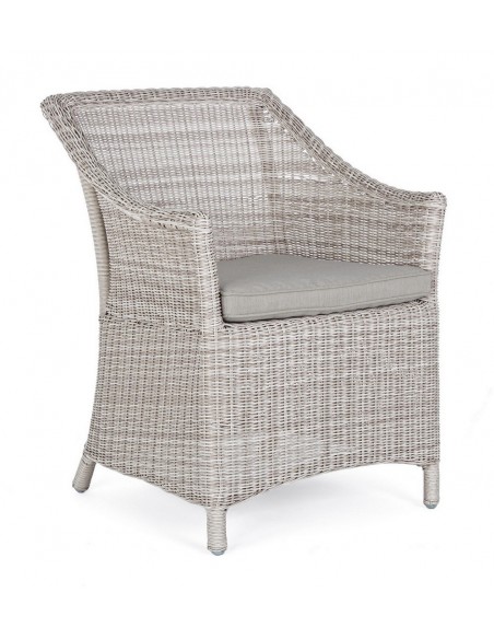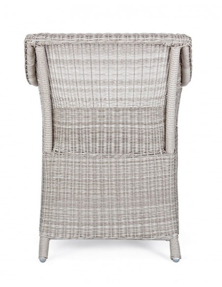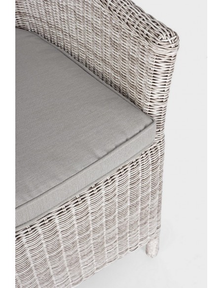 Havestol i et design af gråhvid syntetisk rattan og med hynde i grå olefin. Stolen måler 84,5 cm i højden over ryggen.