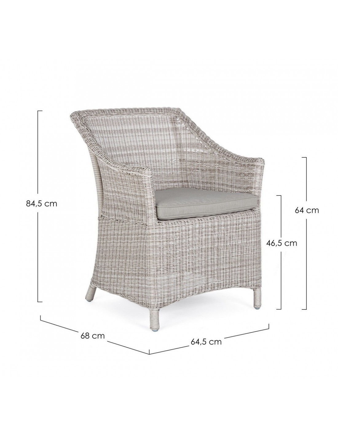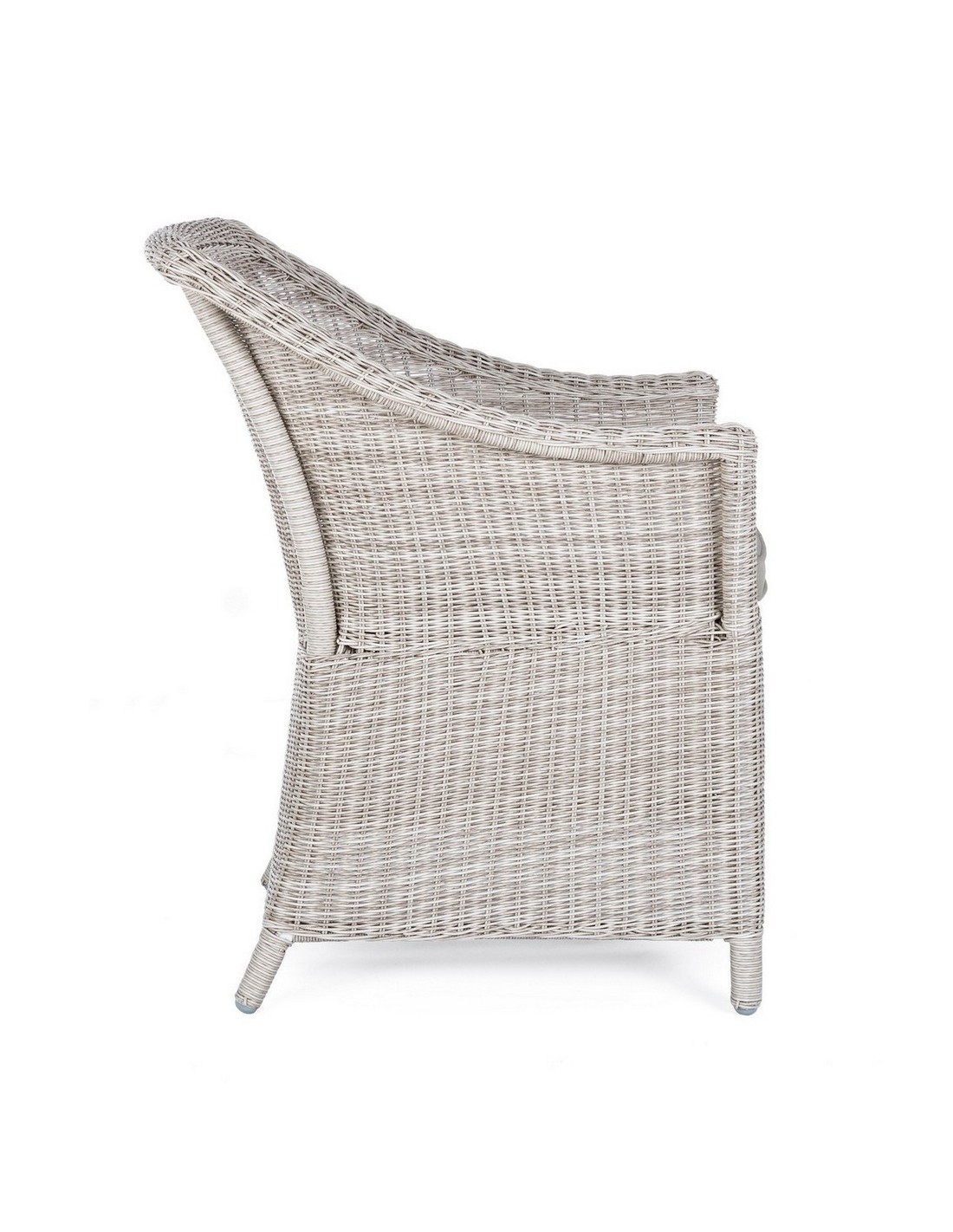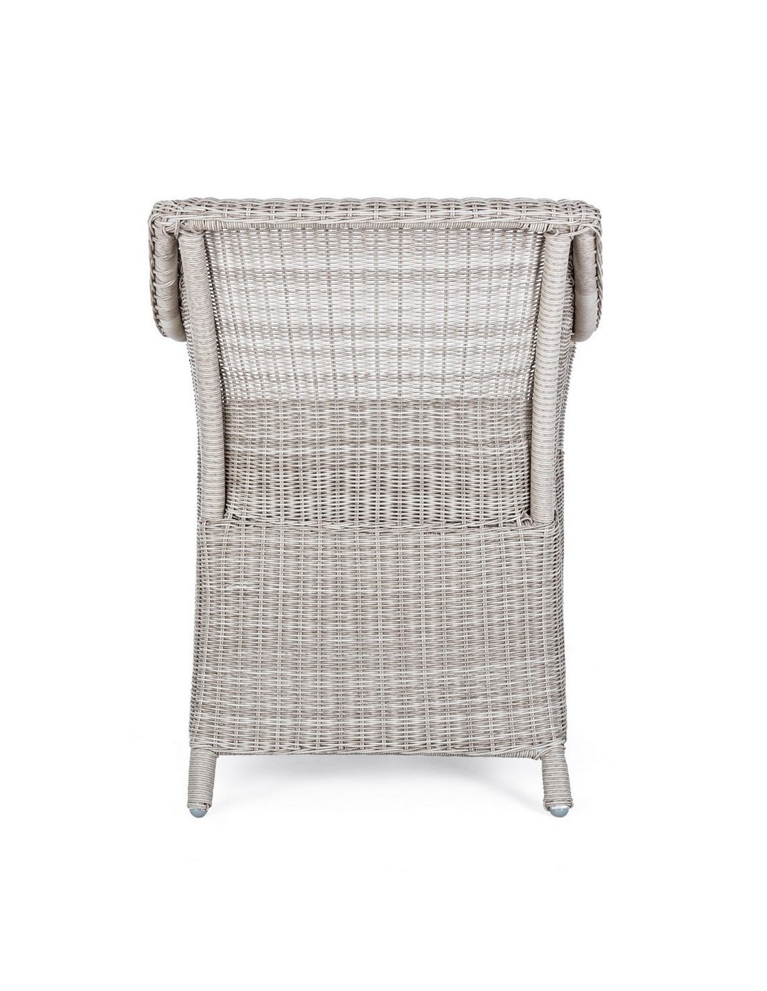 Havestol i et design af gråhvid syntetisk rattan og med hynde i grå olefin. Stolen måler 84,5 cm i højden over ryggen.