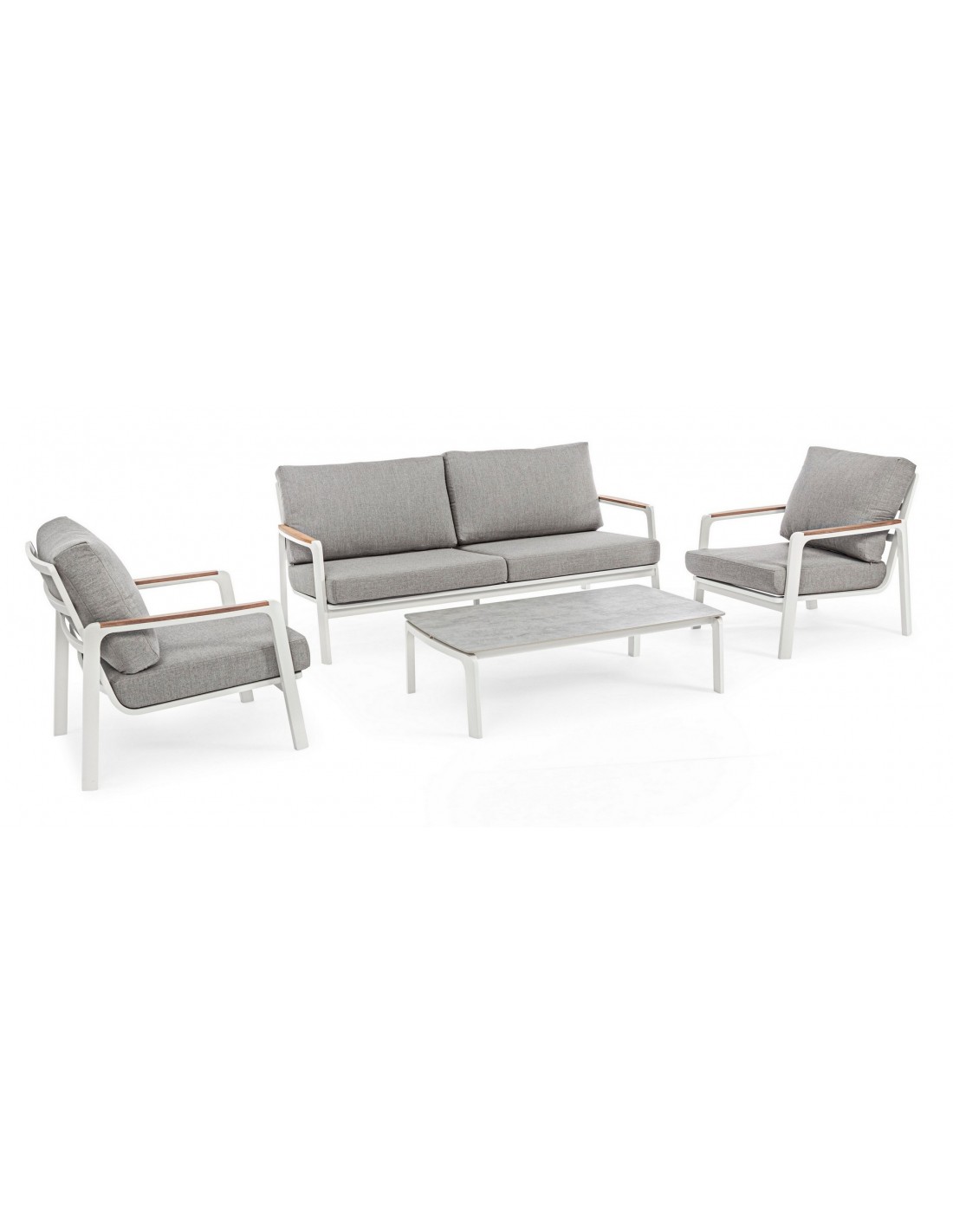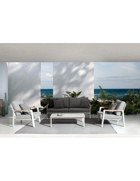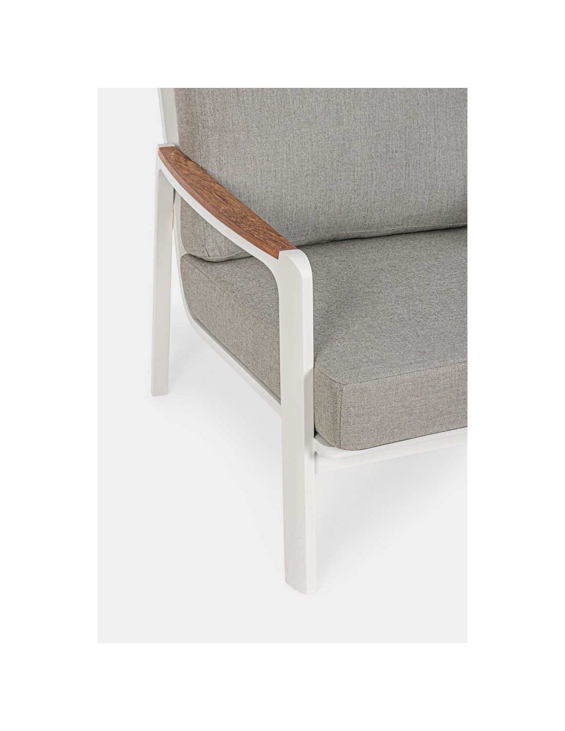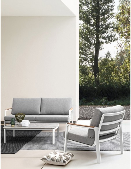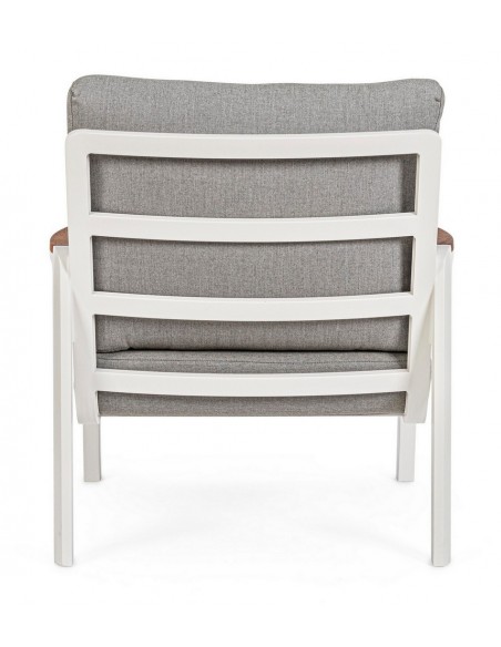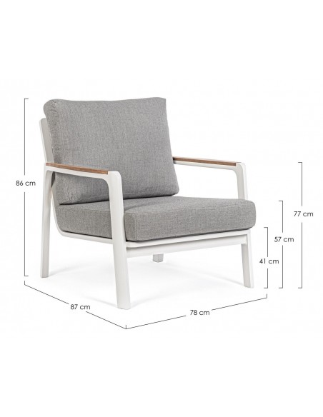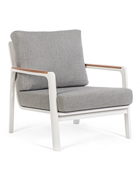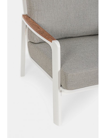 Lounge havestol i et design af hvid pulverlakeret aluminium med armlæn i teaktræ og hynder i lysegrå akryl. Stolen måler 86 cm i højden over ryggen.