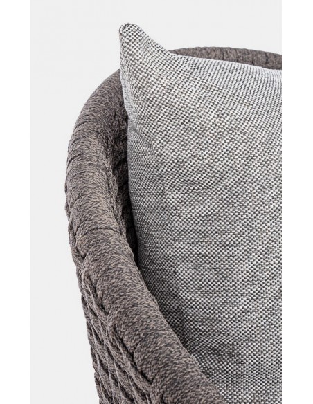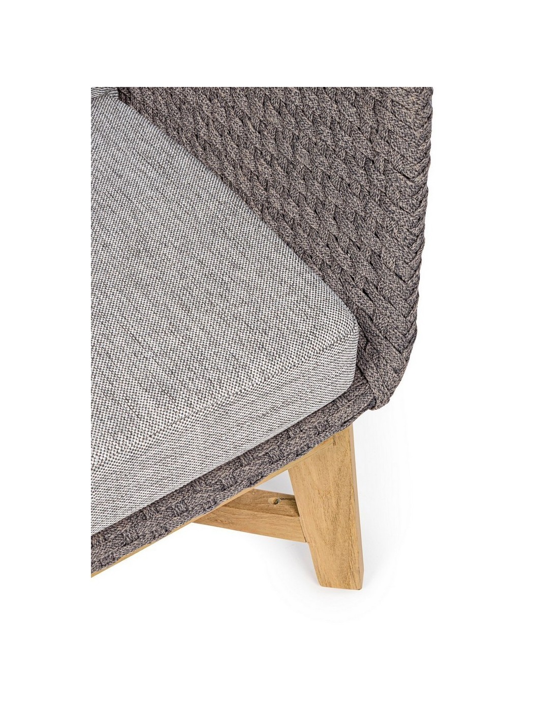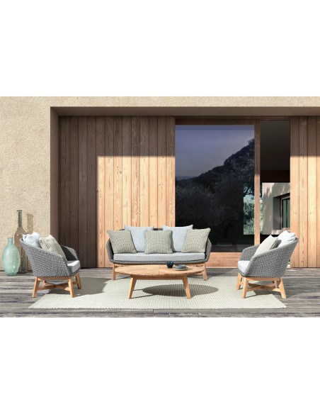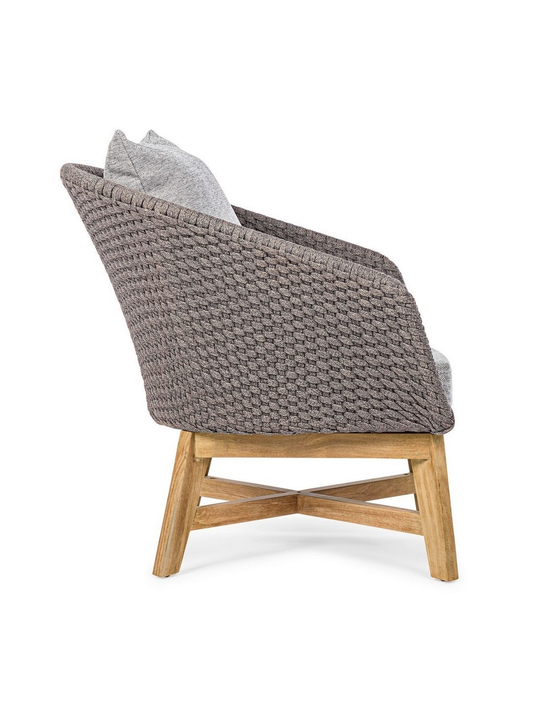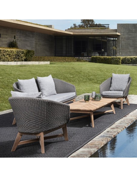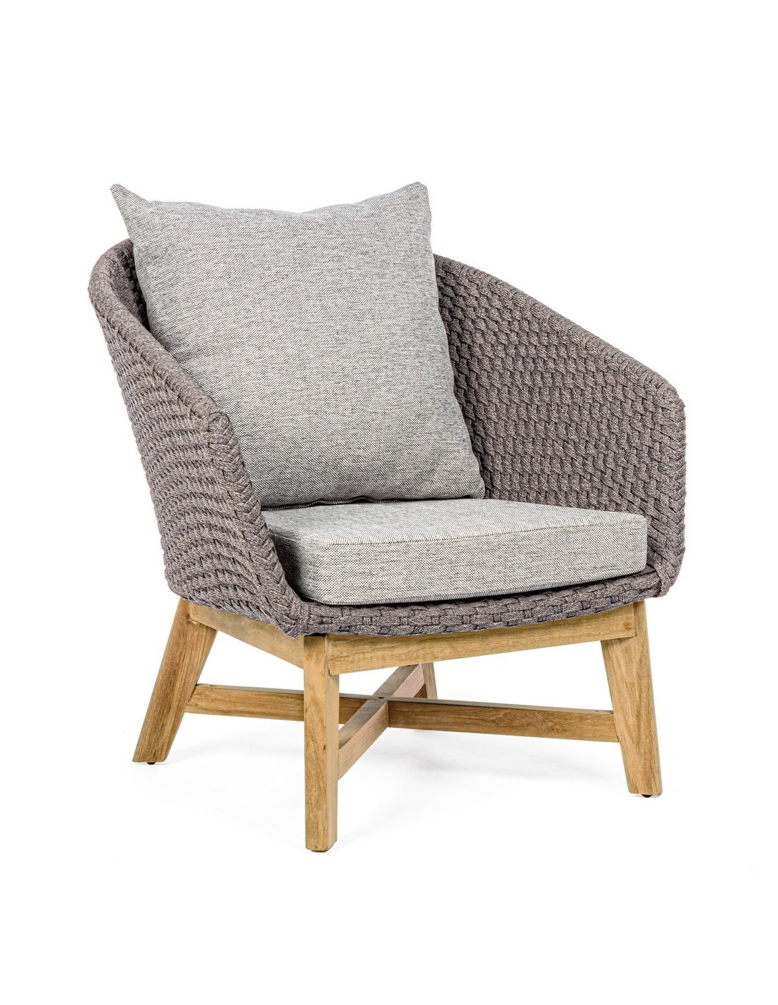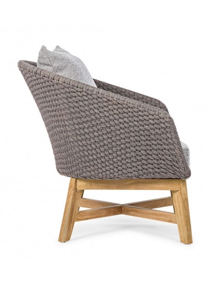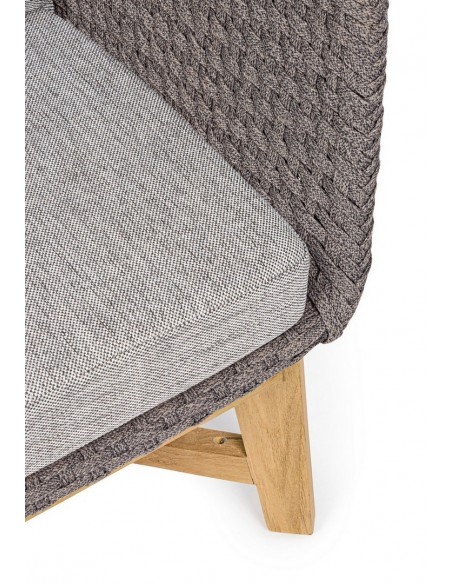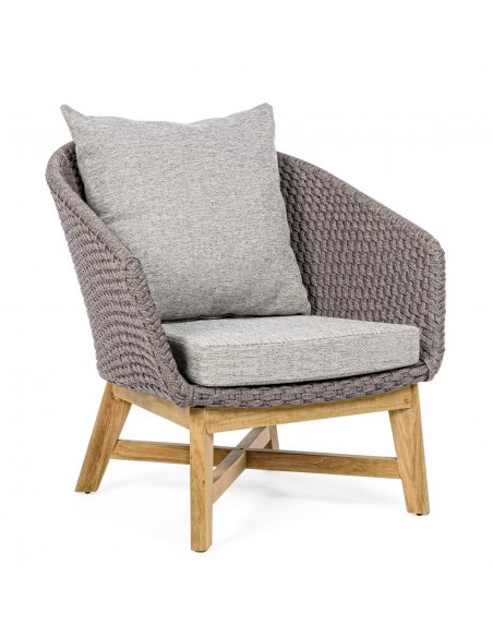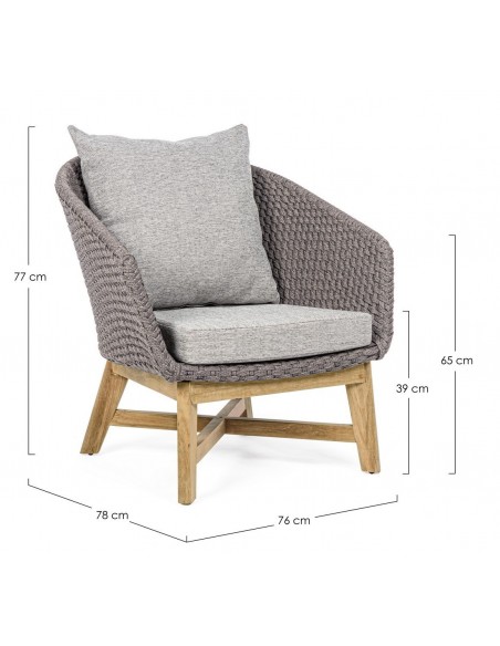 Havestol udført i et design af lakeret teaktræ og ramme i aluminium og med sæde i vandafvisende polypropylene. Stol og hynder er UV-beskyttet med aftageligt betræk på hynderne. Stolen måler 77 cm i højden over ryggen og 76 cm i bredden.