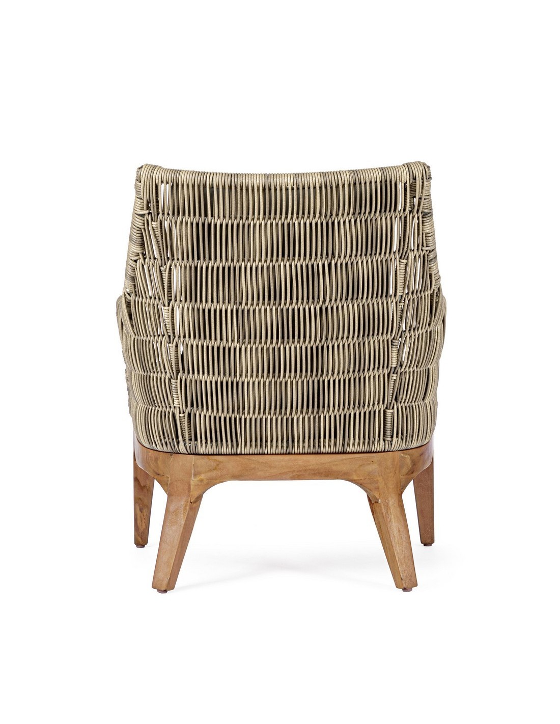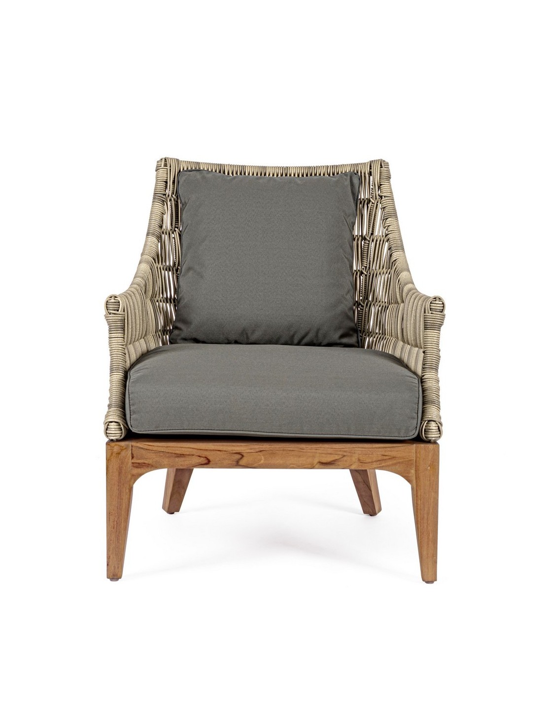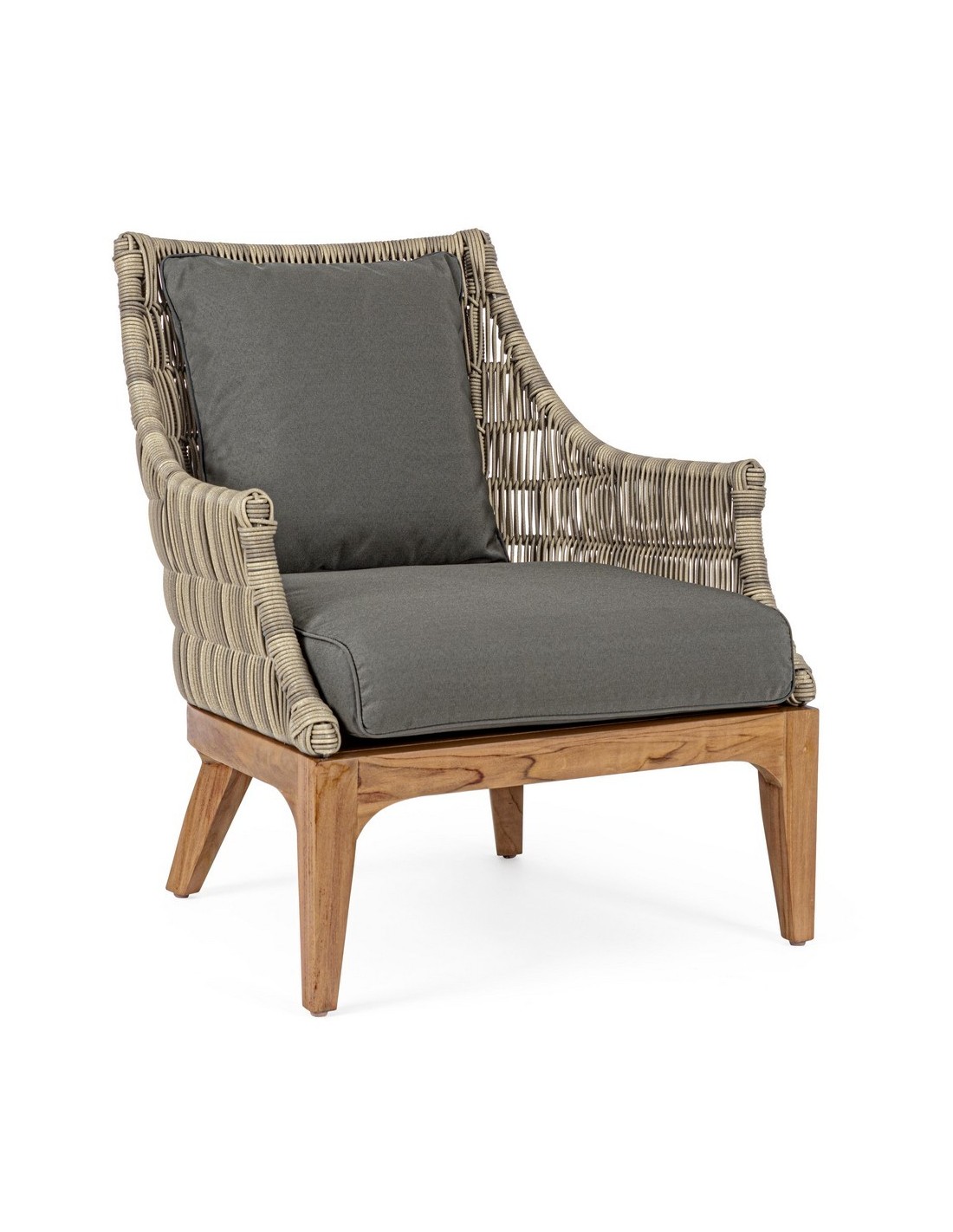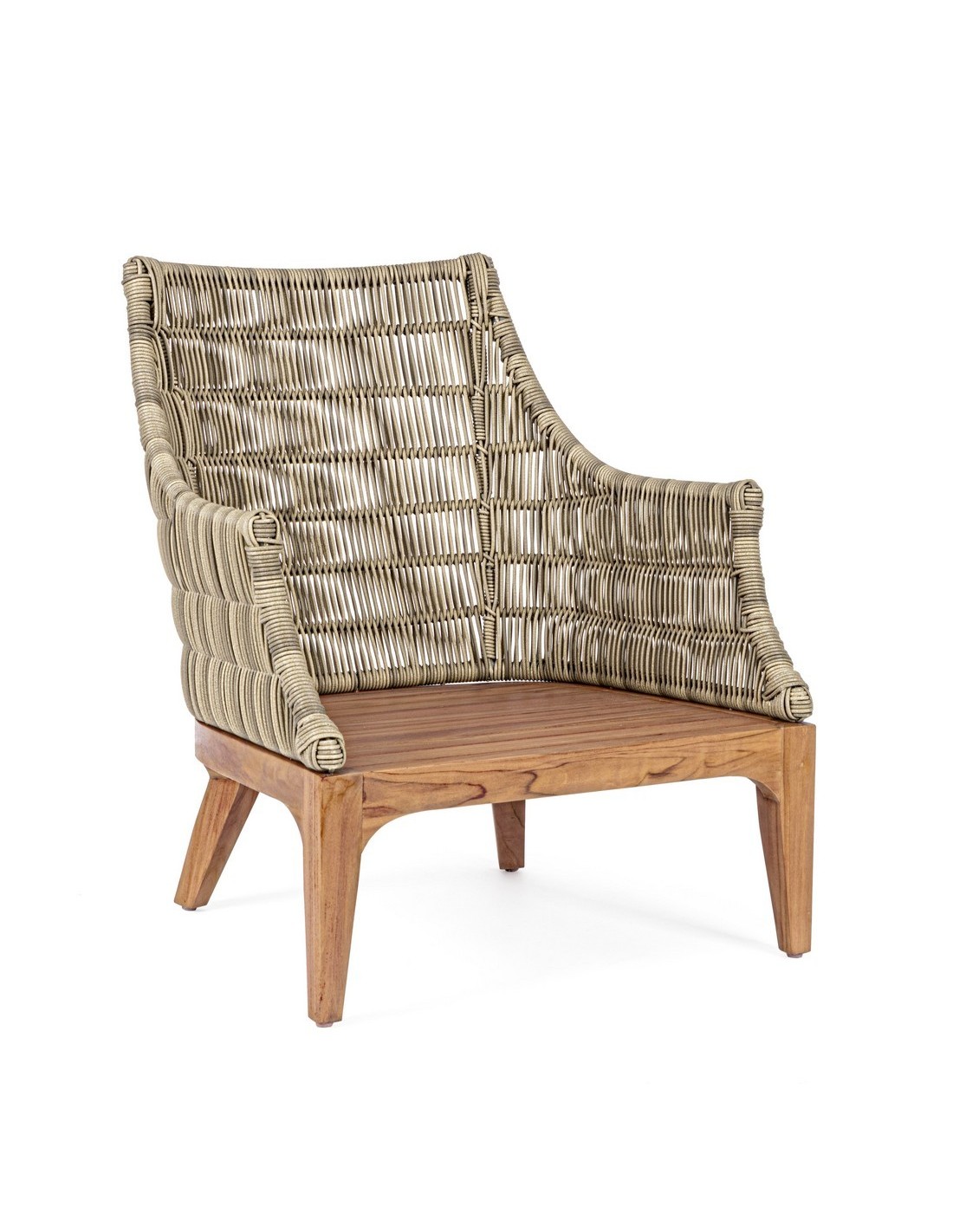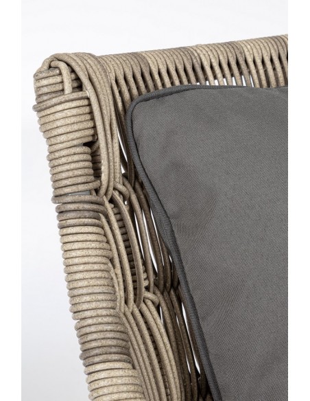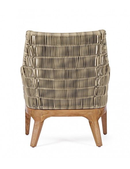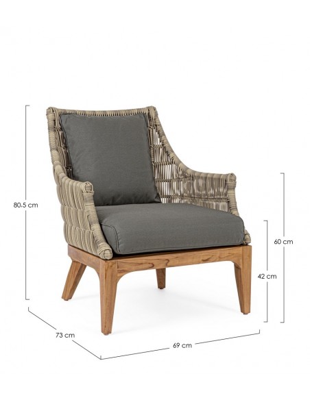 Lounge havestol udført i et design af teaktræ og syntetisk rattan. Dertil hynder i olefin med aftagelige betræk. Stolen måler 81 cm i bredden. Møblet tåler regnvejr, men hynder og puder anbefaler vi dog at opbevare indendørs, når møblet ikke er i brug.